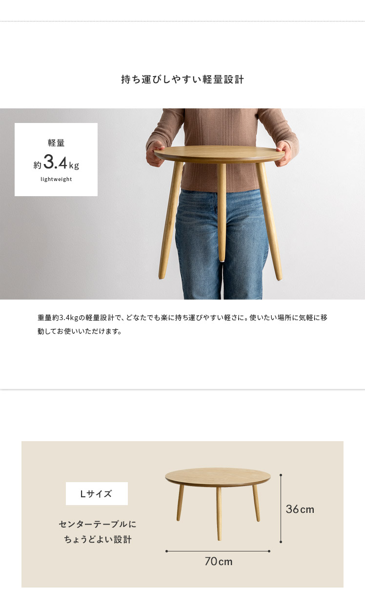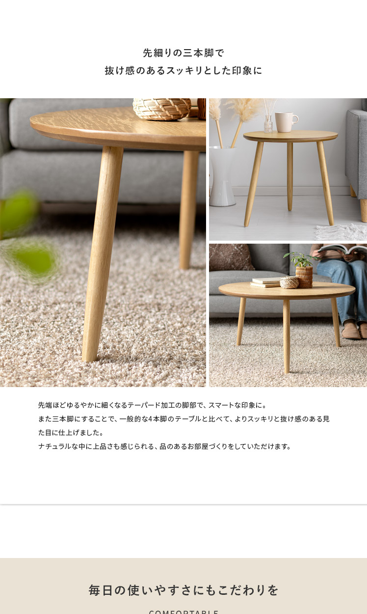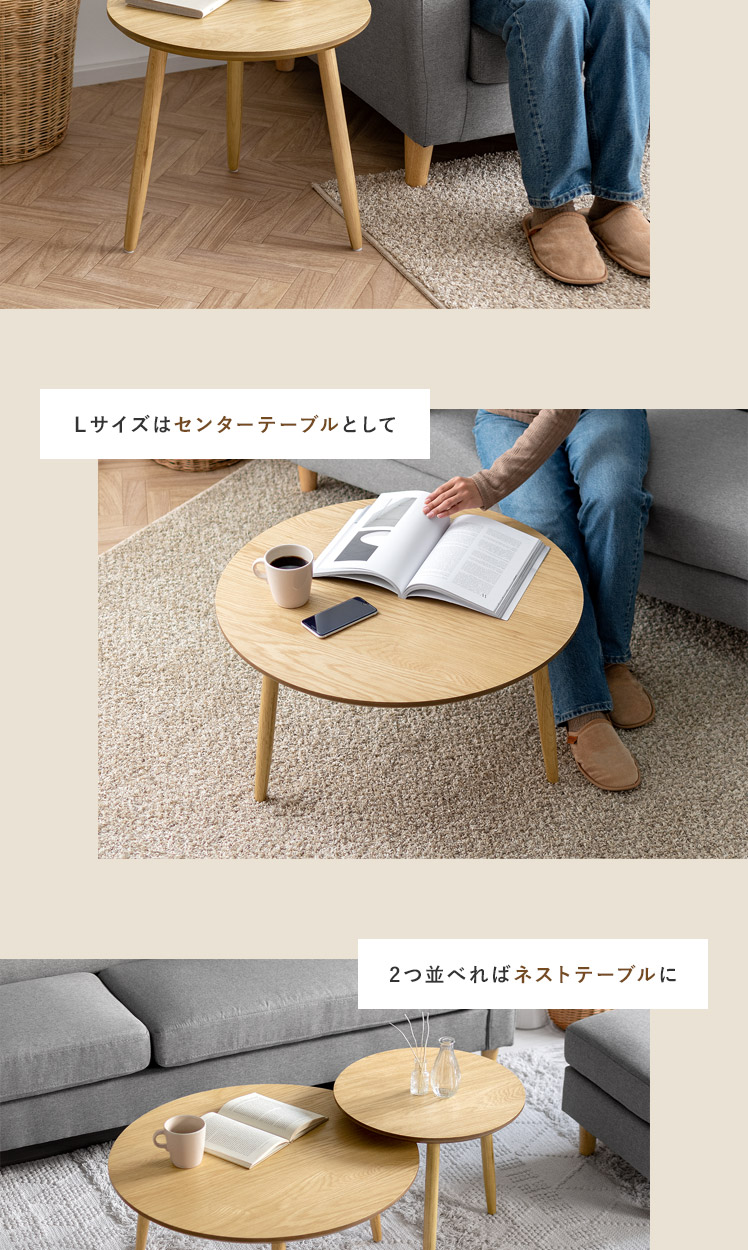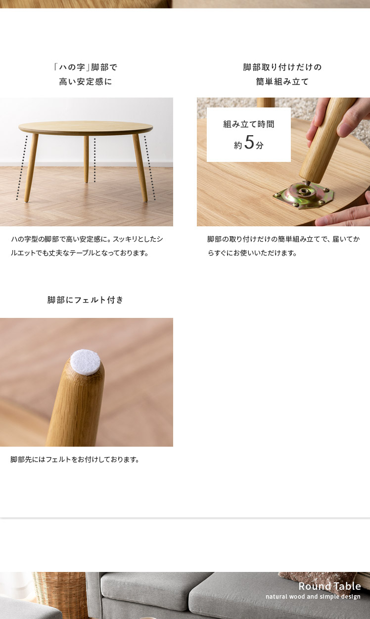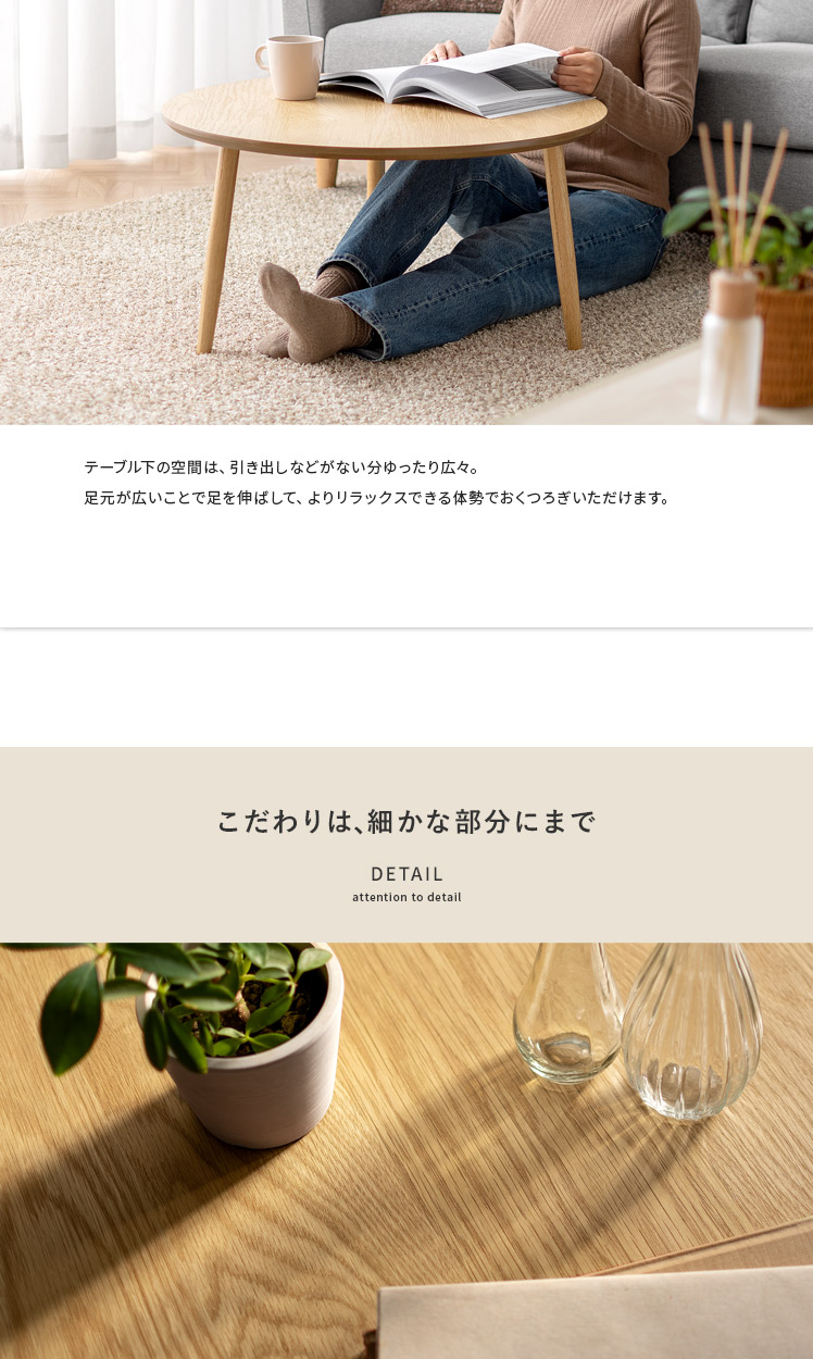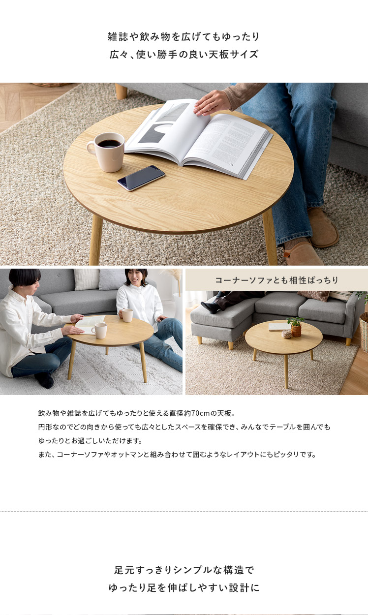天然木ラウンドテーブル Sサイズ/木目が美しいオーク材を贅沢に使用したラウンドテーブル。天然木ならではの温かみを感じる表情豊かな木目が、プリント紙では味わえない上質な空間を演出いたします。木目の美しさを存分に感じられるよう、デザインはシンプルに。円形の天板に、ほっそりとした脚部を組み合わせた端正な見た目は、木目の温もりを引き立てつつ、スマートな佇まいです。