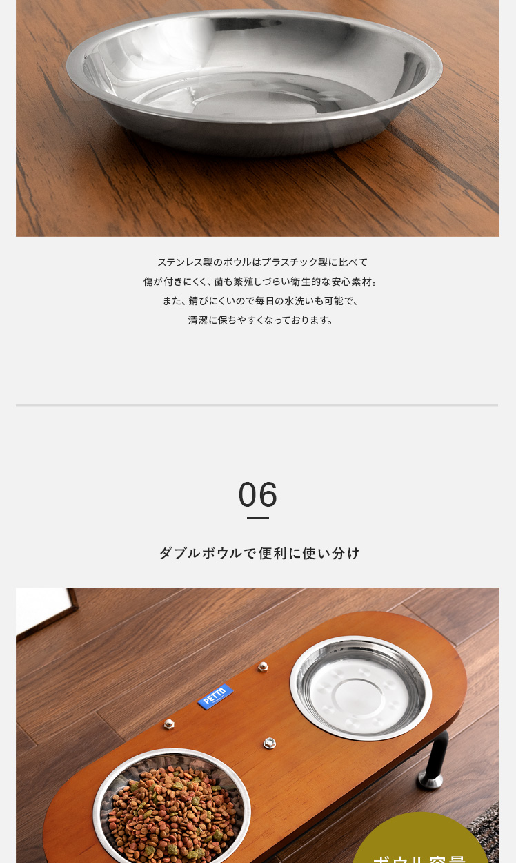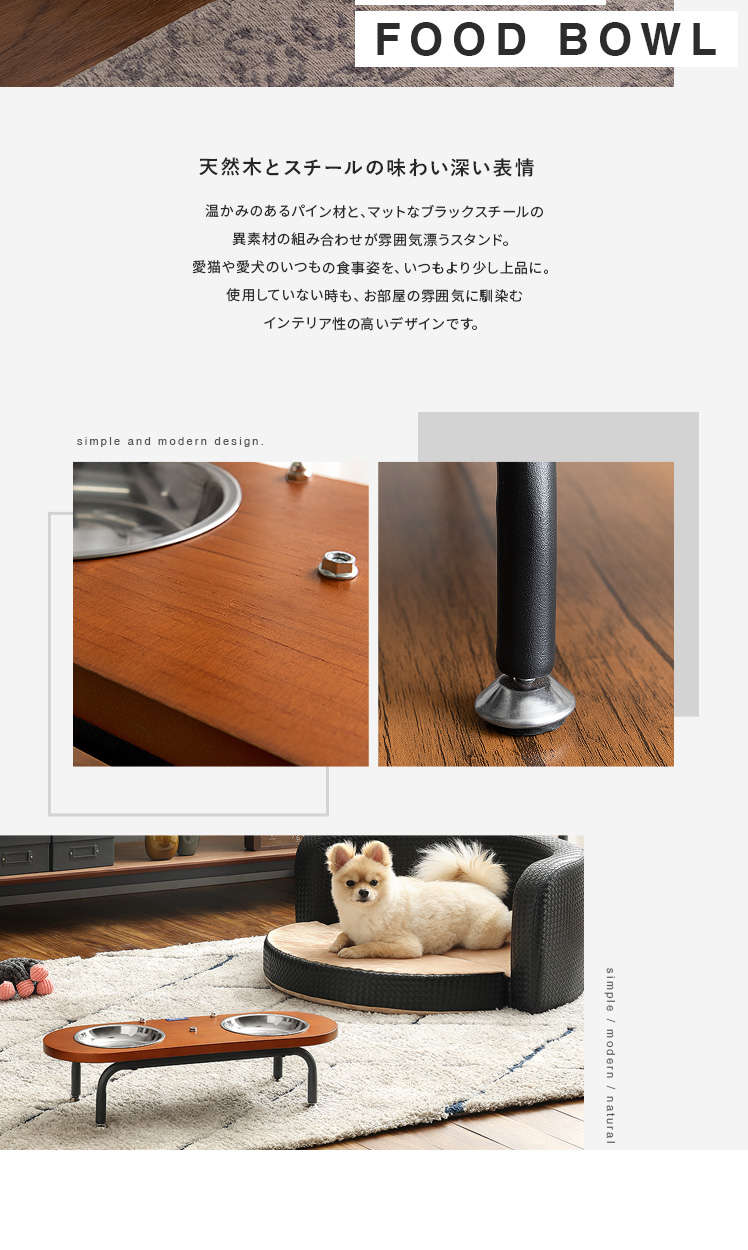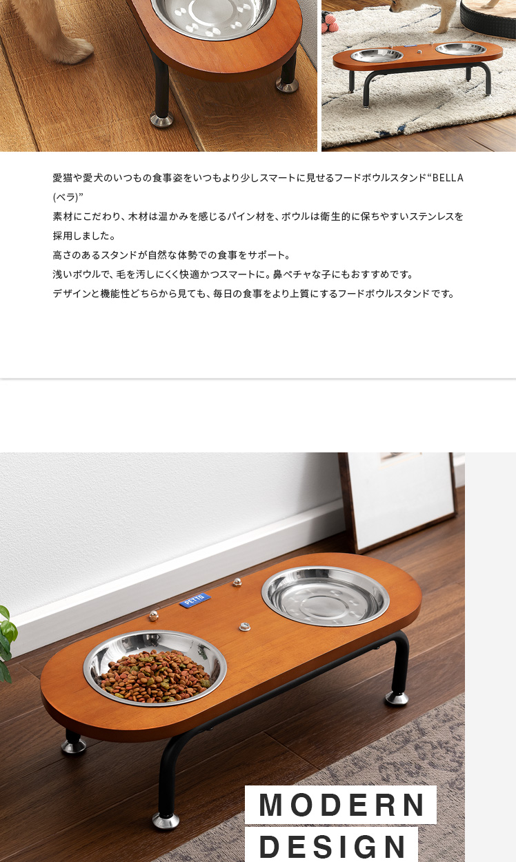 ペット用フードボウルスタンド BELLA 〔ベラ〕/愛猫や愛犬のいつもの食事姿をいつもより少しスマートに見せるフードボウルスタンド“BELLA (ベラ)”素材にこだわり、木材は温かみを感じるパイン材を、ボウルは衛生的に保ちやすいステンレスを採用しました。高さのあるスタンドが自然な体勢での食事をサポート。浅いボウルで、毛を汚しにくく快適かつスマートに。鼻ペチャな子にもおすすめです。デザインと機能性どちらから見ても、毎日の食事をより上質にするフードボウルスタンドです。