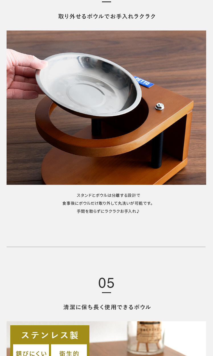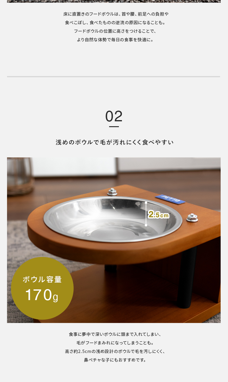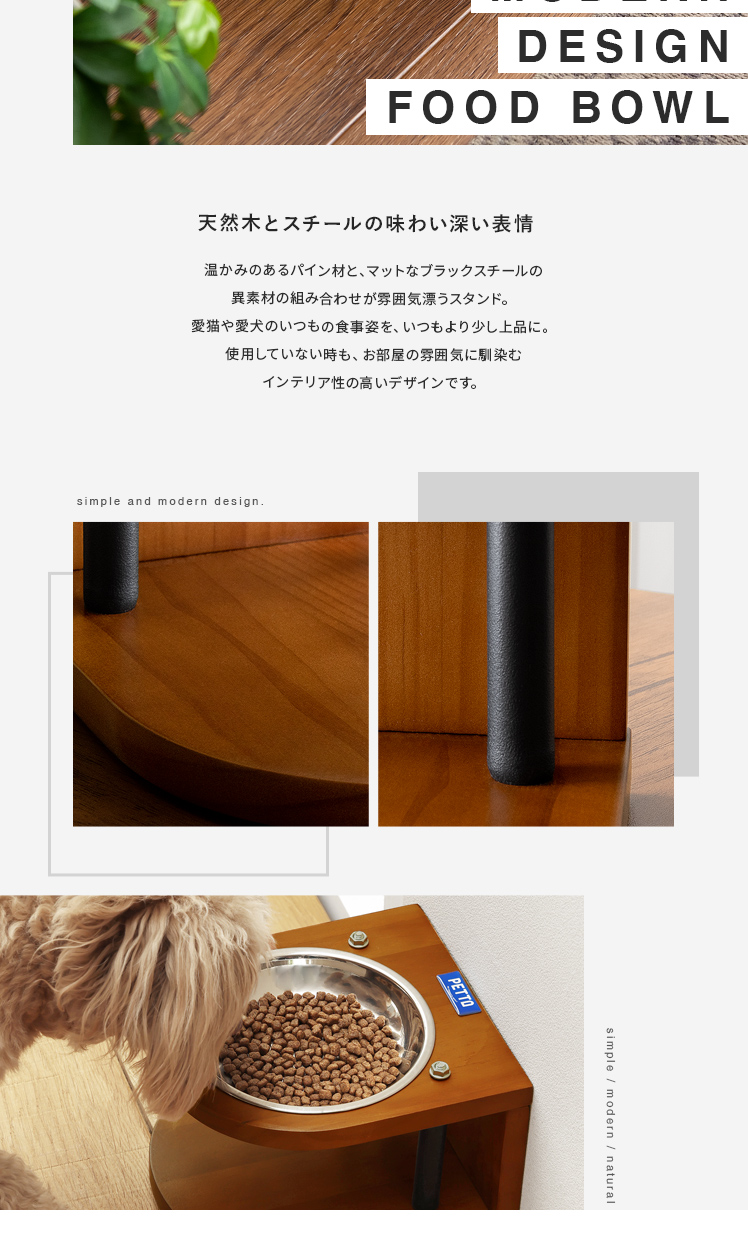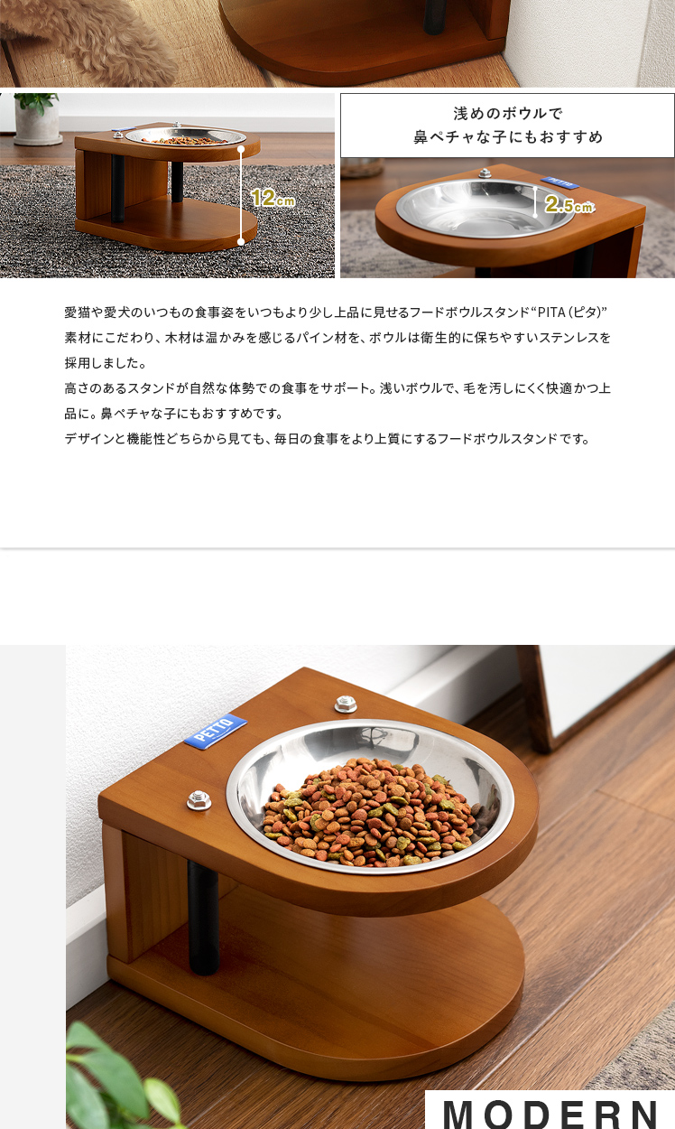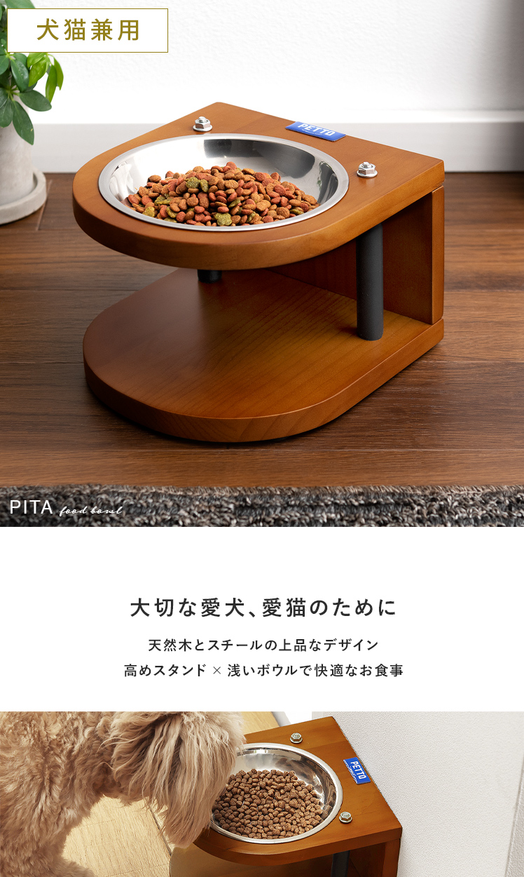 ペット用フードボウルスタンド PITA 〔ピタ〕 /愛猫や愛犬のいつもの食事姿をいつもより少し上品に見せるフードボウルスタンド“PITA(ピタ)”素材にこだわり、木材は温かみを感じるパイン材を、ボウルは衛生的に保ちやすいステンレスを採用しました。高さのあるスタンドが自然な体勢での食事をサポート。浅いボウルで、毛を汚しにくく快適かつ上品に。鼻ペチャな子にもおすすめです。デザインと機能性どちらから見ても、毎日の食事をより上質にするフードボウルスタンドです。