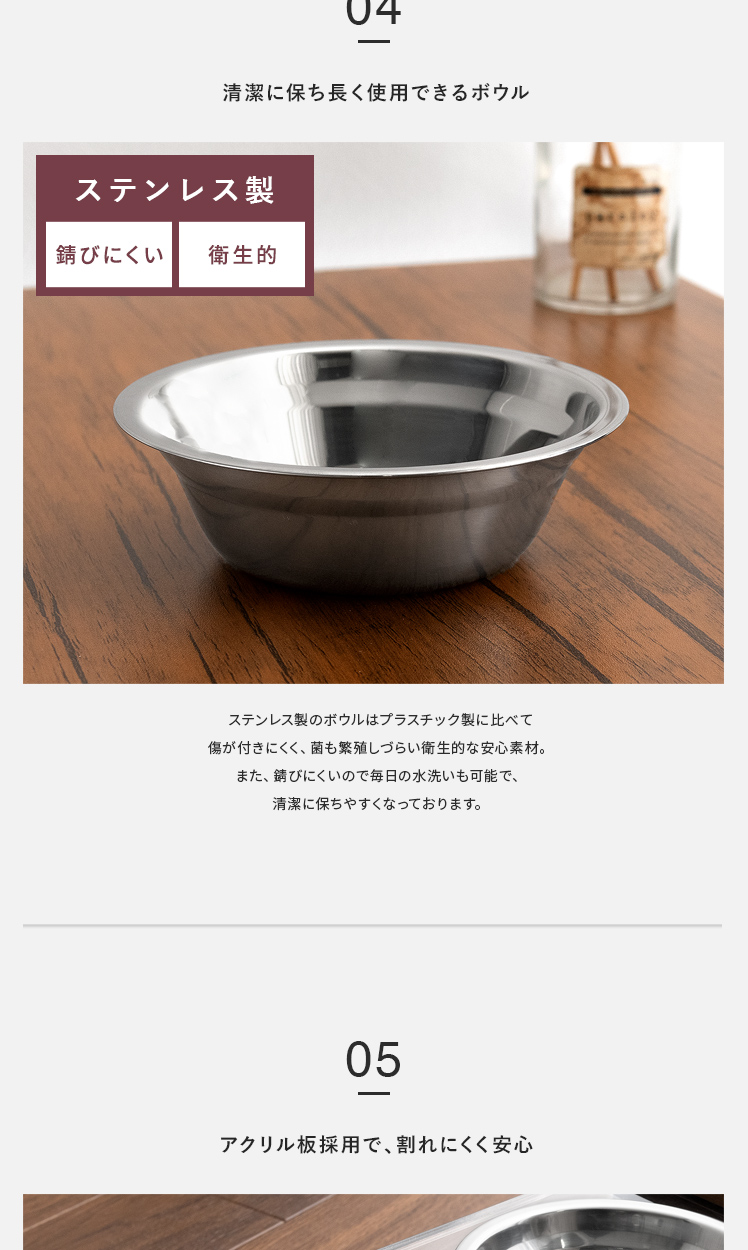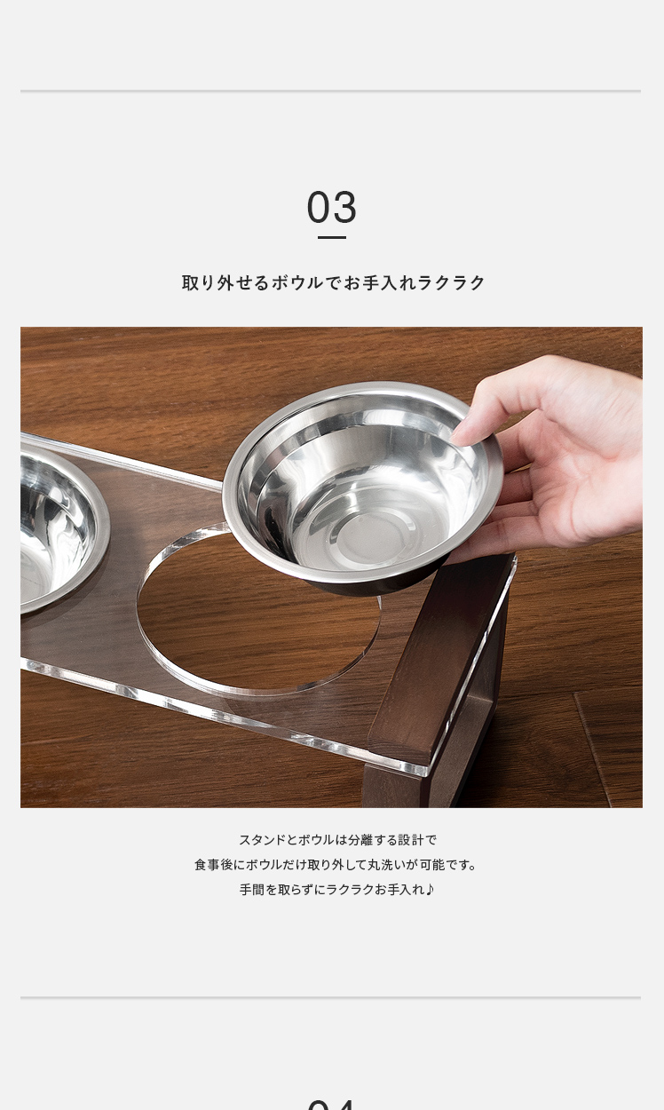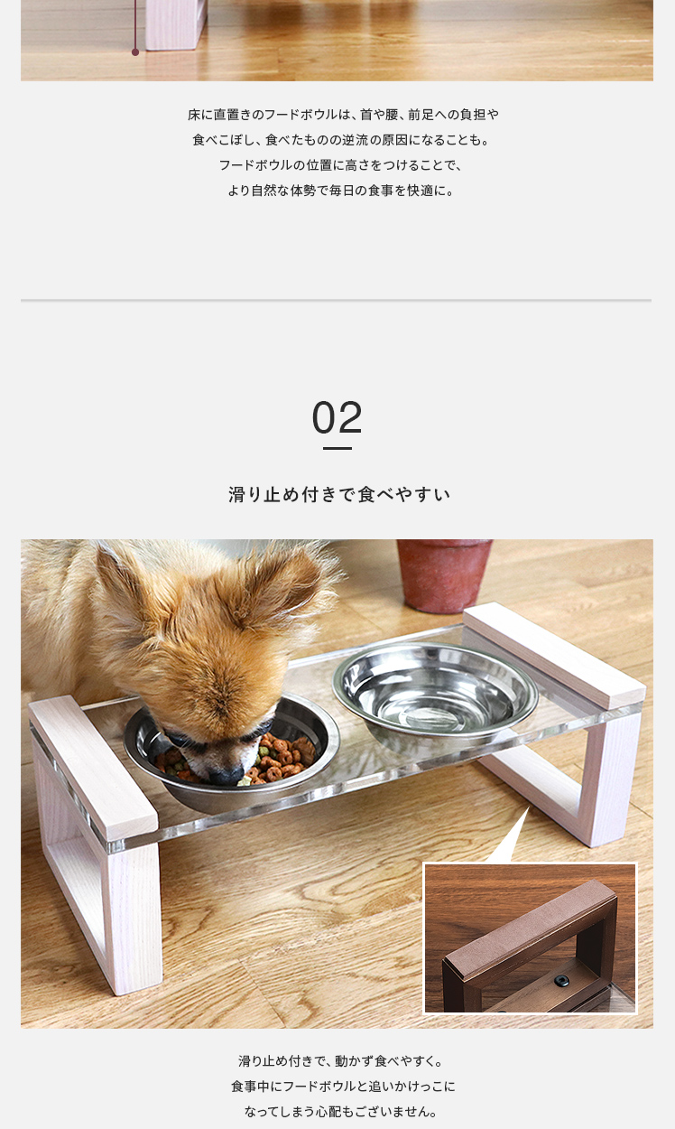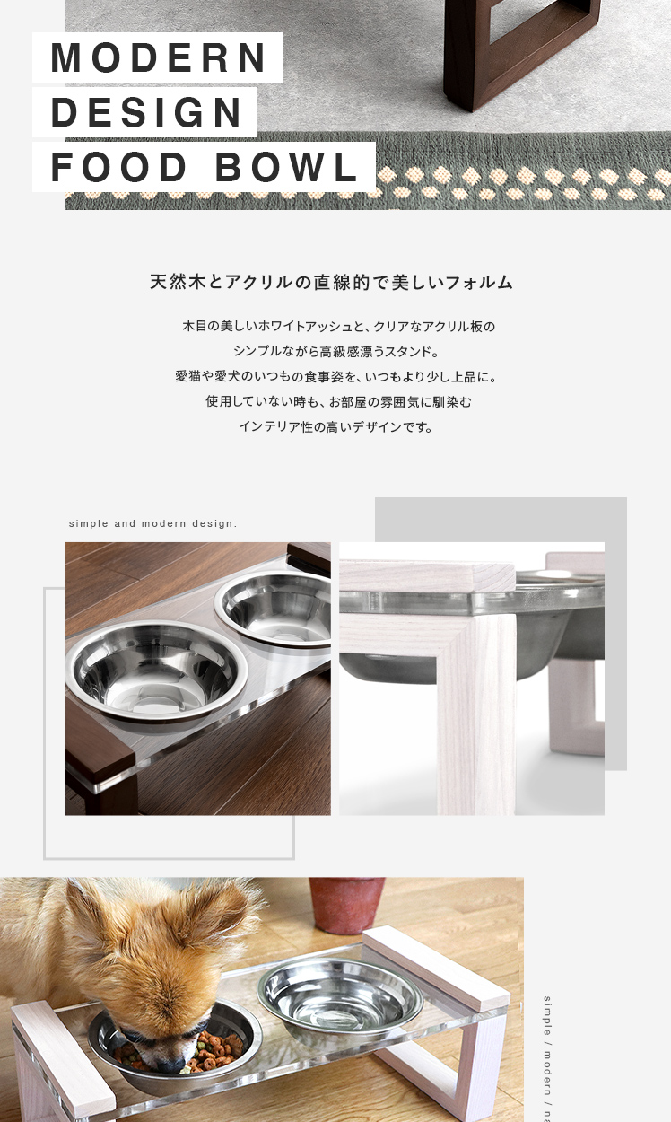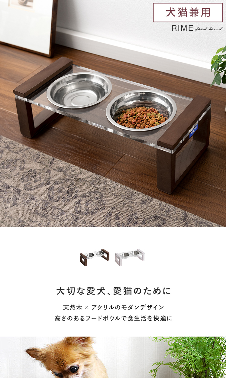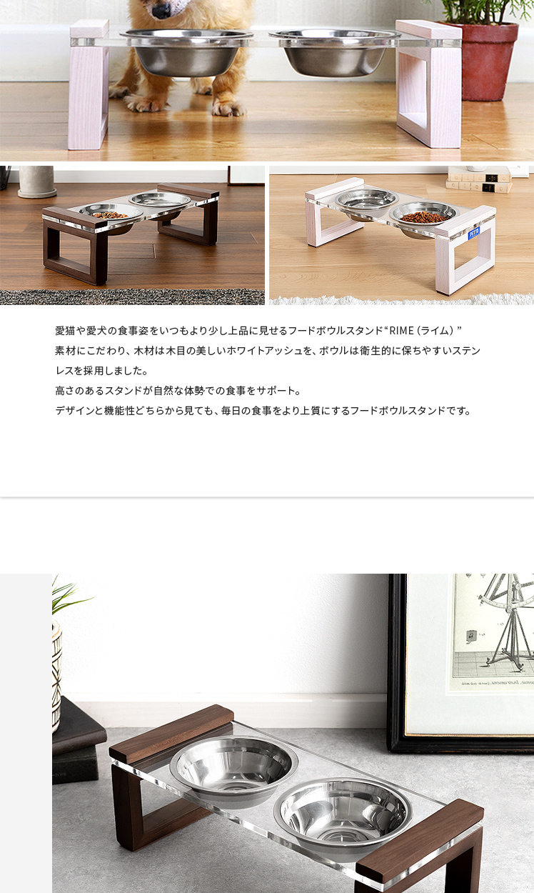 ペット用フードボウルスタンド RIME 〔ライム〕/愛猫や愛犬の食事姿をいつもより少し上品に見せるフードボウルスタンド“RIME(ライム)”素材にこだわり、木材は木目の美しいホワイトアッシュを、ボウルは衛生的に保ちやすいステンレスを採用しました。高さのあるスタンドが自然な体勢での食事をサポート。デザインと機能性どちらから見ても、毎日の食事をより上質にするフードボウルスタンドです。
