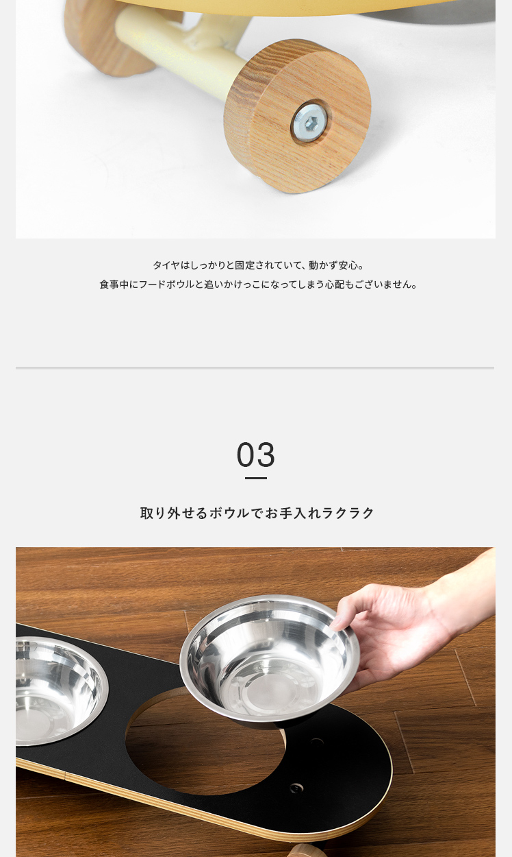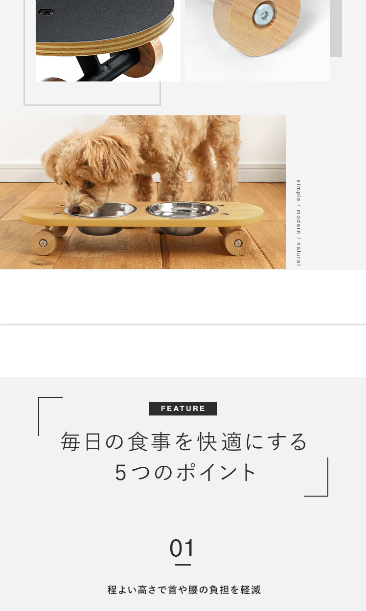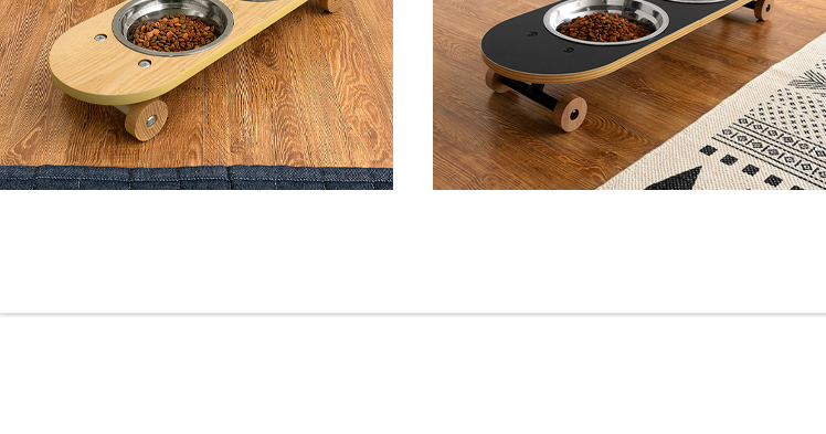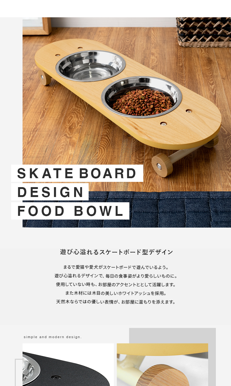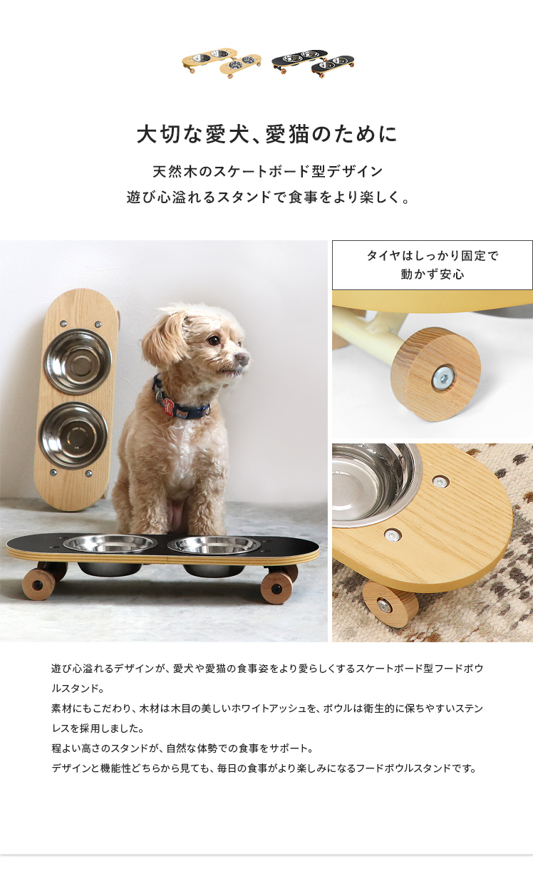 ペット用フードボウルスタンドL SK8 PLATE 〔スケートプレート〕/遊び心溢れるデザインが、愛犬や愛猫の食事姿をより愛らしくするスケートボード型フードボウルスタンド。素材にもこだわり、木材は木目の美しいホワイトアッシュを、ボウルは衛生的に保ちやすいステンレスを採用しました。程よい高さのスタンドが、自然な体勢での食事をサポート。デザインと機能性どちらから見ても、毎日の食事がより楽しみになるフードボウルスタンドです。