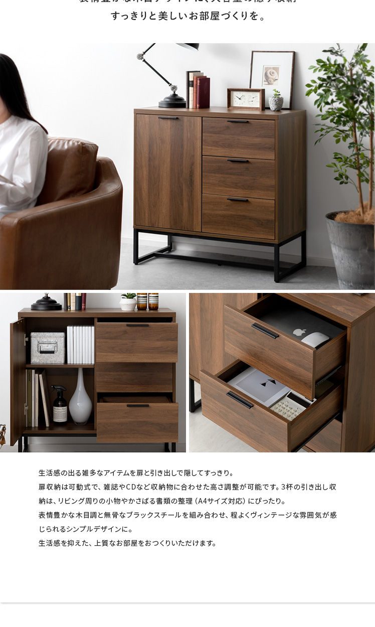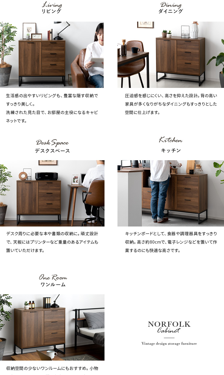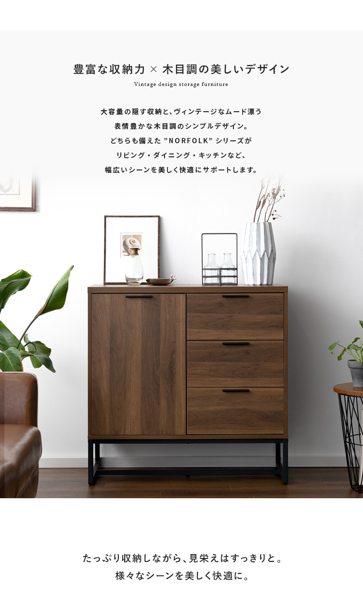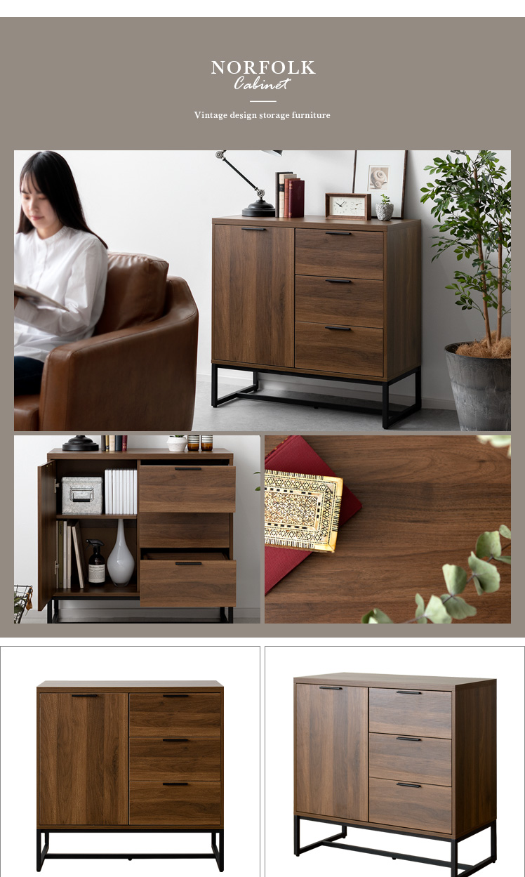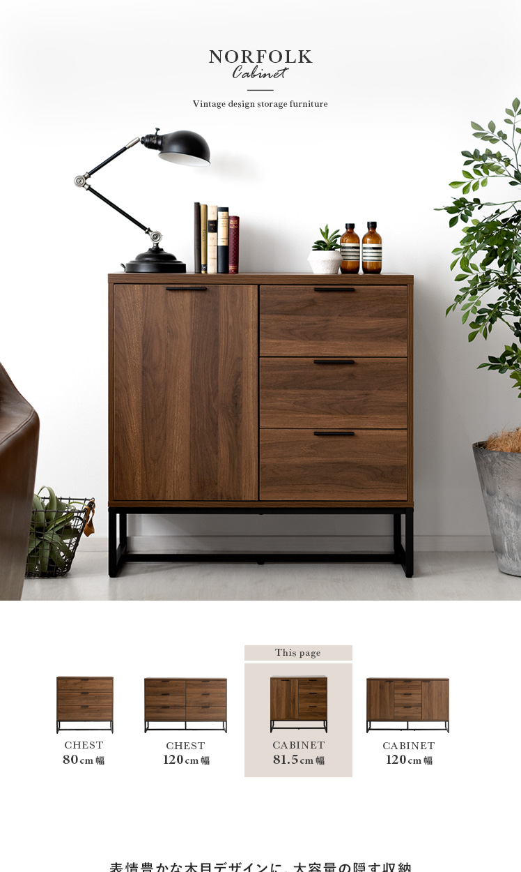 NORFOLK CABINET〔ノーフォークキャビネット〕 81.5cm幅/生活感の出る雑多なアイテムを扉と引き出しで隠してすっきり。扉収納は可動式で、雑誌やCDなど収納物に合わせた高さ調整が可能です。3杯の引き出し収納は、リビング周りの小物やかさばる書類の整理(A4サイズ対応)にぴったり。表情豊かな木目調と無骨なブラックスチールを組み合わせ、程よくヴィンテージな雰囲気が感じられるシンプルデザインに。生活感を抑えた、上質なお部屋をおつくりいただけます。