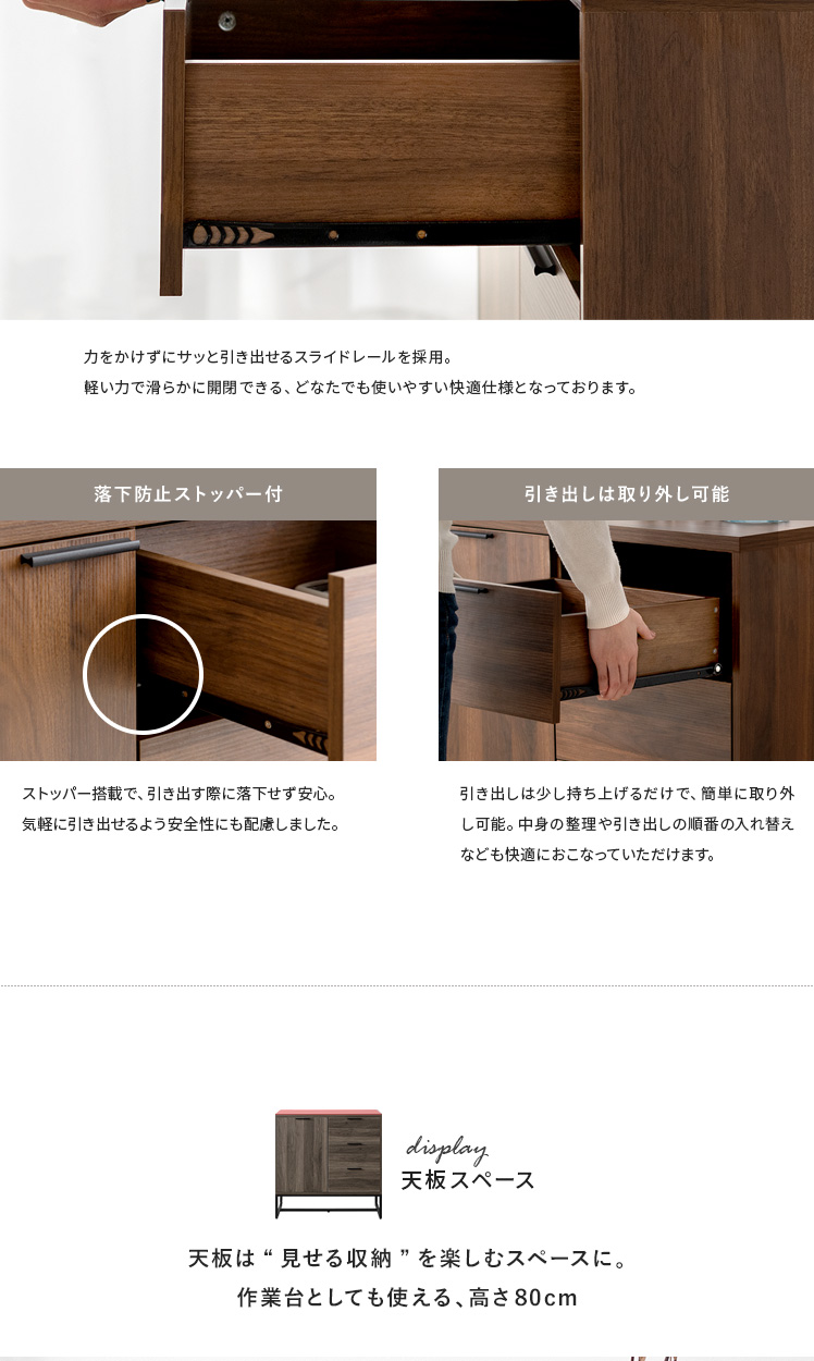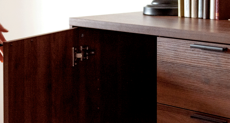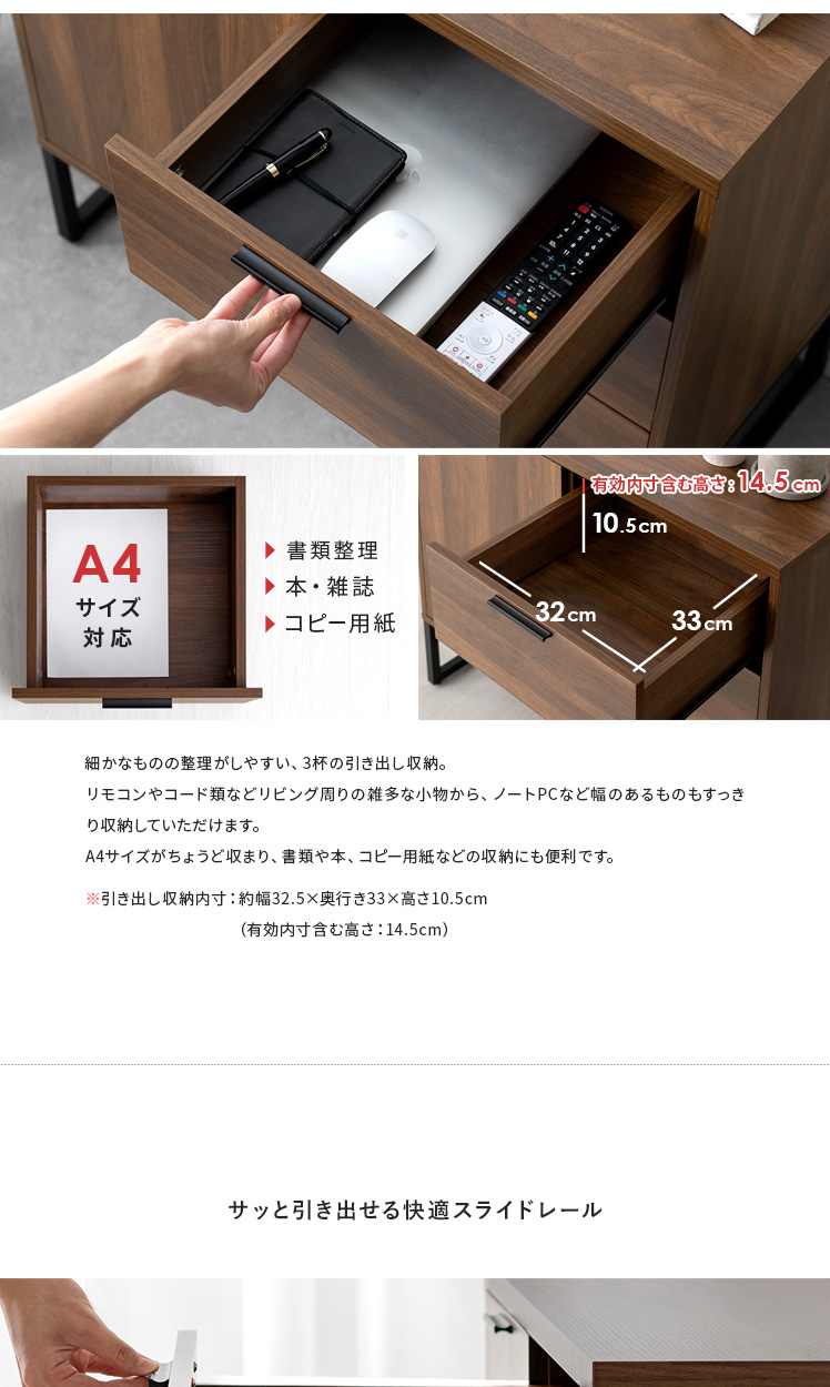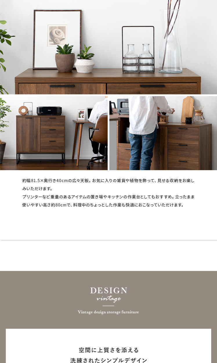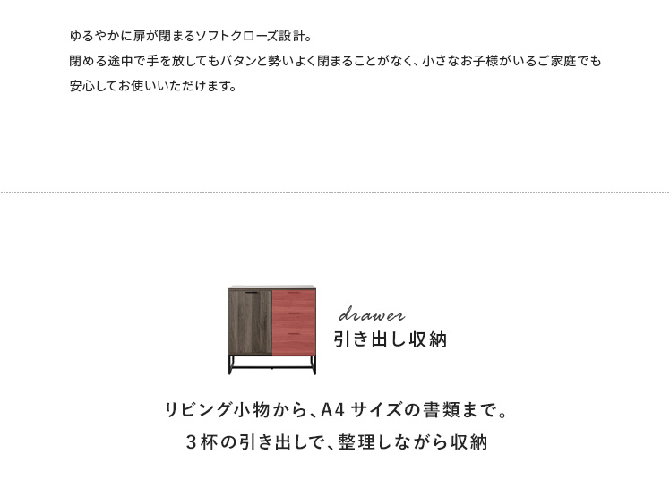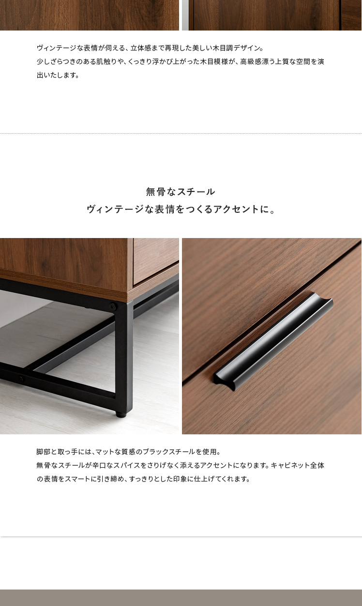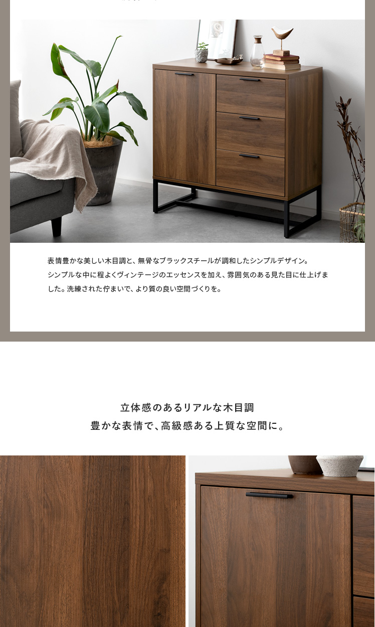 NORFOLK CABINET〔ノーフォークキャビネット〕 81.5cm幅/生活感の出る雑多なアイテムを扉と引き出しで隠してすっきり。扉収納は可動式で、雑誌やCDなど収納物に合わせた高さ調整が可能です。3杯の引き出し収納は、リビング周りの小物やかさばる書類の整理(A4サイズ対応)にぴったり。表情豊かな木目調と無骨なブラックスチールを組み合わせ、程よくヴィンテージな雰囲気が感じられるシンプルデザインに。生活感を抑えた、上質なお部屋をおつくりいただけます。