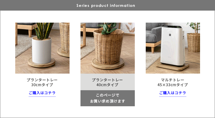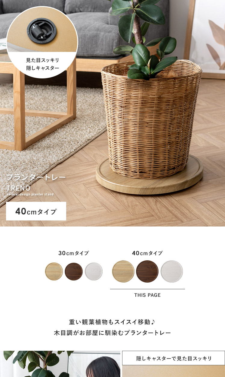 プランタートレー TRENO〔トレーノ〕 40cmタイプ/スムーズに動くキャスター付きで、重い観葉植物もスイスイ移動できるプランタートレー。日当たり調整や移動の際、重い鉢を持ち上げたり引きずることなく快適に動かしていただけます。キャスターは外からは見えない隠しキャスター仕様で、見た目もスッキリとしたものに。また、表情豊かな木目調デザインで、お部屋の雰囲気を損なわずスッと馴染みます。