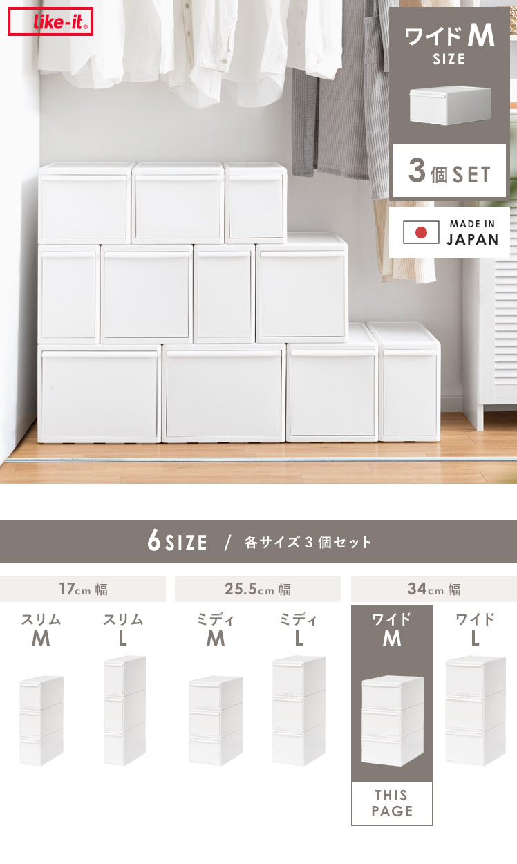 【ワイドM/3個セット】[幅34] like it(ライクイット) 組み合わせて使える収納ケース ワイドMサイズ3個セット