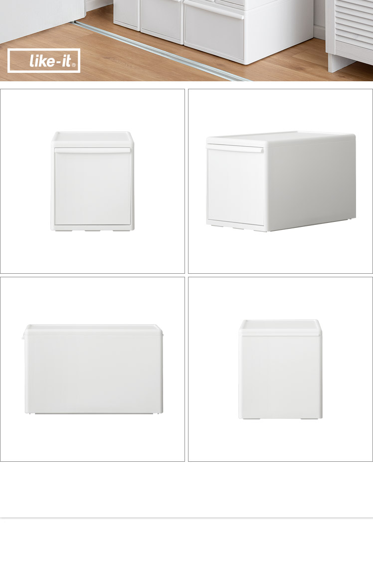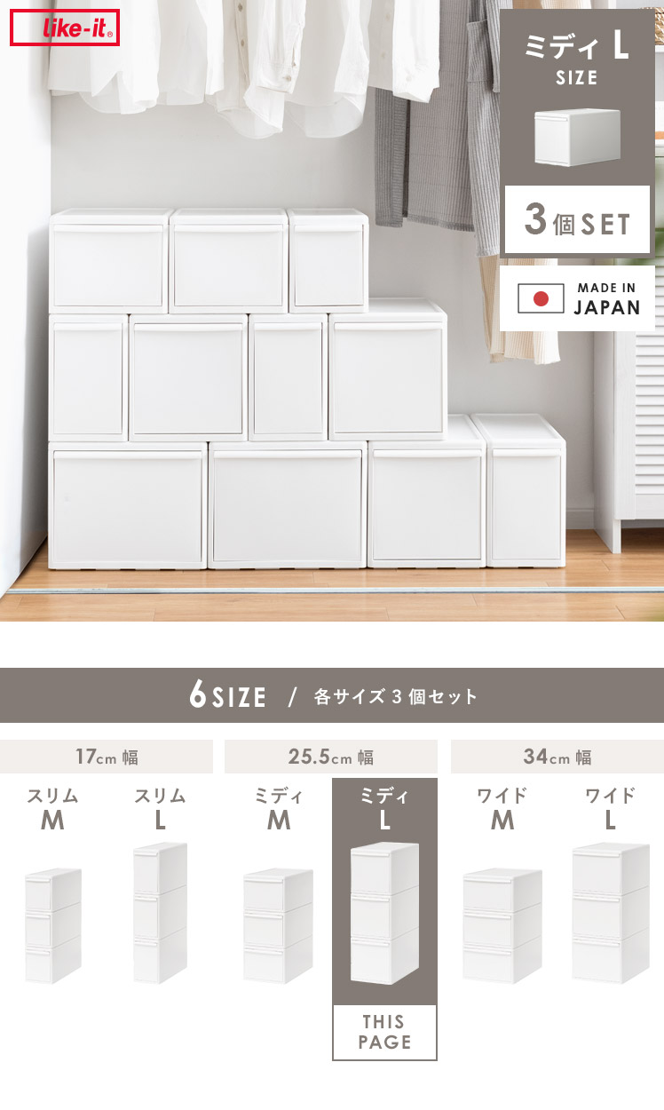 like it〔ライクイット〕 組み合わせて使える収納ケース ミディLサイズ3個セット/収納物や使う場所に合わせて、積み重ねたり並べたり。異なる幅のものでも自由に組み合わせられる収納ケースで、自分だけの収納空間をおつくりいただけます。奥行きは全サイズ約46.5cm。小さ目のクローゼットにも収まりやすいサイズ感で、置く場所を選びません。自由自在にカスタマイズして、理想の収納スペースに。