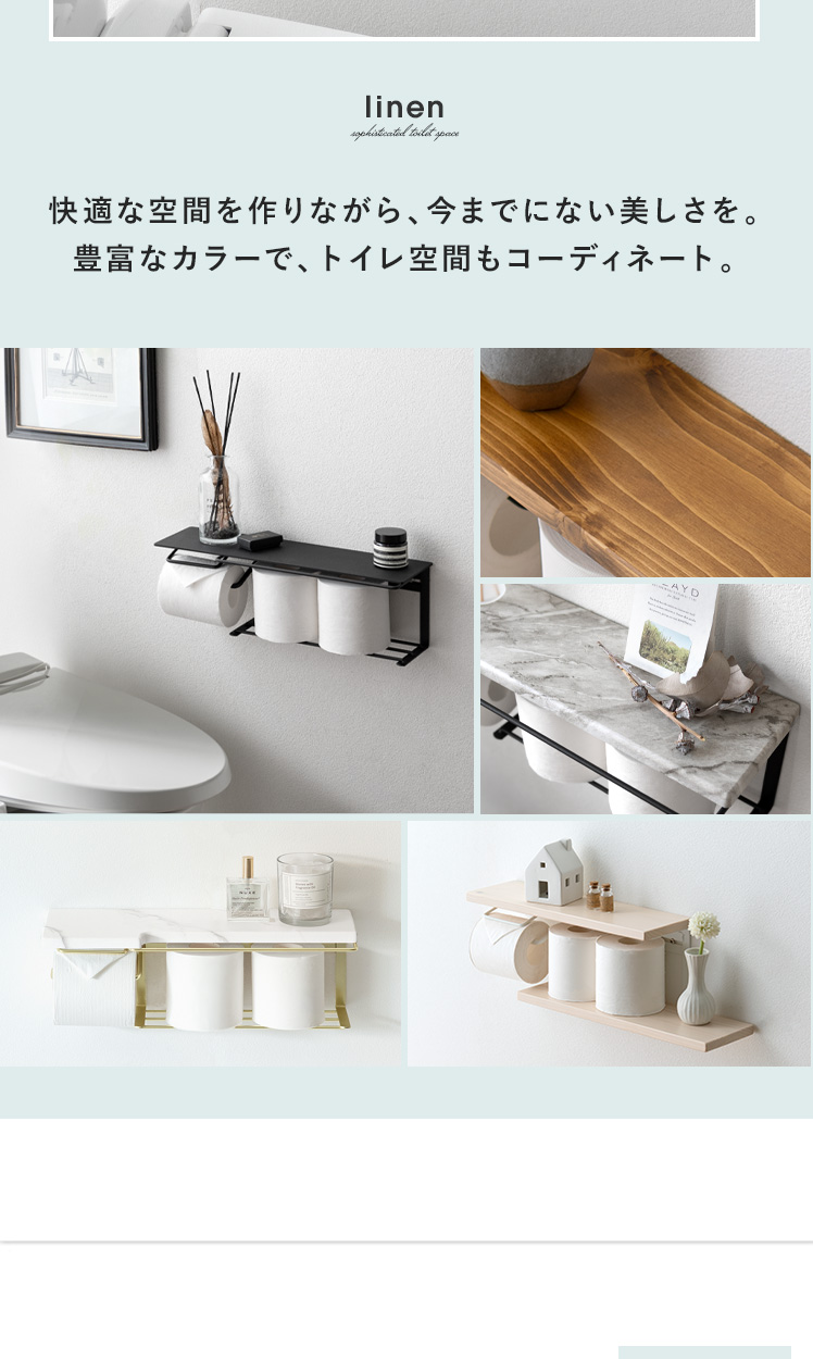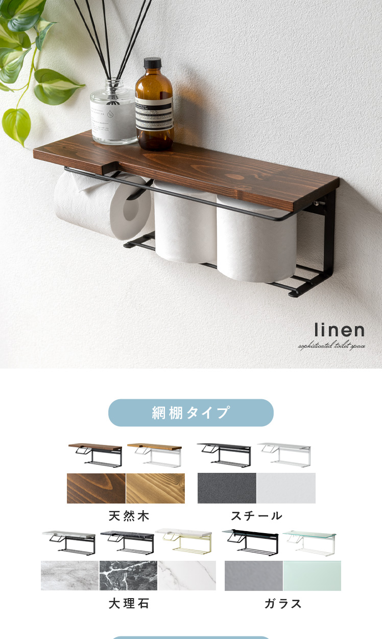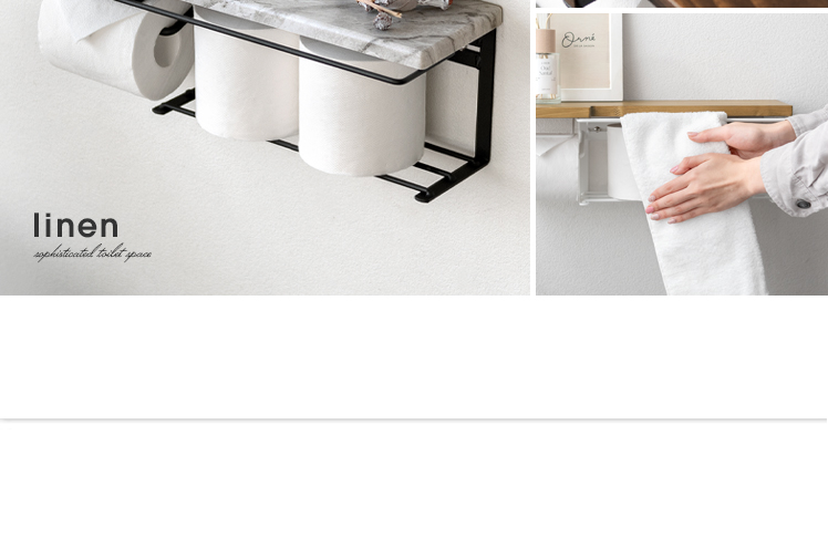 トイレットペーパーホルダー linen〔リンネル〕/使い勝手と美しさを追求したデザインで、トイレを快適で上質な空間にするトイレットペーパーホルダー linen(リンネル)。天板スペースはお気に入りの小物のディスプレイやちょい置きに便利な幅約44cm。また、ペーパーのストックや小物が置けるラック収納スペースつき。使いたいときにサッと取り出せて、さらに快適なトイレ空間をお作りいたします。