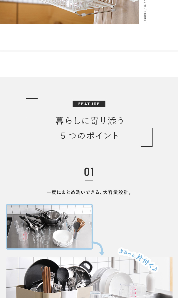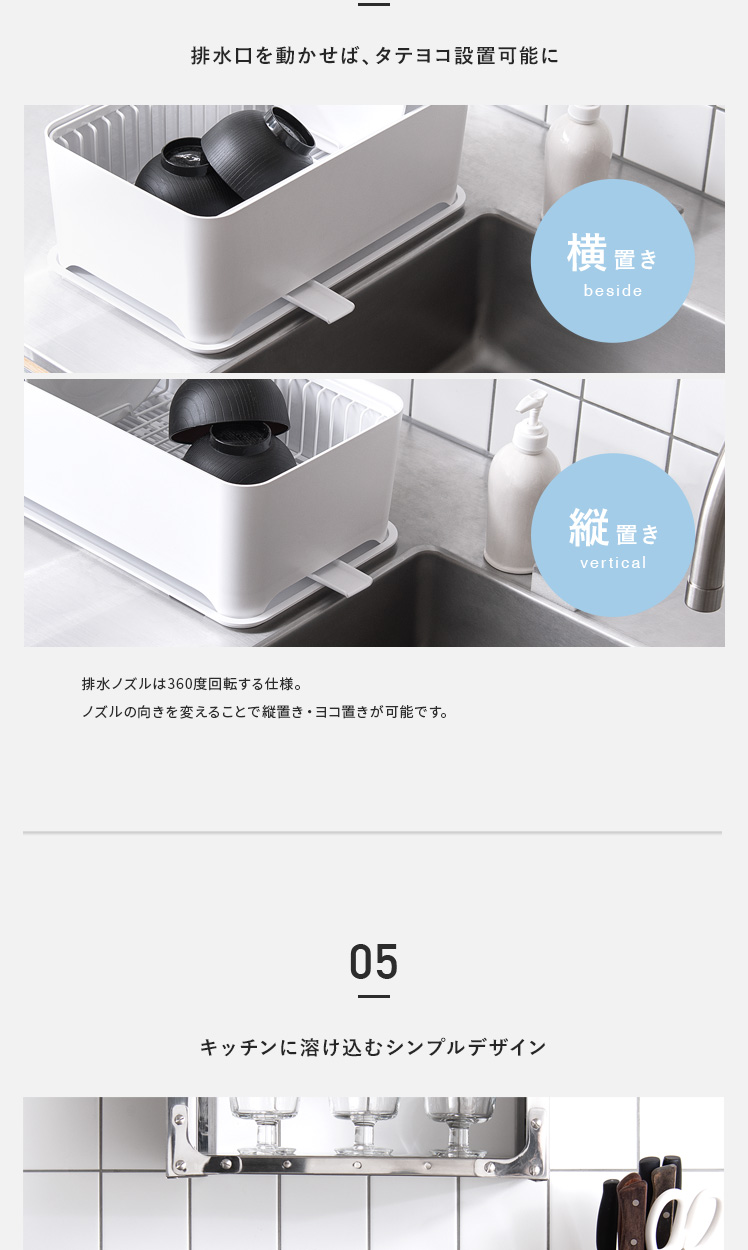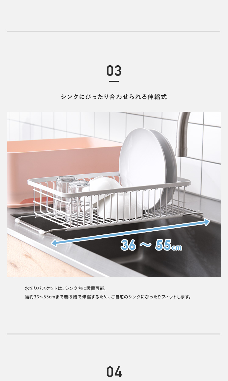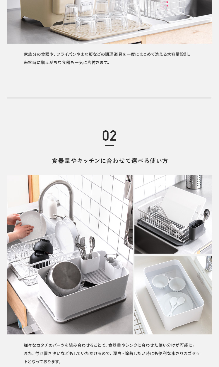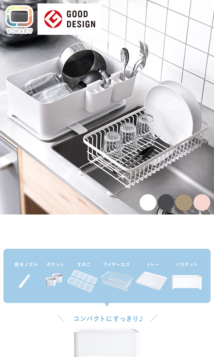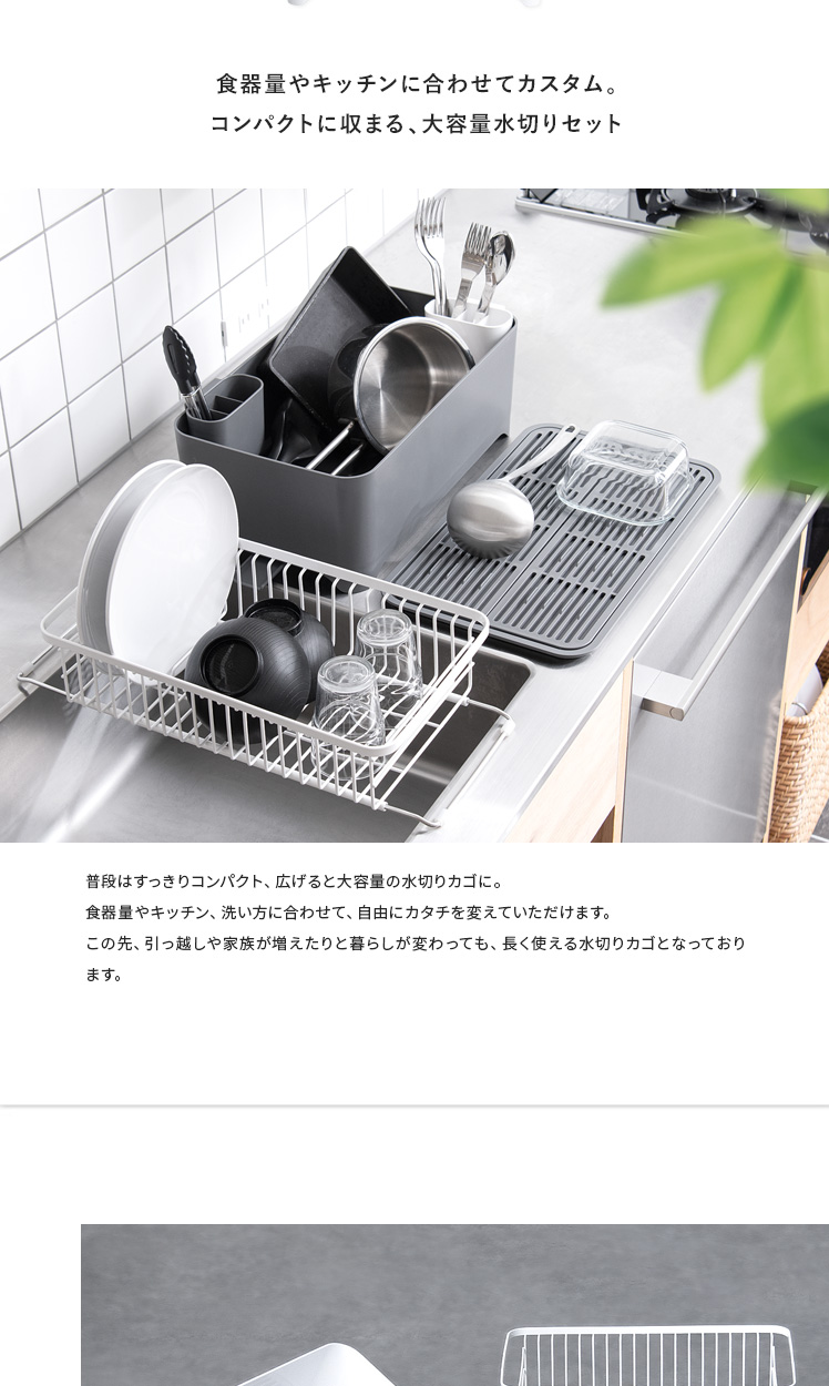 YOHAKU〔余白〕コンパクトにまとまる大容量水切りセット/普段はすっきりコンパクト、広げると大容量の水切りカゴに。食器量やキッチン、洗い方に合わせて、自由にカタチを変えていただけます。この先、引っ越しや家族が増えたりと暮らしが変わっても、長く使える水切りカゴとなっております。