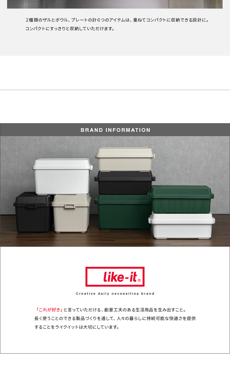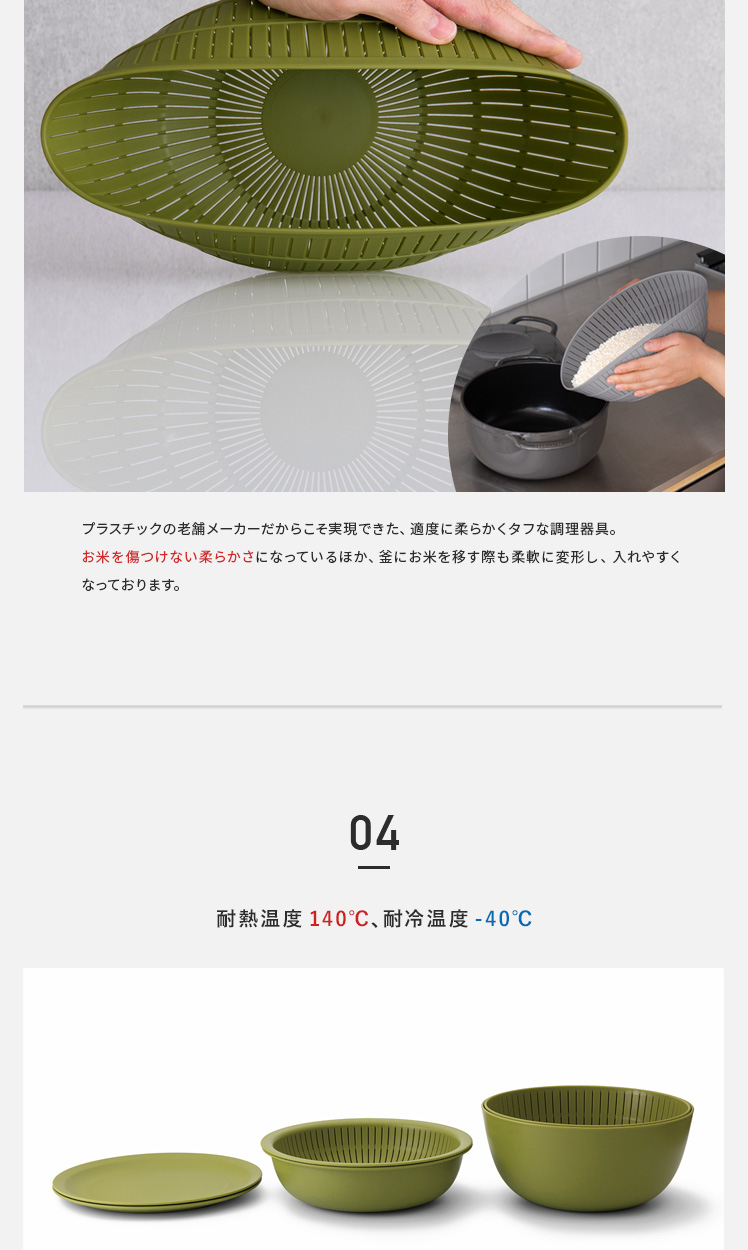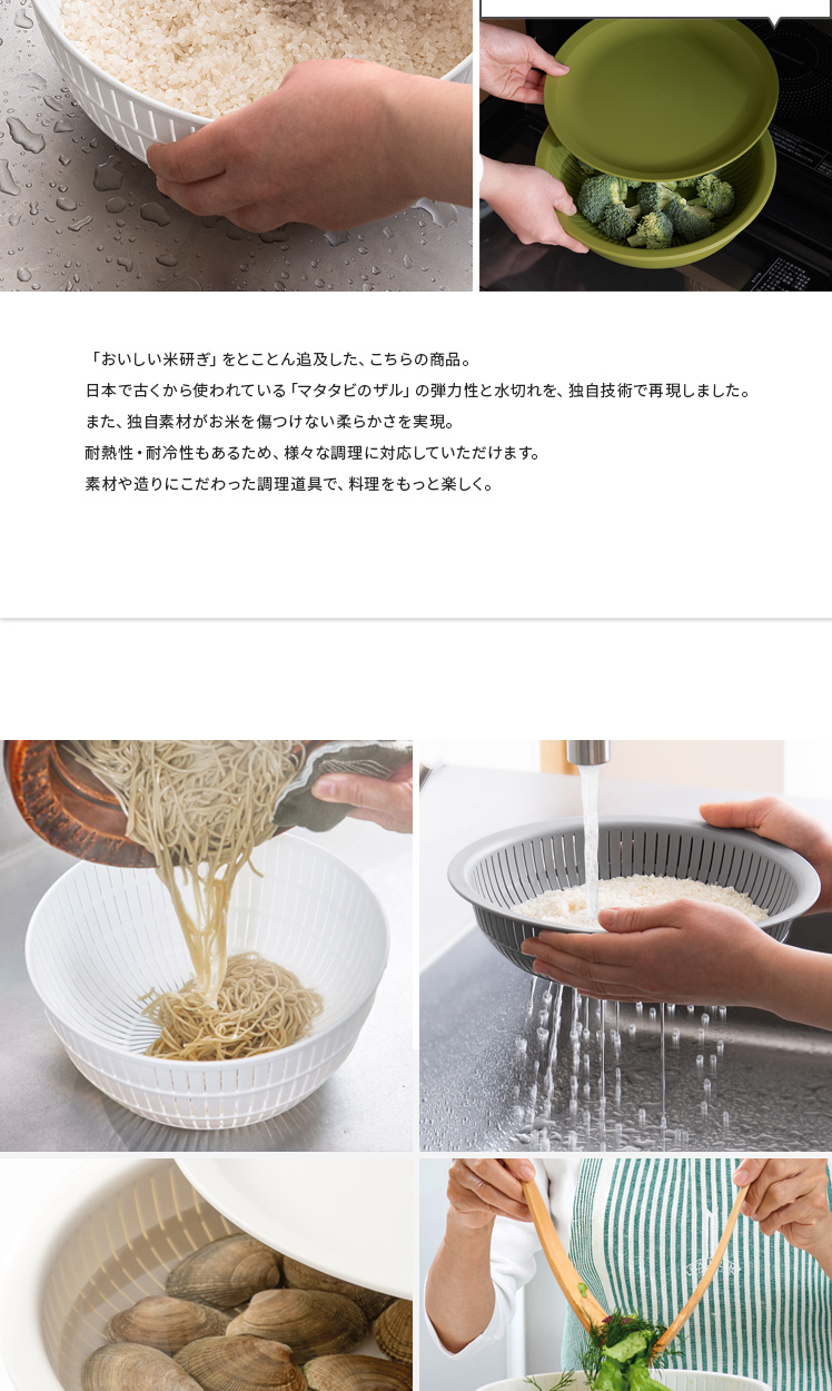 like it〔ライクイット〕米とぎにも使えるザルとボウル〔6点セット〕/「おいしい米研ぎ」をとことん追及した、こちらの商品。日本で古くから使われている「マタタビのザル」の弾力性と水切れを、独自技術で再現しました。また、独自素材がお米を傷つけない柔らかさを実現。耐熱性・耐冷性もあるため、様々な調理に対応していただけます。素材や造りにこだわった調理道具で、料理をもっと楽しく。