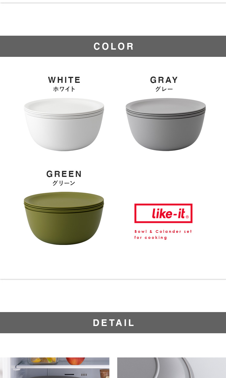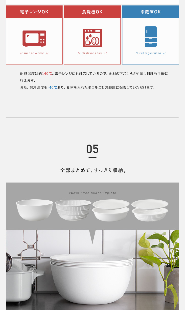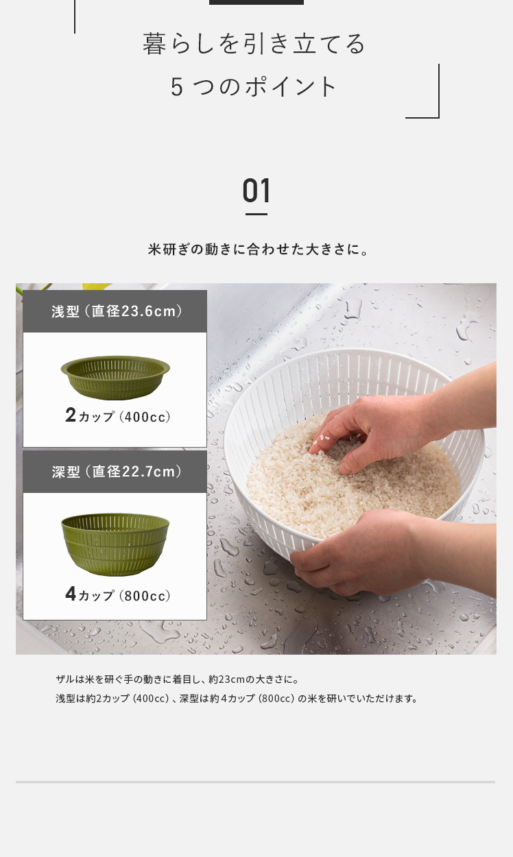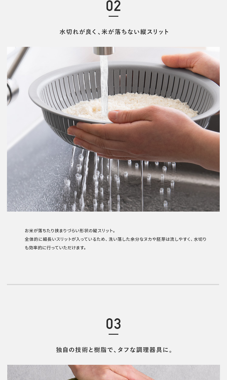 like it〔ライクイット〕米とぎにも使えるザルとボウル〔6点セット〕/「おいしい米研ぎ」をとことん追及した、こちらの商品。日本で古くから使われている「マタタビのザル」の弾力性と水切れを、独自技術で再現しました。また、独自素材がお米を傷つけない柔らかさを実現。耐熱性・耐冷性もあるため、様々な調理に対応していただけます。素材や造りにこだわった調理道具で、料理をもっと楽しく。