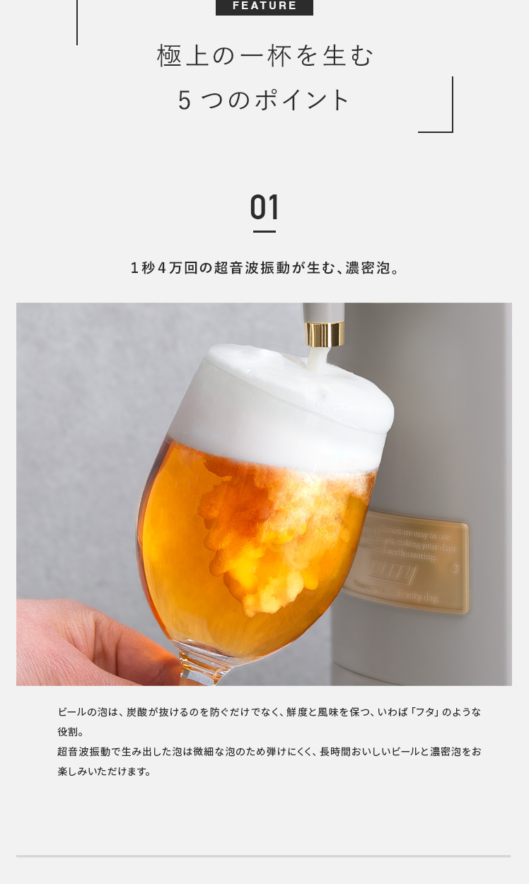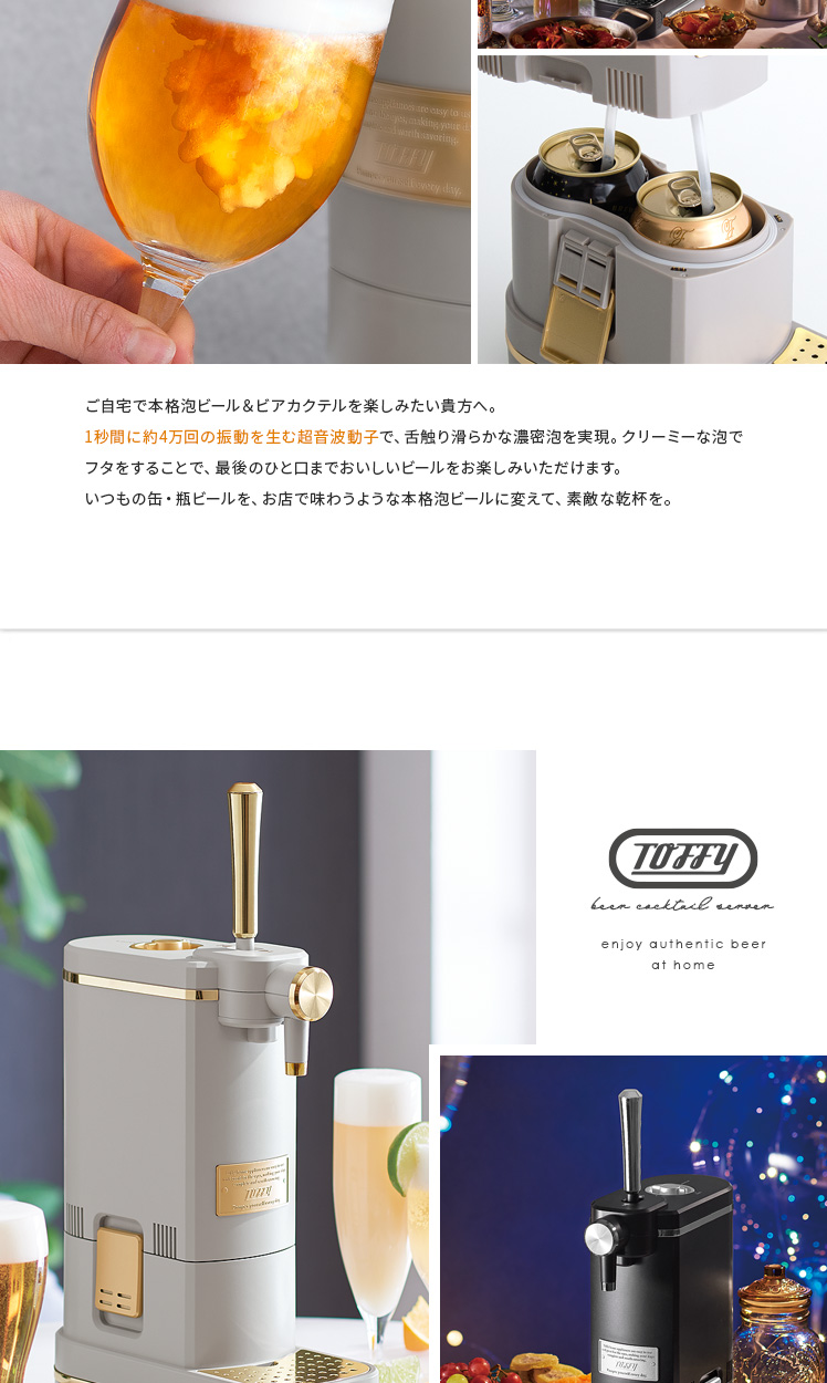 ビアカクテルサーバー Toffy〔トフィー 〕/ご自宅で本格泡ビール&ビアカクテルを楽しみたい貴方へ。1秒間に約4万回の振動を生む超音波動子で、舌触り滑らかな濃密泡を実現。クリーミーな泡でフタをすることで、最後のひと口までおいしいビールをお楽しみいただけます。いつもの缶・瓶ビールを、お店で味わうような本格泡ビールに変えて、素敵な乾杯を。