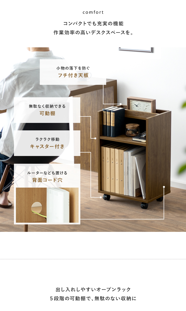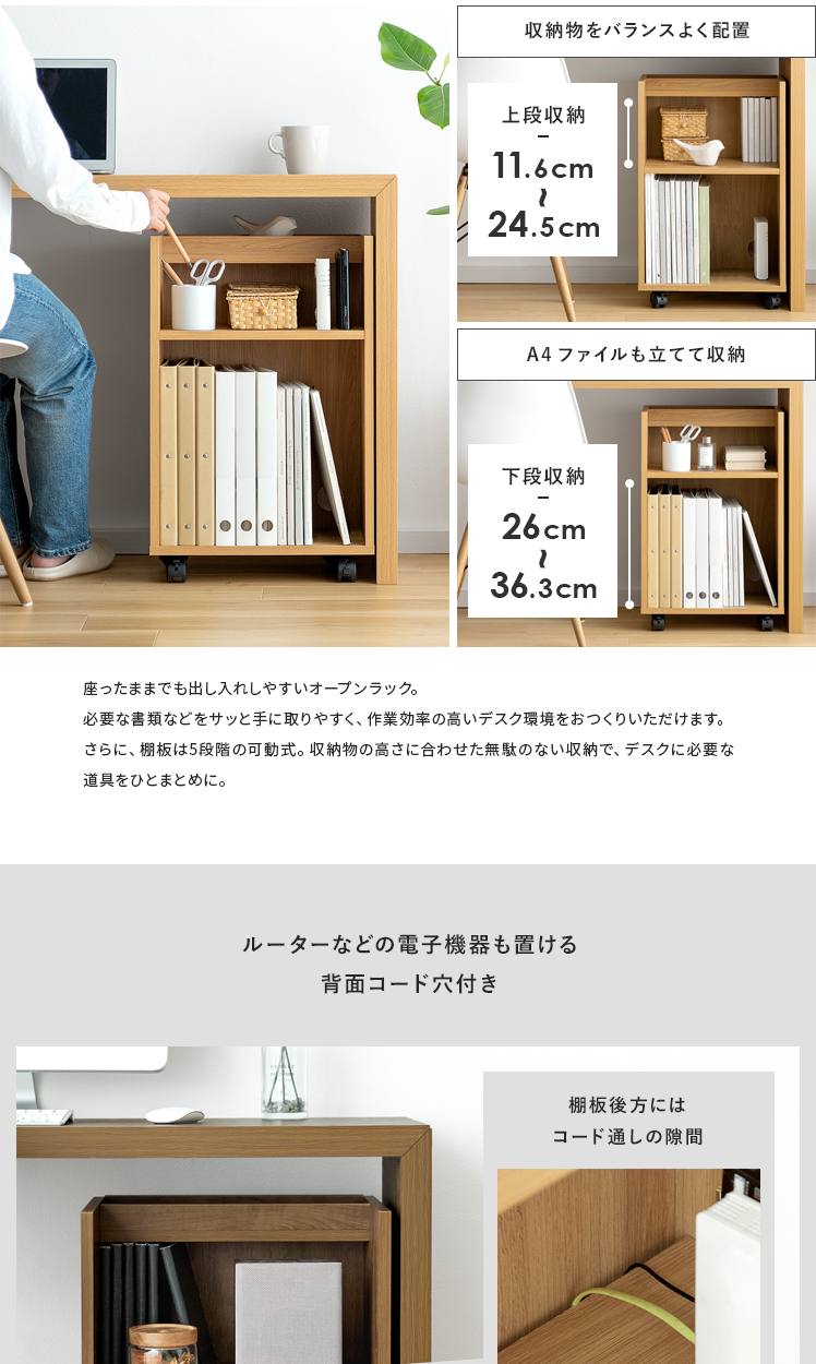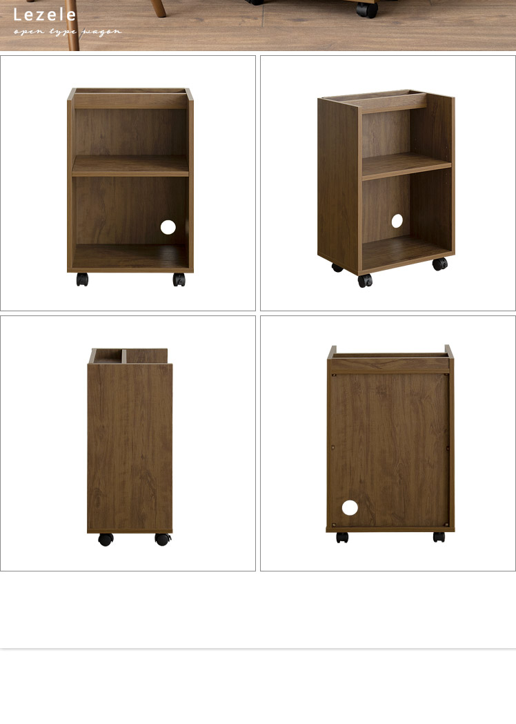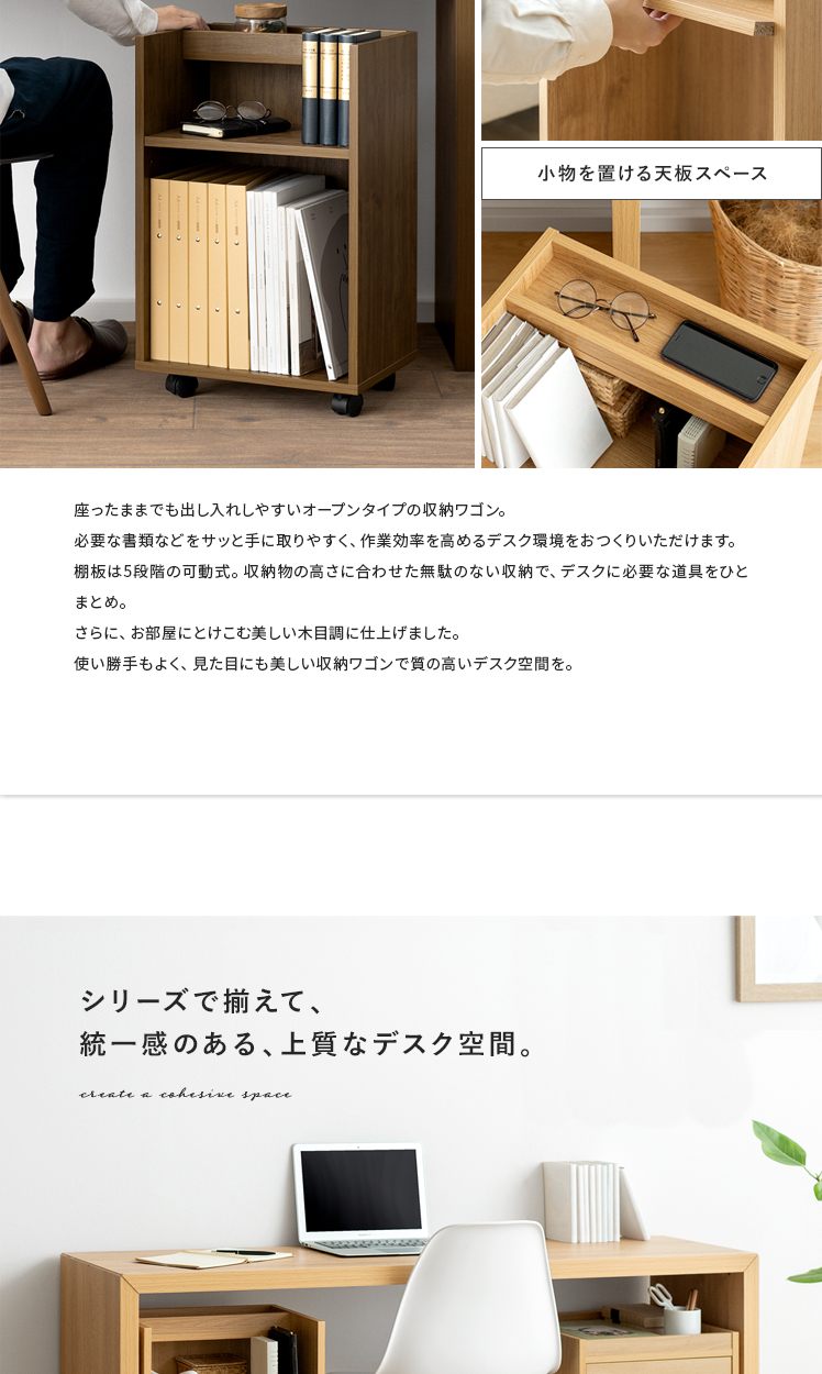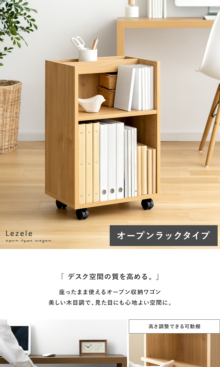 デスクワゴン Lezele〔ルゼル〕 オープンラックタイプ/座ったままでも出し入れしやすいオープンタイプの収納ワゴン。必要な書類などをサッと手に取りやすく、作業効率を高めるデスク環境をおつくりいただけます。棚板は5段階の可動式。収納物の高さに合わせた無駄のない収納で、デスクに必要な道具をひとまとめ。さらに、お部屋にとけこむ美しい木目調に仕上げました。使い勝手もよく、見た目にも美しい収納ワゴンで質の高いデスク空間を。