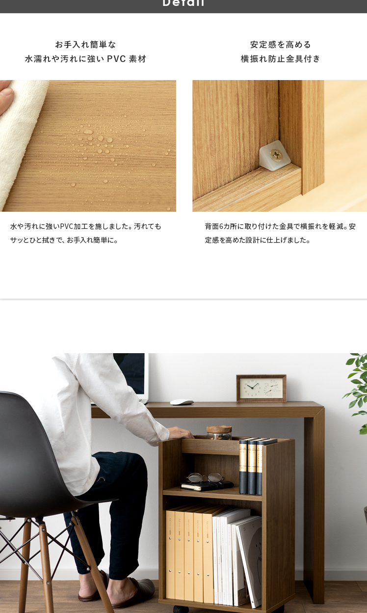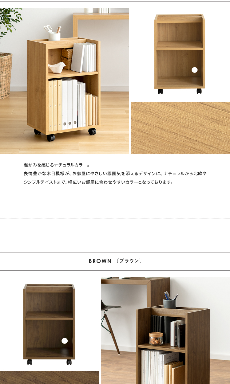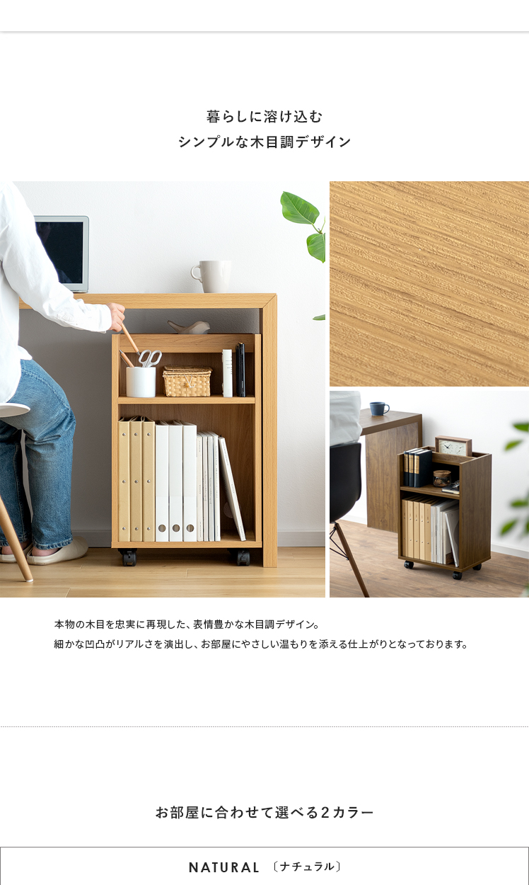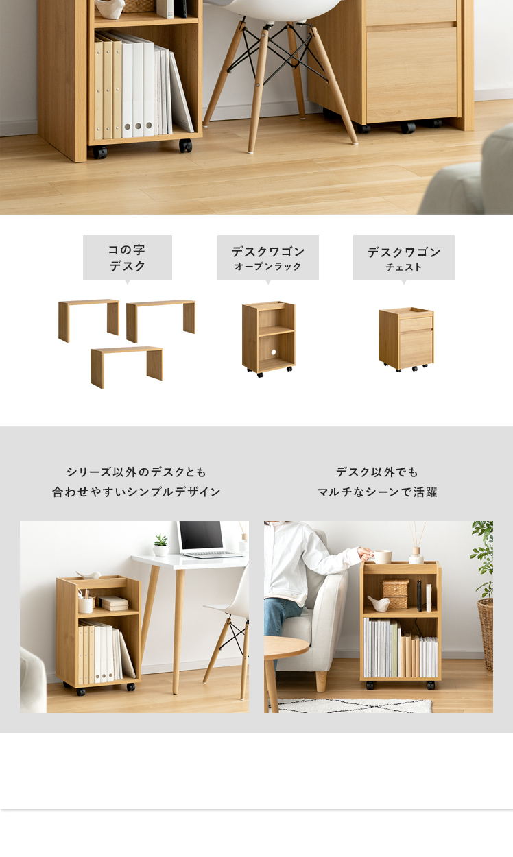 デスクワゴン Lezele〔ルゼル〕 オープンラックタイプ/座ったままでも出し入れしやすいオープンタイプの収納ワゴン。必要な書類などをサッと手に取りやすく、作業効率を高めるデスク環境をおつくりいただけます。棚板は5段階の可動式。収納物の高さに合わせた無駄のない収納で、デスクに必要な道具をひとまとめ。さらに、お部屋にとけこむ美しい木目調に仕上げました。使い勝手もよく、見た目にも美しい収納ワゴンで質の高いデスク空間を。