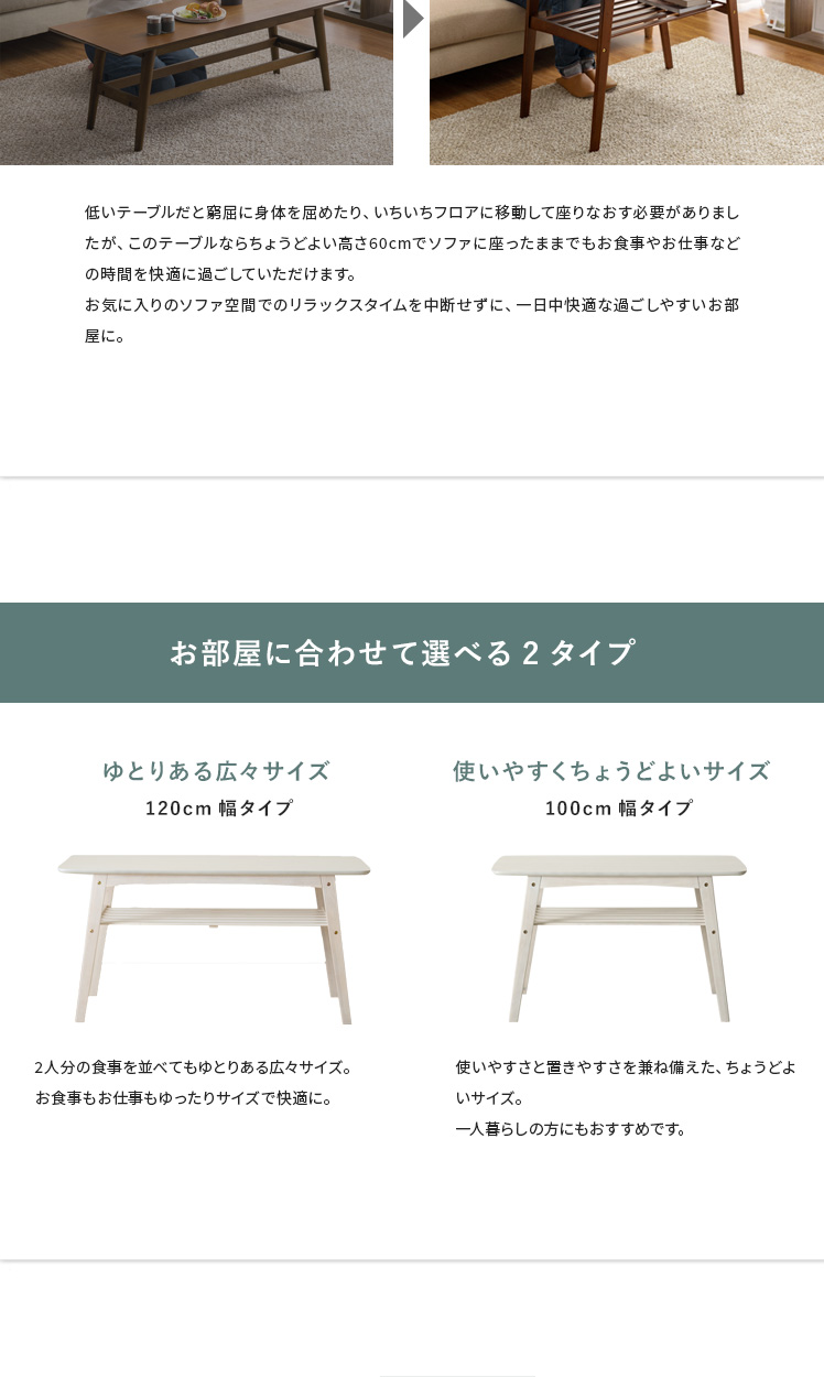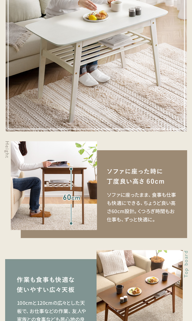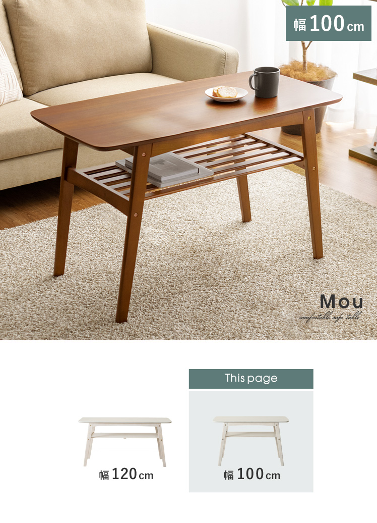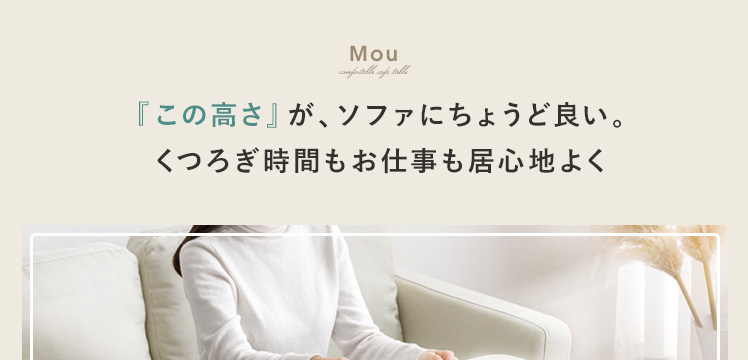ソファテーブル Mou〔ムー〕100cm幅タイプ/ソファに座ったまま、食事も仕事も快適にできる、ちょうど良い高さ60cmのソファーテーブル“Mou(ムー)”使いやすい広々天板で、一人で集中したい作業も、大切な人と過ごす食事の時間も、ゆとりある居心地の良い空間で快適にお過ごしいただけます。またテレビのリモコンもお仕事用のPCもすぐ出し入れできるオープン収納つきで、作業もくつろぎも思いっきり堪能できるお部屋に。ちょうどいい高さのソファで、ソファに座ったまま1日中快適な時間をおつくりいただけます