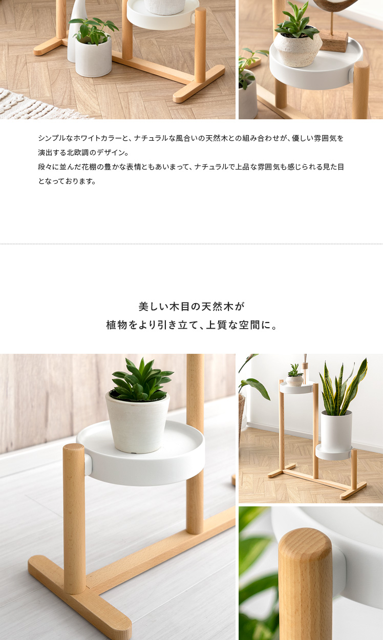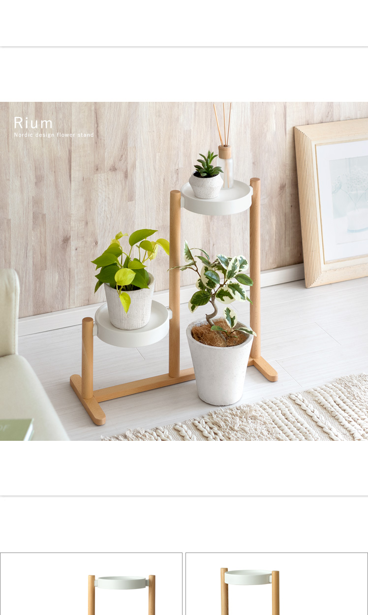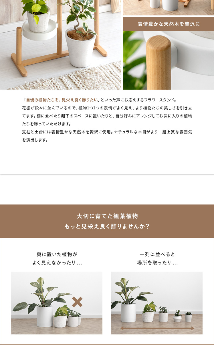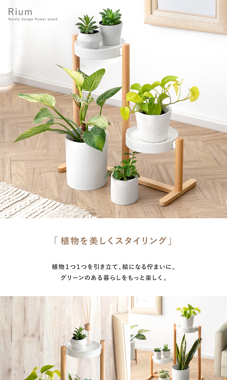 フラワースタンド Rium〔リウム〕/「自慢の植物たちを、見栄え良く飾りたい」といった声にお応えするフラワースタンド。花棚が段々に並んでいるので、植物1つ1つの表情がよく見え、より植物たちの美しさを引き立てます。棚に並べたり棚下のスペースに置いたりと、自分好みにアレンジしてお気に入りの植物たちを飾っていただけます。支柱と土台には表情豊かな天然木を贅沢に使用。ナチュラルな木目がより一層上質な雰囲気を演出します。
