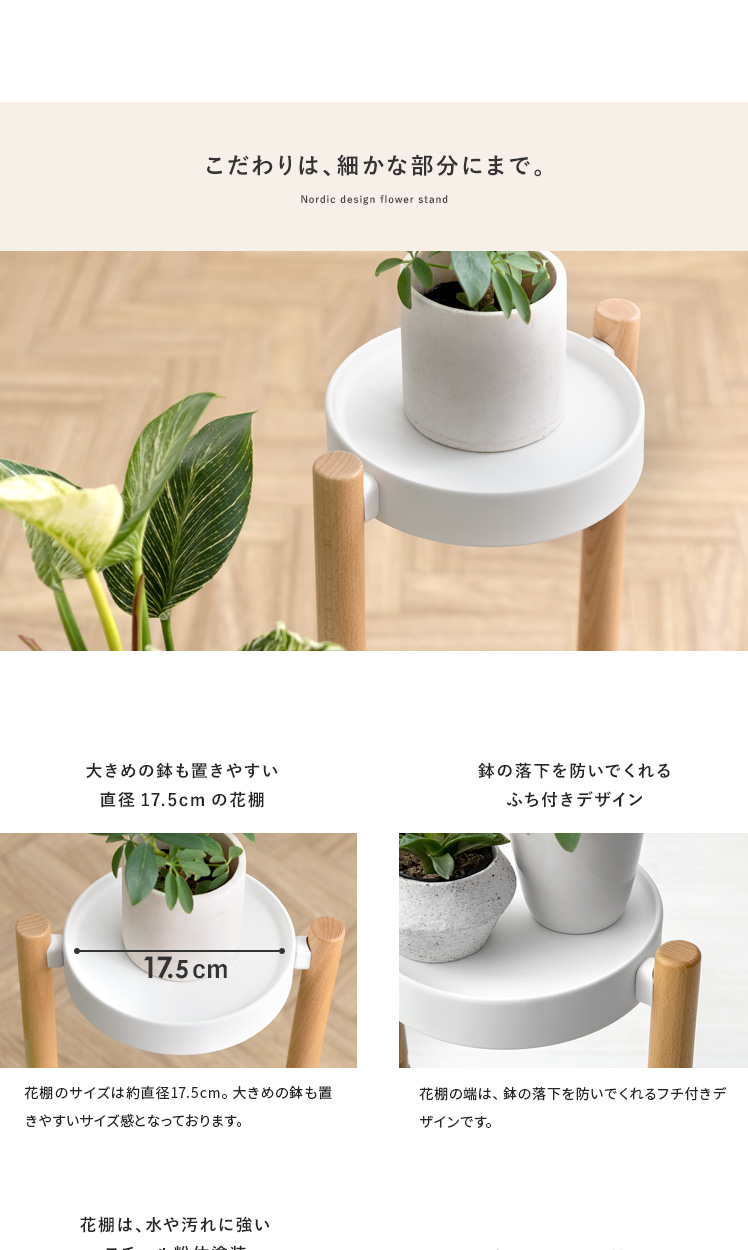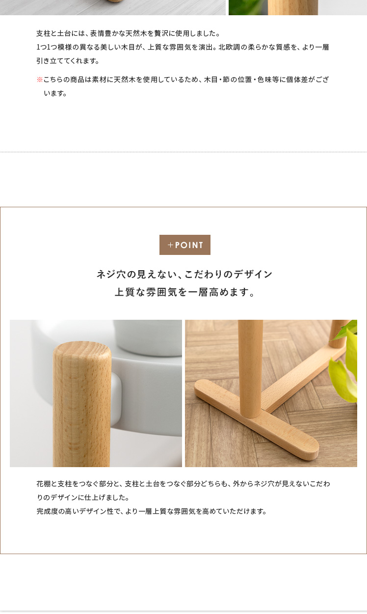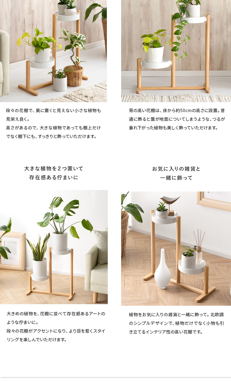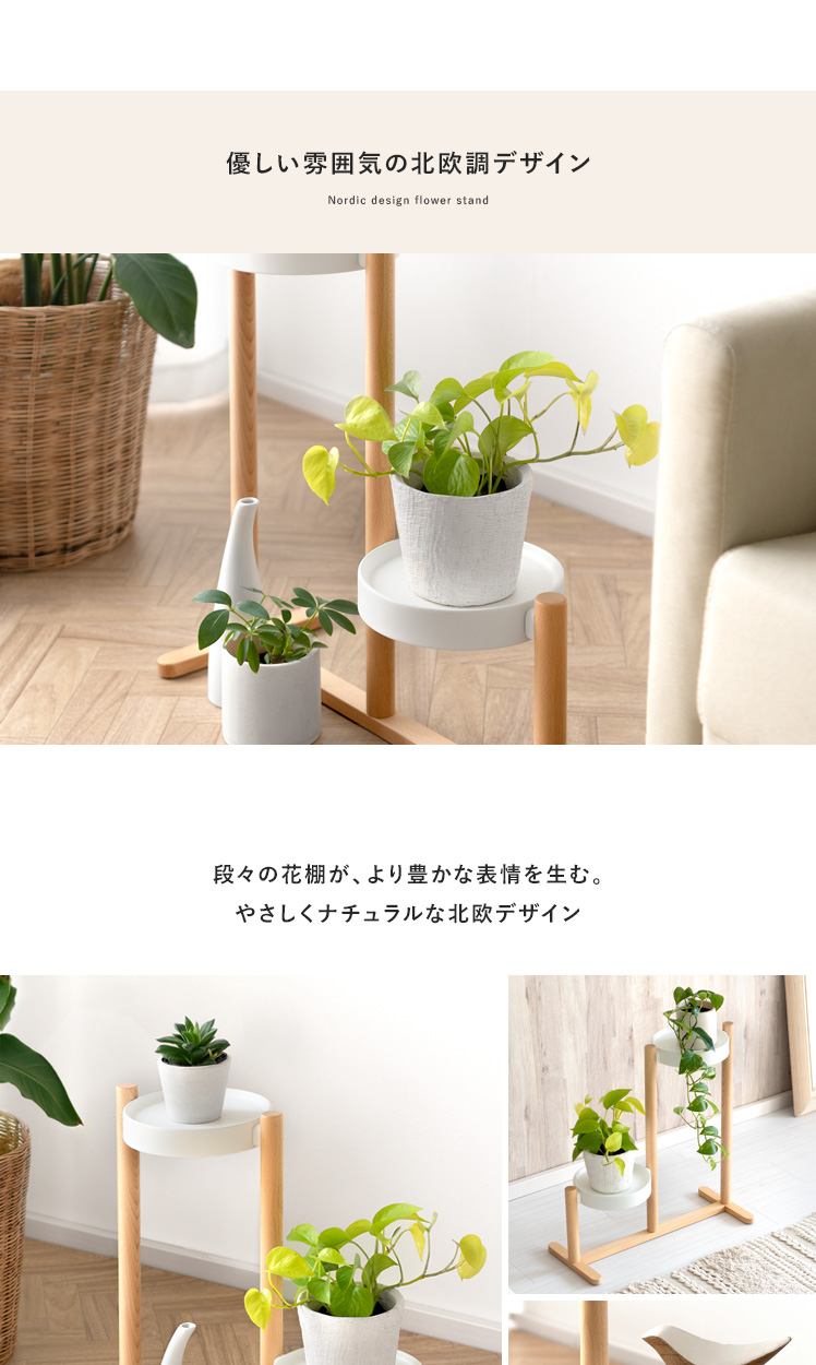 フラワースタンド Rium〔リウム〕/「自慢の植物たちを、見栄え良く飾りたい」といった声にお応えするフラワースタンド。花棚が段々に並んでいるので、植物1つ1つの表情がよく見え、より植物たちの美しさを引き立てます。棚に並べたり棚下のスペースに置いたりと、自分好みにアレンジしてお気に入りの植物たちを飾っていただけます。支柱と土台には表情豊かな天然木を贅沢に使用。ナチュラルな木目がより一層上質な雰囲気を演出します。