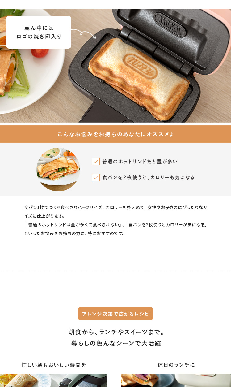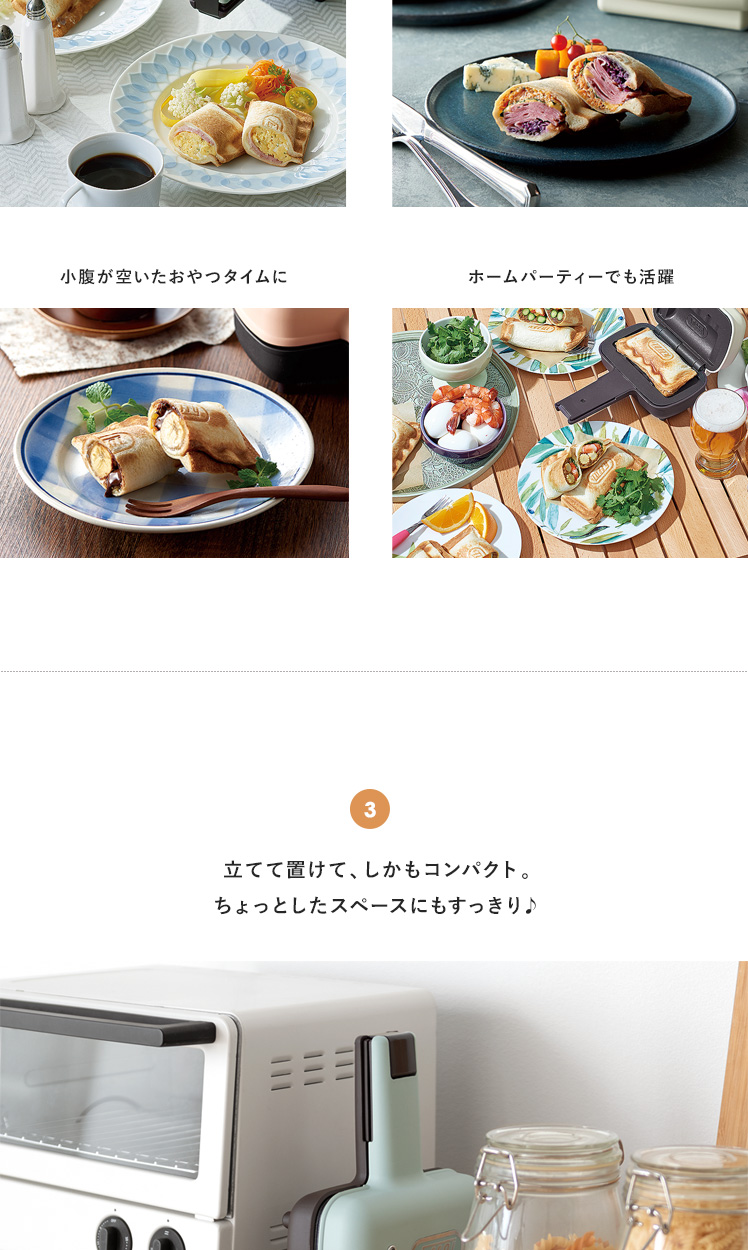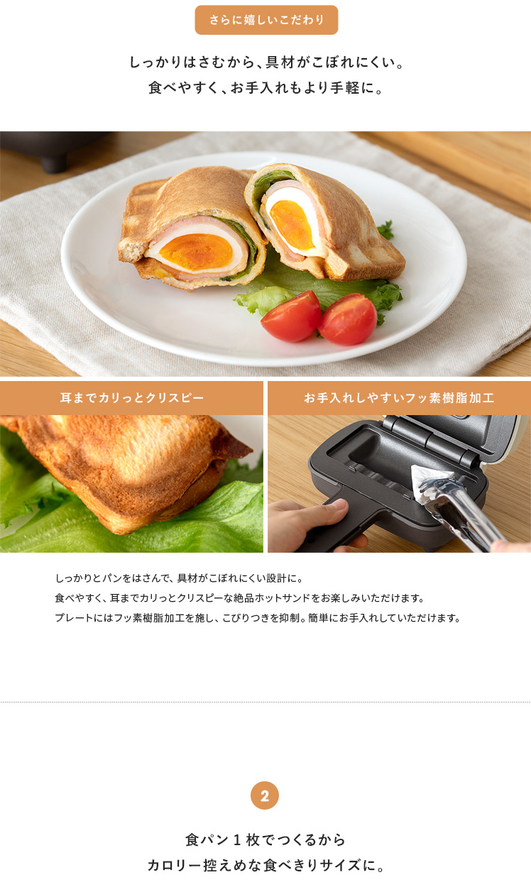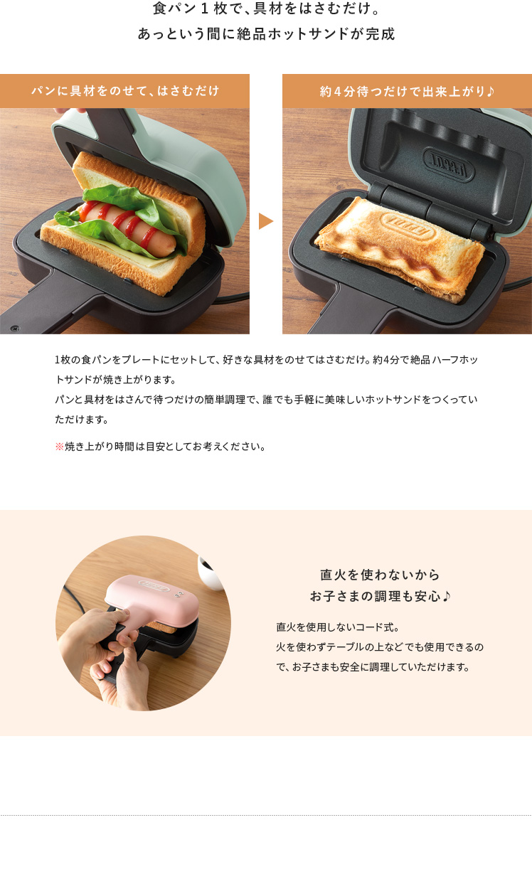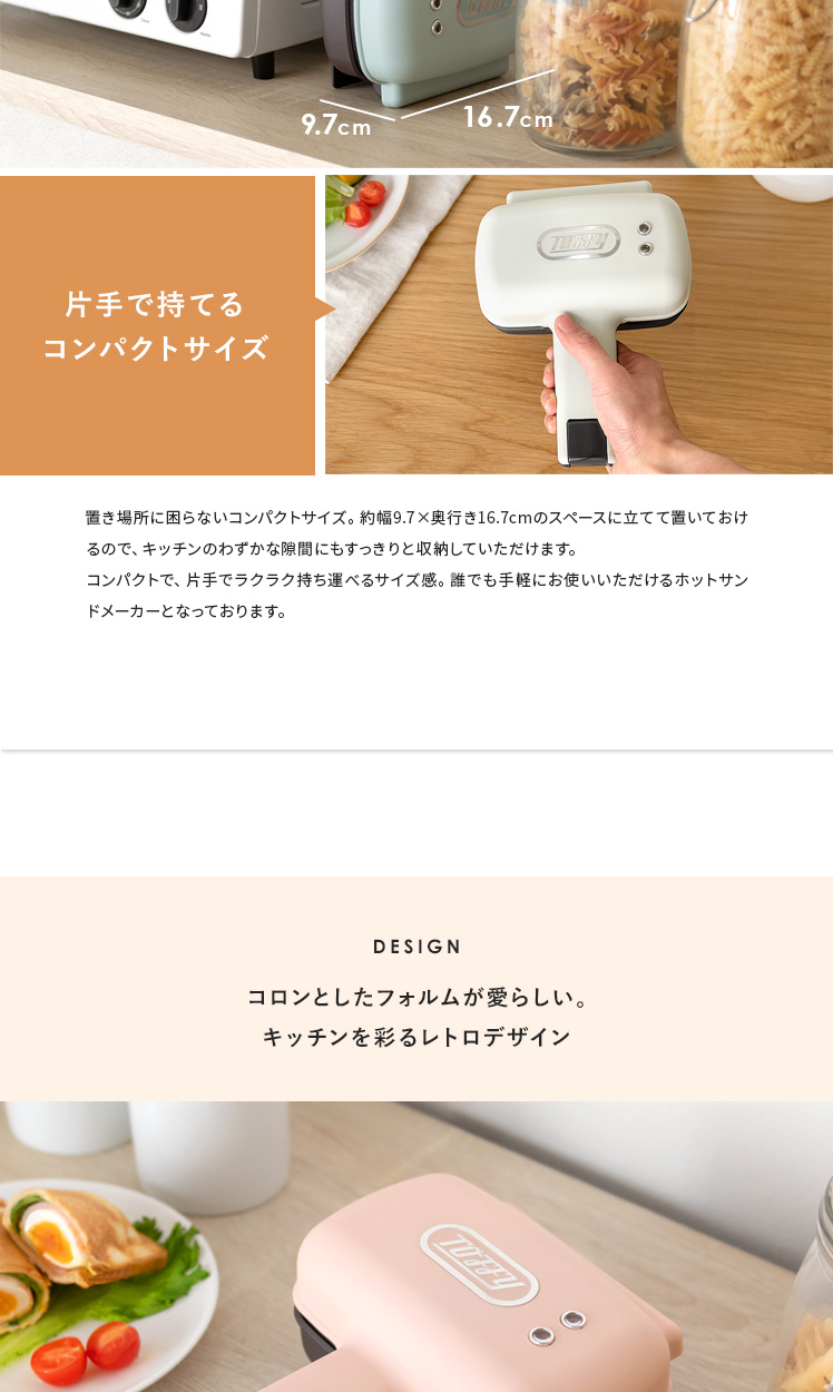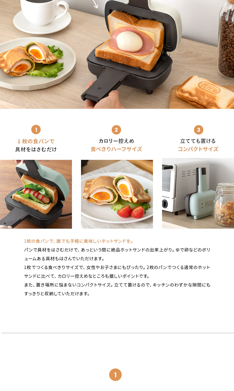 ハーフホットサンドメーカー Toffy〔トフィー 〕/1枚の食パンで、誰でも手軽に美味しいホットサンドを。パンで具材をはさむだけで、あっという間に絶品ホットサンドの出来上がり。ゆで卵などのボリュームある具材もはさんでいただけます。1枚でつくる食べきりサイズで、女性やお子さまにもぴったり。2枚のパンでつくる通常のホットサンドに比べて、カロリー控えめなところも嬉しいポイントです。また、置き場所に悩まないコンパクトサイズ。立てて置けるので、キッチンのわずかな隙間にもすっきりと収納していただけます。