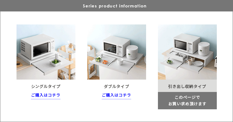 レンジ下スライドトレー Avenir〔アベニール〕 引き出し収納タイプ/片手で引き出すだけで、“収納”&“ちょい置き”スペースに。2つのトレーは、料理の盛り付けや下準備、調理器具・食材の仮置きなど、調理のさまざまなシーンで大活躍。引き出し収納には、散らかりがちな小物をまとめて、キッチンをすっきりと整頓していただけます。さらに、レンジの下に設置するだけなので、追加のスペースは一切不要。備え付けのカウンターやラックなど設備はそのままで作業スペースと収納が広がり、調理効率もグッと高まります。