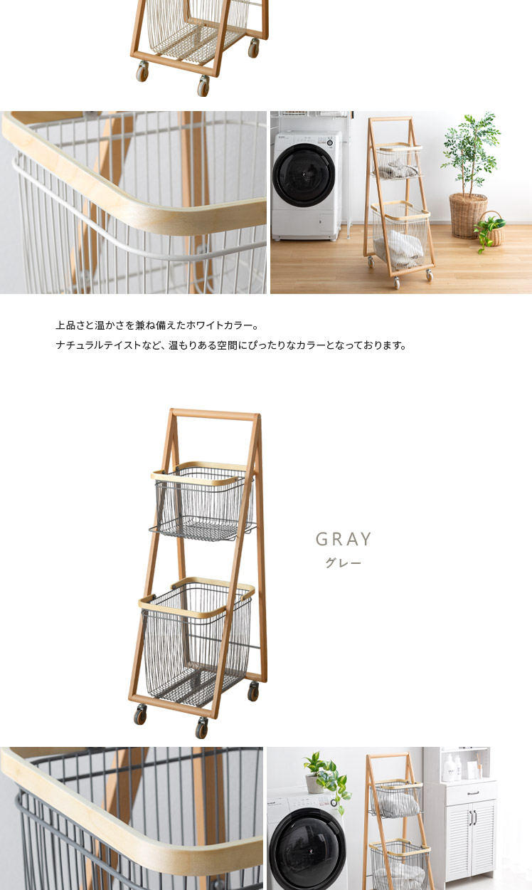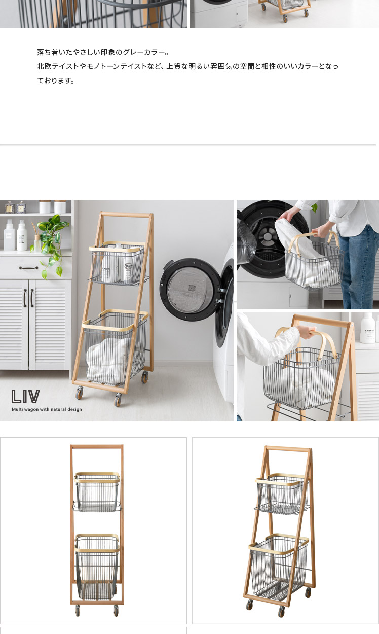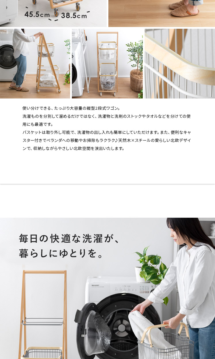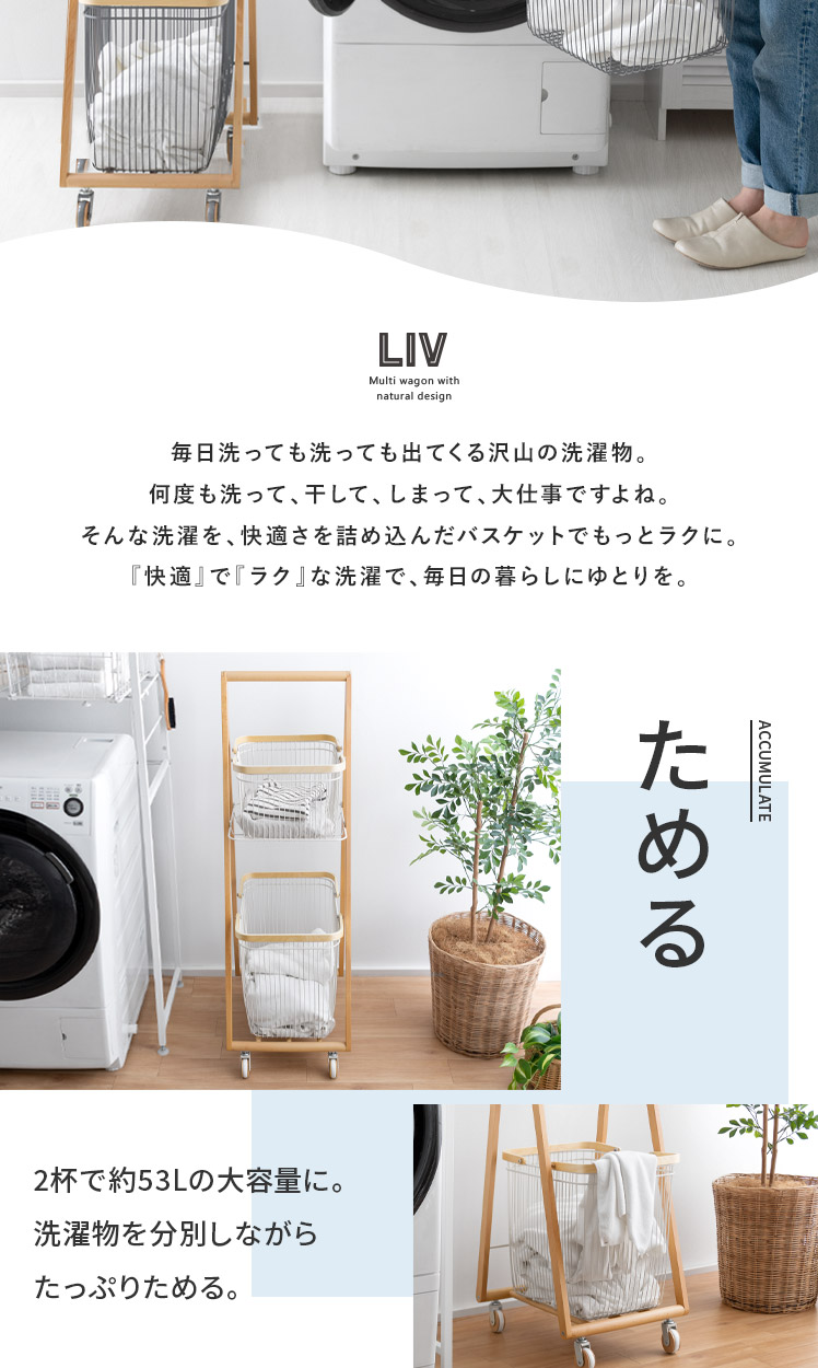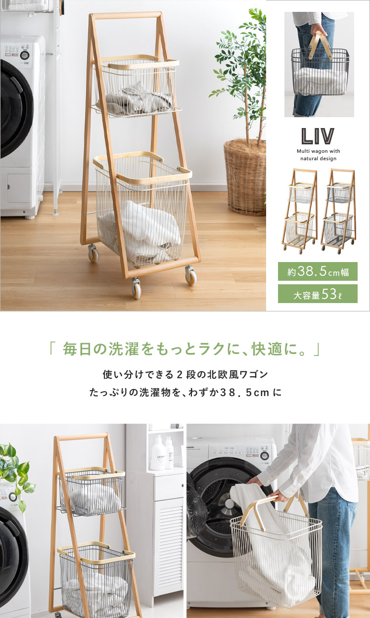 キャリーバスケットワゴン LIV〔リヴ〕 Lサイズ/使い分けできる、たっぷり大容量の縦型2段式ワゴン。洗濯ものを分別して溜めるだけではなく、洗濯物と洗剤のストックやタオルなどを分けての使用にも最適です。バスケットは取り外し可能で、洗濯物の出し入れも簡単にしていただけます。また、便利なキャスター付きでベランダへの移動やお掃除もラクラク♪天然木×スチールの愛らしい北欧デザインで、収納しながらやさしい北欧空間を演出いたします。