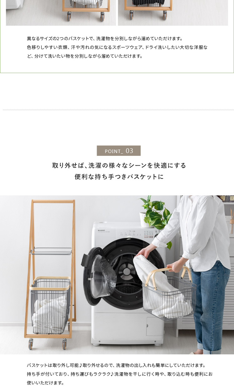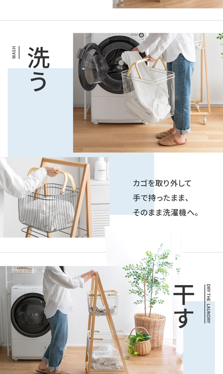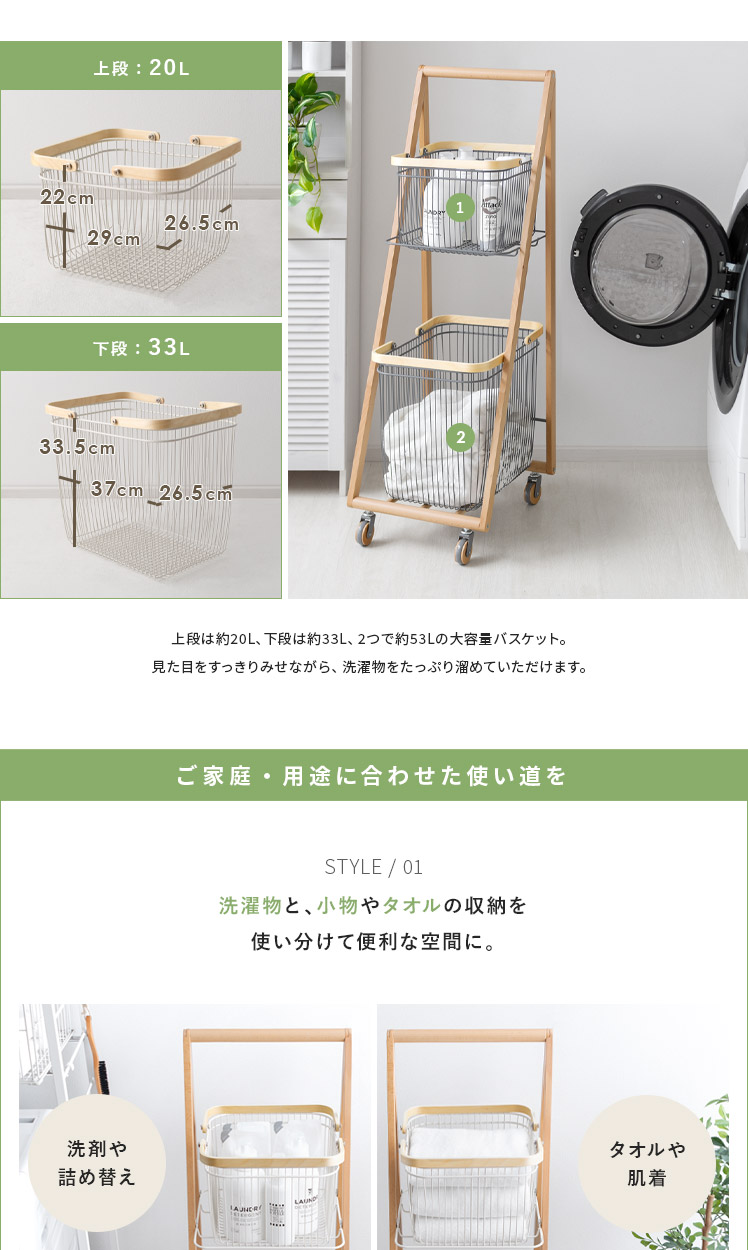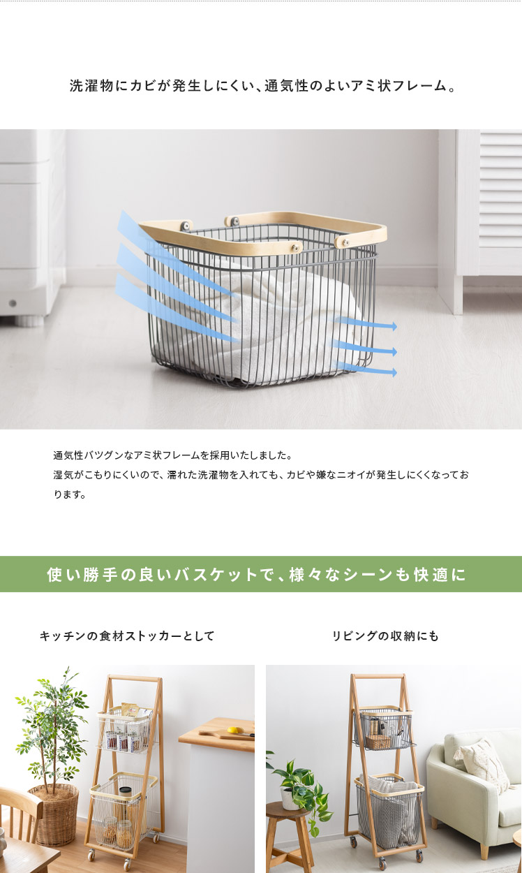 キャリーバスケットワゴン LIV〔リヴ〕 Lサイズ/使い分けできる、たっぷり大容量の縦型2段式ワゴン。洗濯ものを分別して溜めるだけではなく、洗濯物と洗剤のストックやタオルなどを分けての使用にも最適です。バスケットは取り外し可能で、洗濯物の出し入れも簡単にしていただけます。また、便利なキャスター付きでベランダへの移動やお掃除もラクラク♪天然木×スチールの愛らしい北欧デザインで、収納しながらやさしい北欧空間を演出いたします。