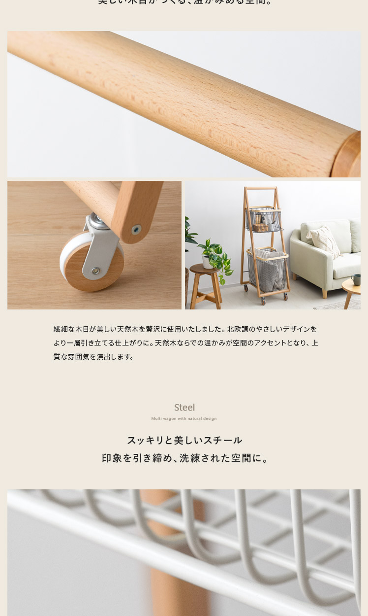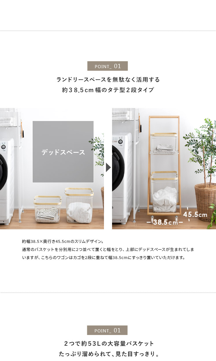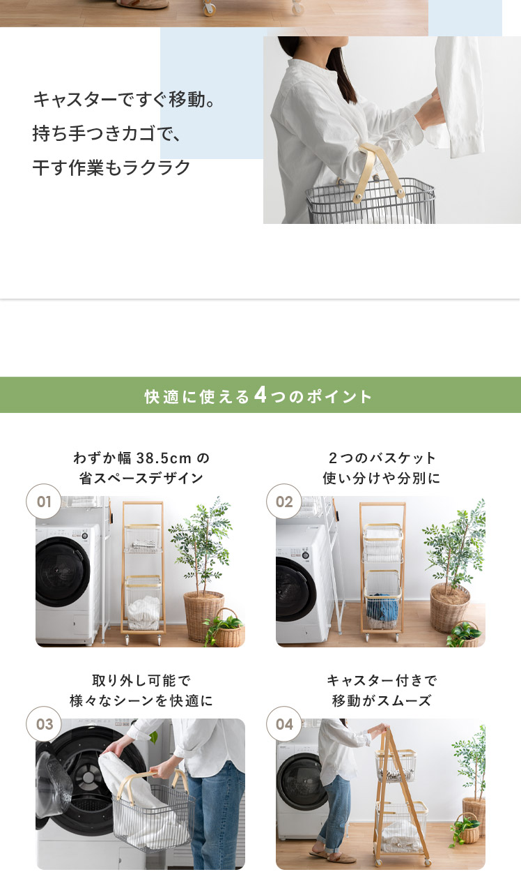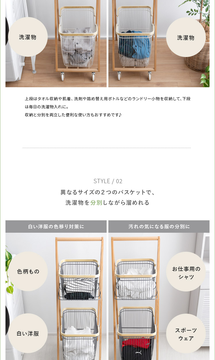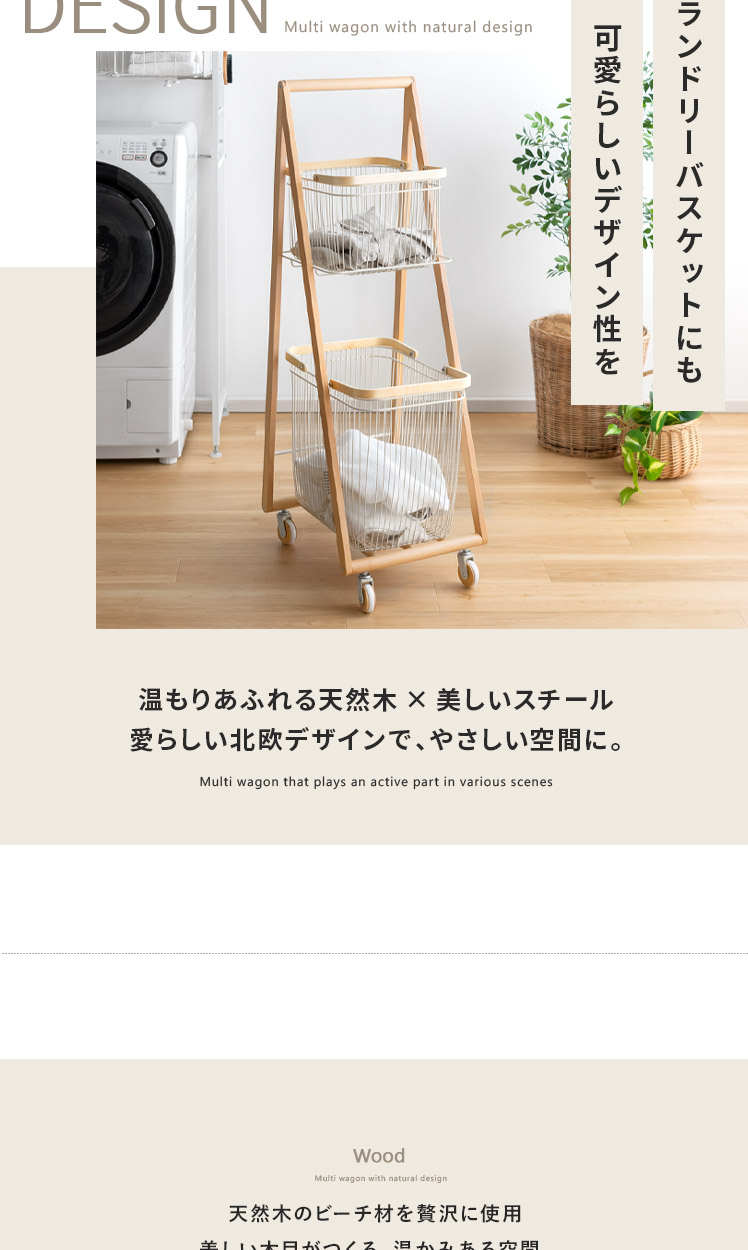 キャリーバスケットワゴン LIV〔リヴ〕 Lサイズ/使い分けできる、たっぷり大容量の縦型2段式ワゴン。洗濯ものを分別して溜めるだけではなく、洗濯物と洗剤のストックやタオルなどを分けての使用にも最適です。バスケットは取り外し可能で、洗濯物の出し入れも簡単にしていただけます。また、便利なキャスター付きでベランダへの移動やお掃除もラクラク♪天然木×スチールの愛らしい北欧デザインで、収納しながらやさしい北欧空間を演出いたします。