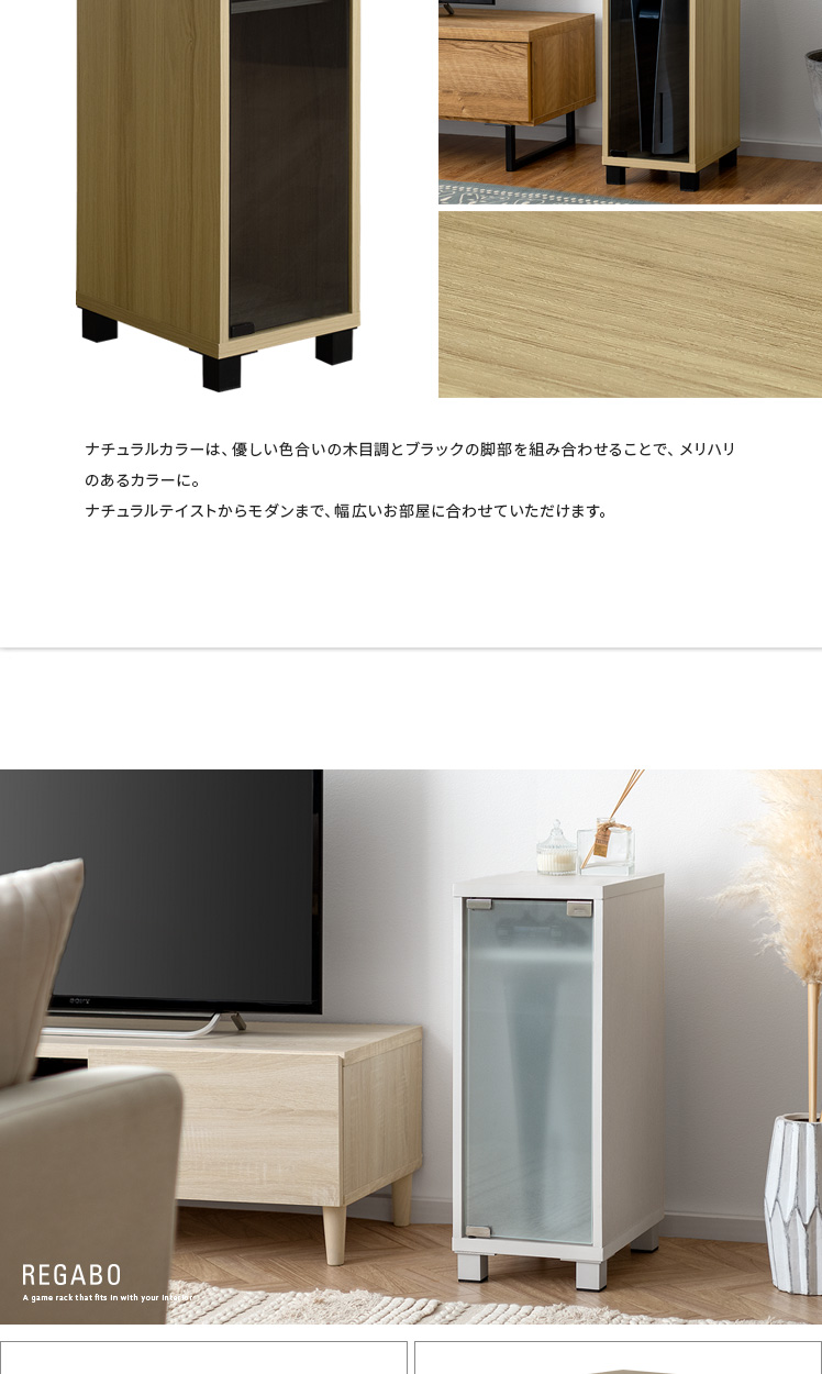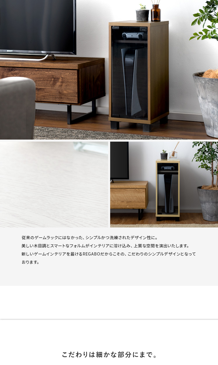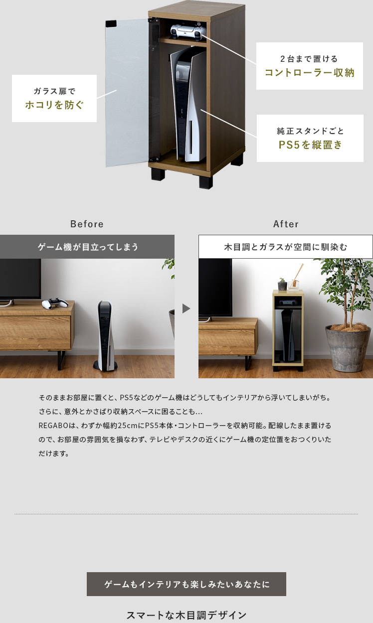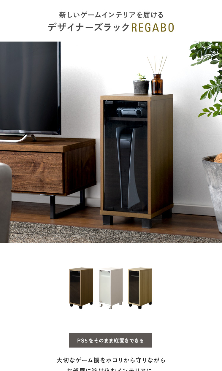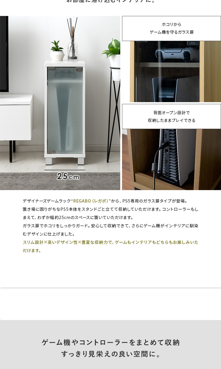 デザイナーズゲームラック REGABO〔レガボ〕ガラス扉タイプ/デザイナーズゲームラック“REGABO(レガボ)”から、PS5専用のガラス扉タイプが登場。置き場に困りがちなPS5本体をスタンドごと立てて収納していただけます。コントローラーもしまえて、わずか幅約25cmのスペースに置いていただけます。ガラス扉でホコリをしっかりガード。安心して収納できて、さらにゲーム機がインテリアに馴染むデザインに仕上げました。スリム設計×高いデザイン性×豊富な収納力で、ゲームもインテリアもどちらもお楽しみいただけます。