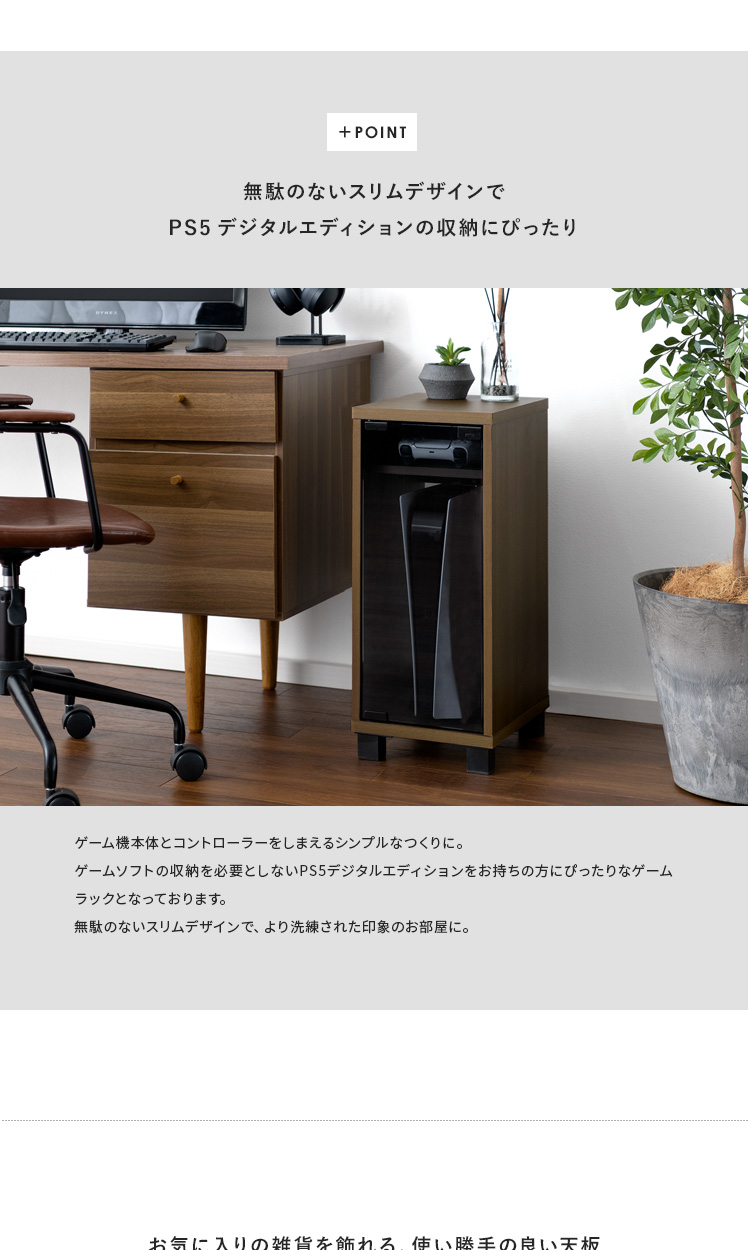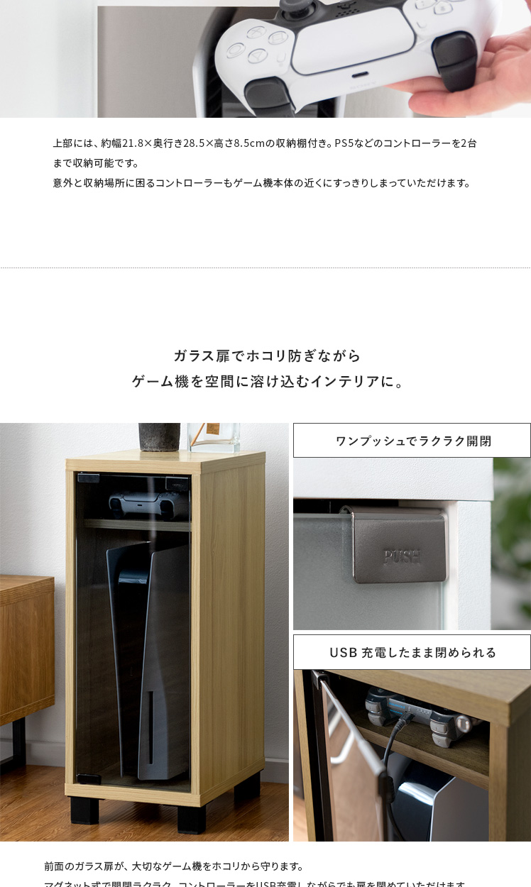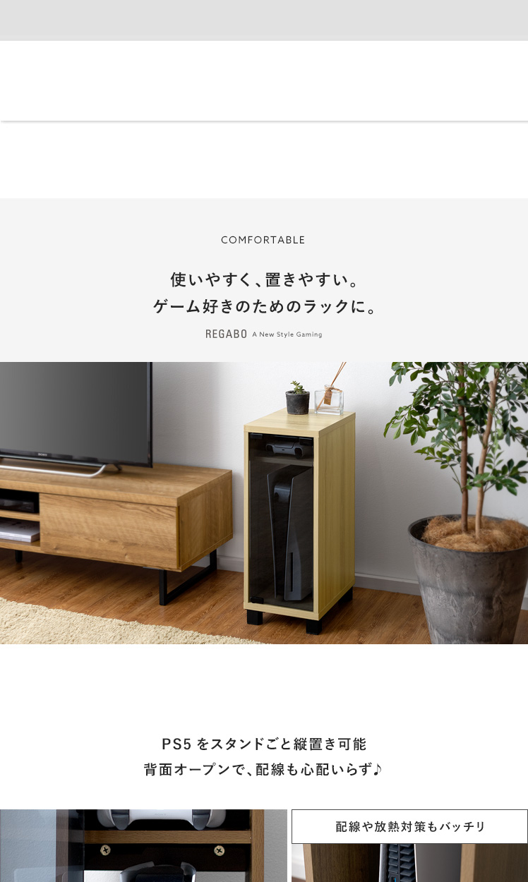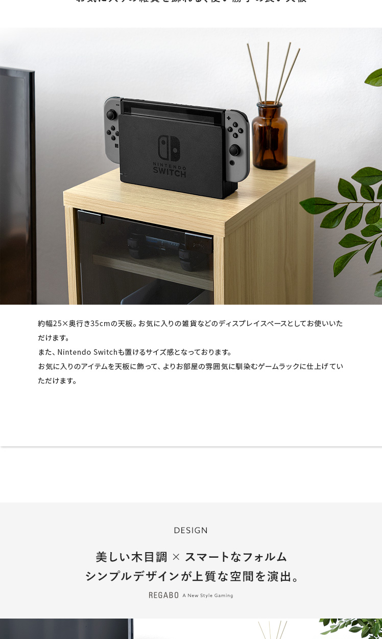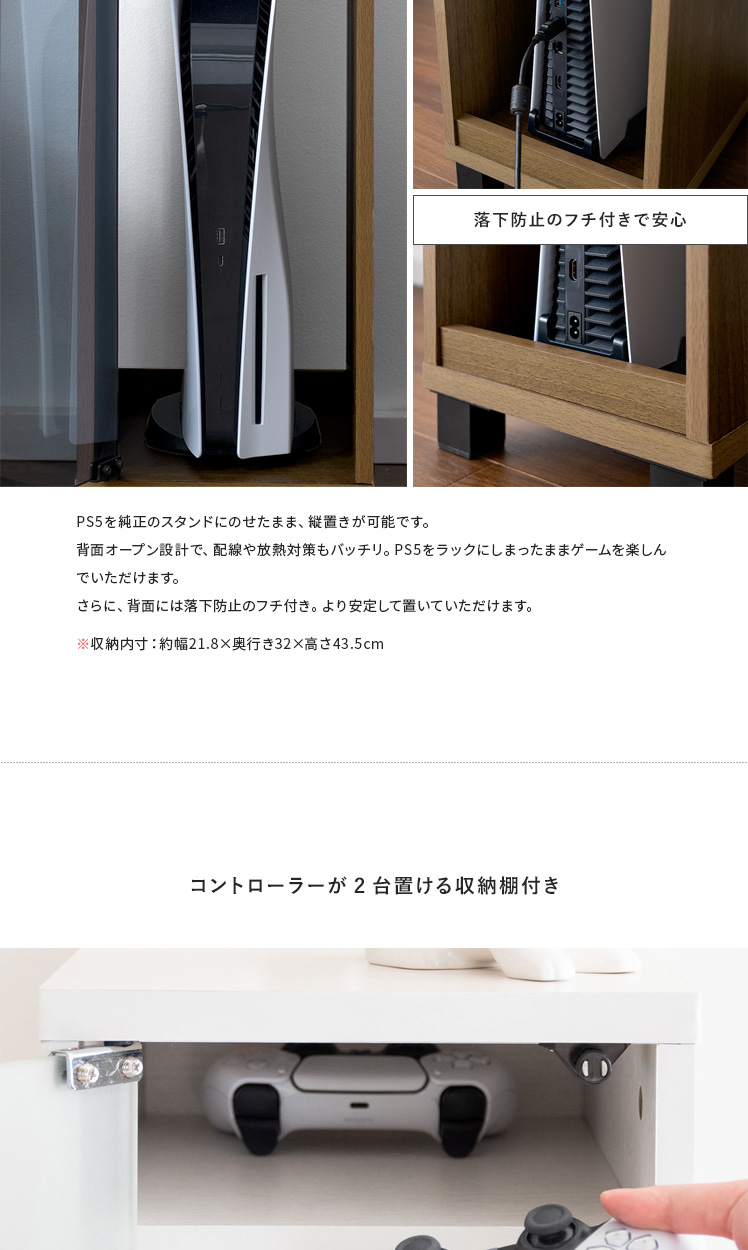 デザイナーズゲームラック REGABO〔レガボ〕ガラス扉タイプ/デザイナーズゲームラック“REGABO(レガボ)”から、PS5専用のガラス扉タイプが登場。置き場に困りがちなPS5本体をスタンドごと立てて収納していただけます。コントローラーもしまえて、わずか幅約25cmのスペースに置いていただけます。ガラス扉でホコリをしっかりガード。安心して収納できて、さらにゲーム機がインテリアに馴染むデザインに仕上げました。スリム設計×高いデザイン性×豊富な収納力で、ゲームもインテリアもどちらもお楽しみいただけます。
