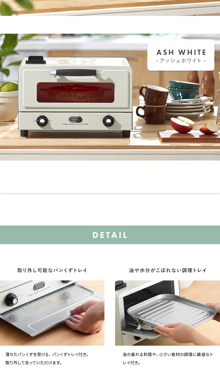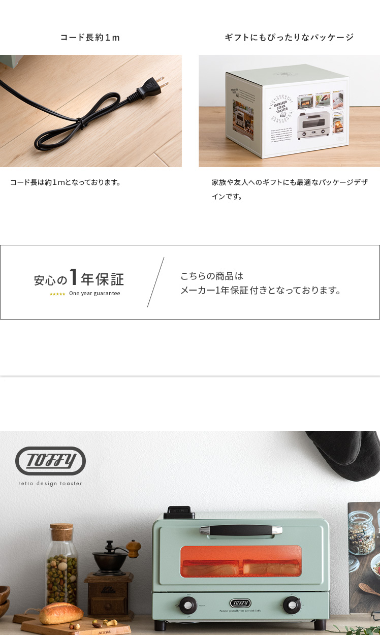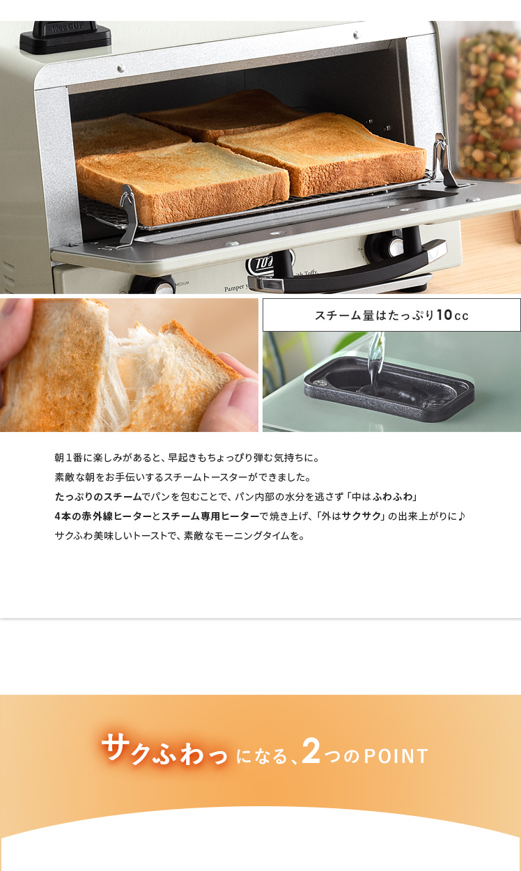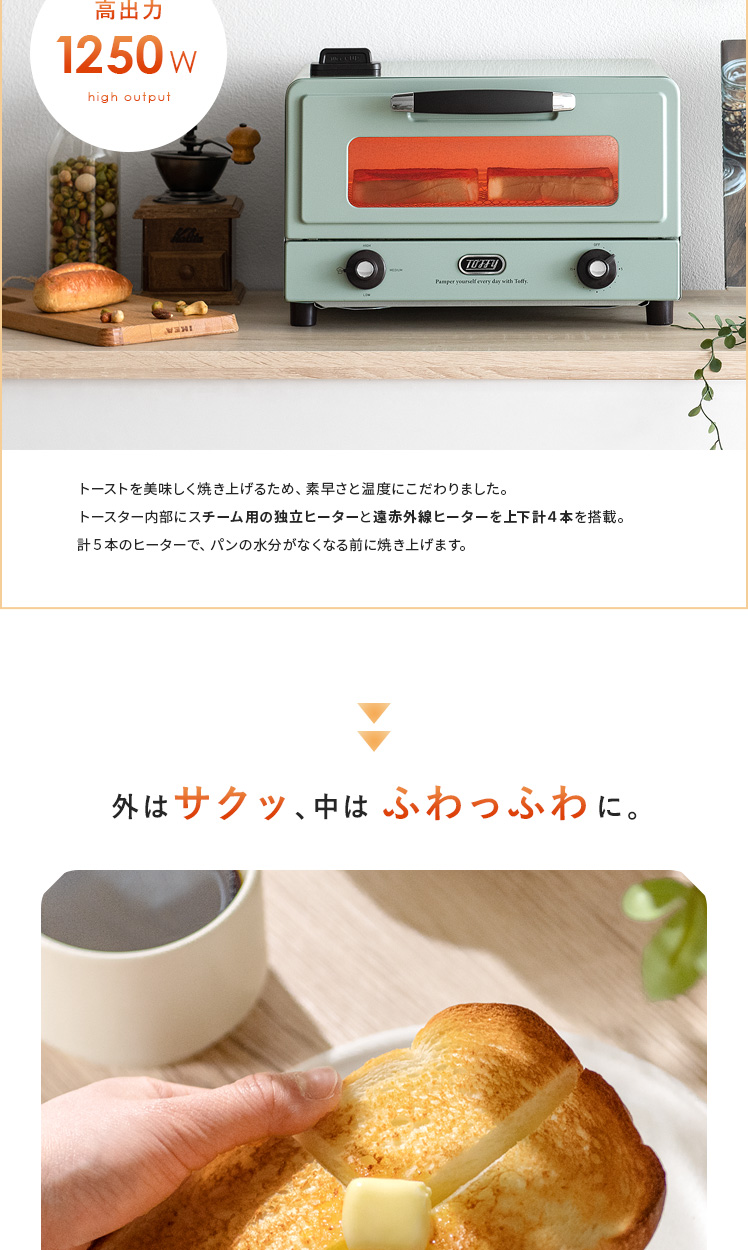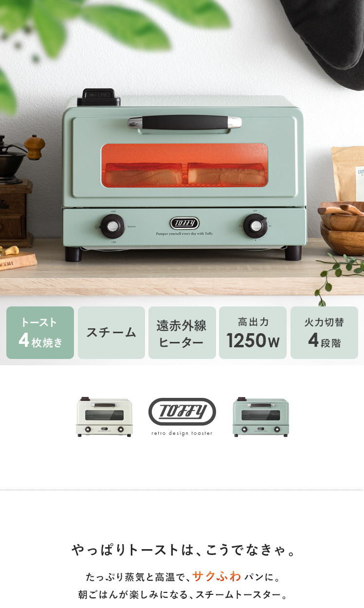 遠赤スチームトースター Toffy〔トフィー〕/朝1番に楽しみがあると、早起きもちょっぴり弾む気持ちに。素敵な朝をお手伝いするスチームトースターができました。たっぷりのスチームでパンを包むことで、パン内部の水分を逃さず「中はふわふわ」4本の赤外線ヒーターとスチーム専用ヒーターで焼き上げ、「外はサクサク」の出来上がりに♪サクふわ美味しいトーストで、素敵なモーニングタイムを。