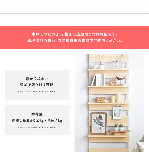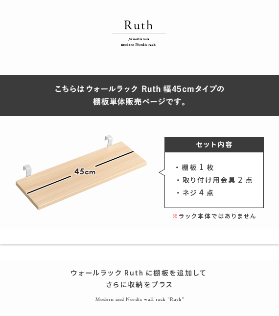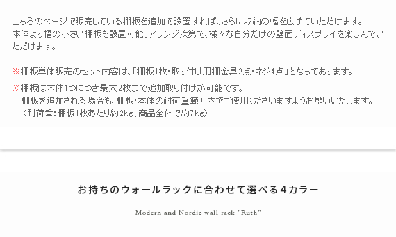 こちらの商品は、「ウォールシェルフ Ruth (ルース)」の追加用棚板パーツ単体となります。ラック本体ではありませんので、予めご了承の程よろしくお願いいたします。