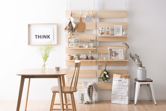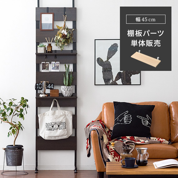 壁面ラック ウォールシェルフ Ruth(ルース) 棚板単体販売 幅45cmタイプ / 壁際のほんの少しのスペースを利用して、置く収納・掛ける収納・ディスプレイ収納、3つの収納方法でお部屋を雰囲気ある空間にする壁面ラックRuth(ルース)。突っ張り式を採用することで、穴をあける必要がなく、壁を傷つけたくない方や、賃貸のお部屋にお住まいの方にもオススメ。奥行きは約19.2cmと、省スペースなサイズ設計。壁面を利用することで、省スペースでありながら、マルチな収納が可能に。玄関・ダイニング・リビングなど、置く場所を選ばず、幅広いシーンに活躍致します。自由度の高いレイアウトが可能な壁面ラックで、どのシーンに置いても便利で、見栄えの良い快適な空間作りをお楽しみいただけます♪【幅45cmタイプ】