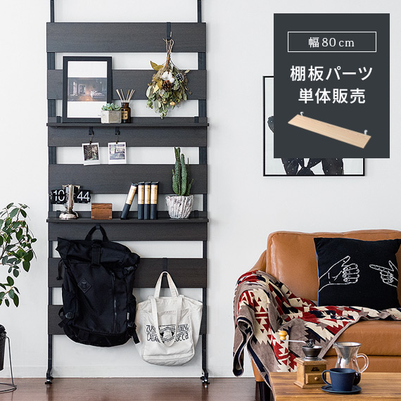 壁面ラック ウォールシェルフ Ruth(ルース) 棚板単体販売 幅80cmタイプ / 壁際のほんの少しのスペースを利用して、置く収納・掛ける収納・ディスプレイ収納、3つの収納方法でお部屋を雰囲気ある空間にする壁面ラックRuth(ルース)。突っ張り式を採用することで、穴をあける必要がなく、壁を傷つけたくない方や、賃貸のお部屋にお住まいの方にもオススメ。奥行きは約19.2cmと、省スペースなサイズ設計。壁面を利用することで、省スペースでありながら、マルチな収納が可能に。玄関・ダイニング・リビングなど、置く場所を選ばず、幅広いシーンに活躍致します。自由度の高いレイアウトが可能な壁面ラックで、どのシーンに置いても便利で、見栄えの良い快適な空間作りをお楽しみいただけます♪【幅80cmタイプ】