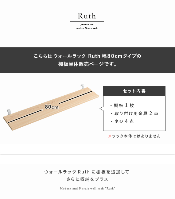 こちらの商品は、「ウォールシェルフ Ruth (ルース)」の追加用棚板パーツ単体となります。ラック本体ではありませんので、予めご了承の程よろしくお願いいたします。