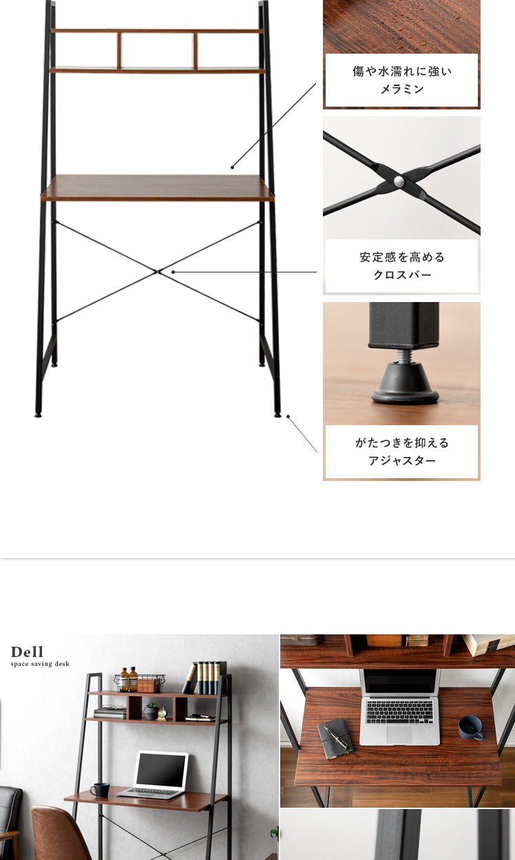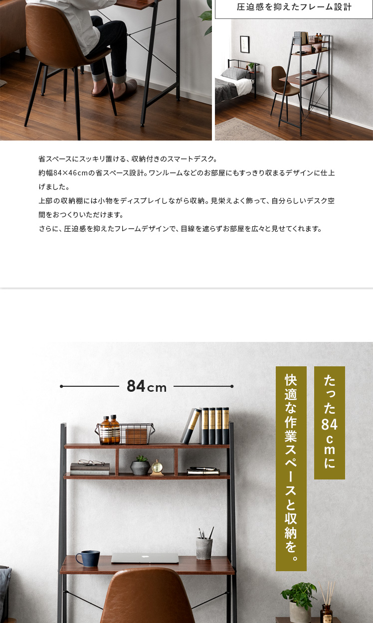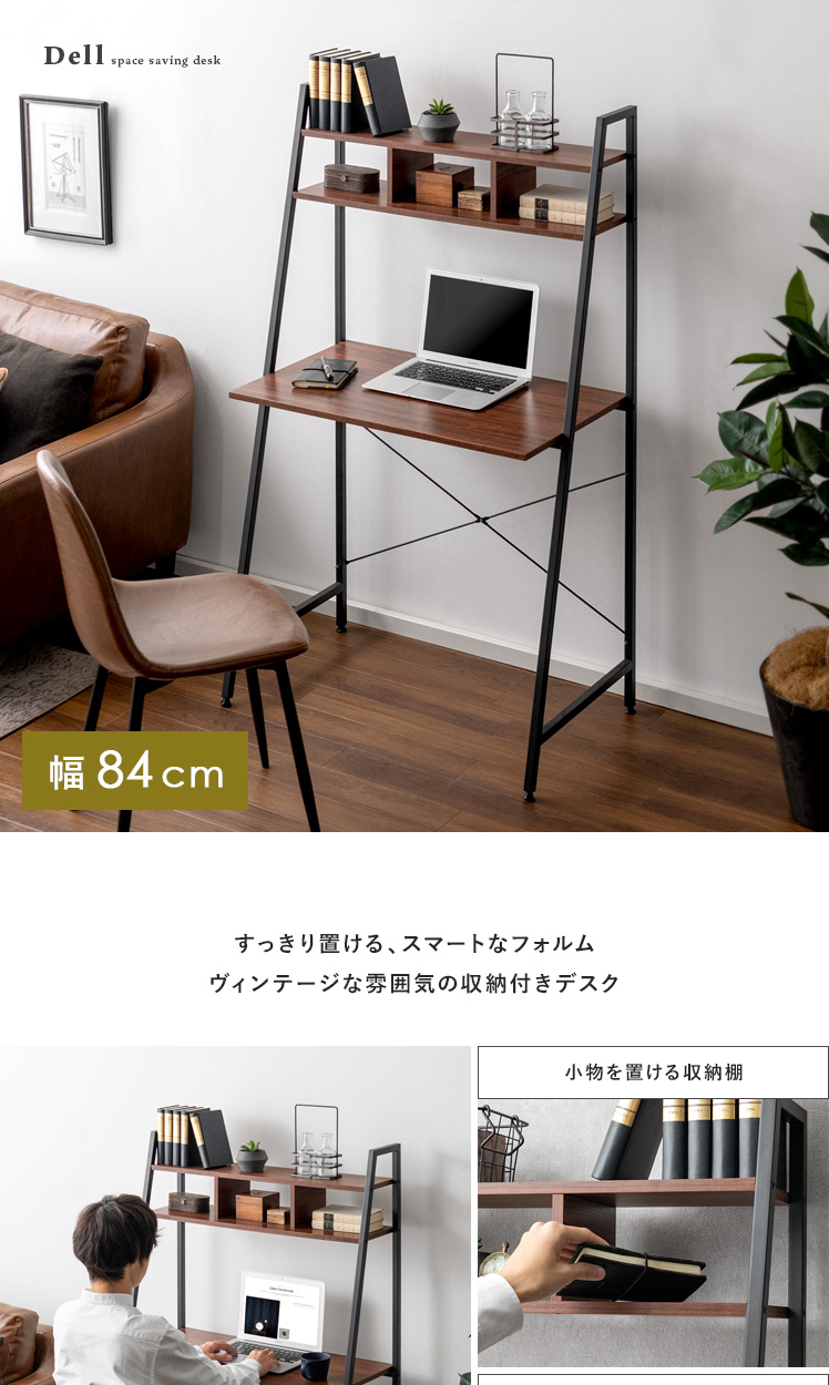 ハイタイプデスク Dell(デル)/省スペースにスッキリ置ける、収納付きのスマートデスク。約幅84×46cmの省スペース設計。ワンルームなどのお部屋にもすっきり収まるデザインに仕上げました。上部の収納棚には小物をディスプレイしながら収納。見栄えよく飾って、自分らしいデスク空間をおつくりいただけます。さらに、圧迫感を抑えたフレームデザインで、目線を遮らずお部屋を広々と見せてくれます。