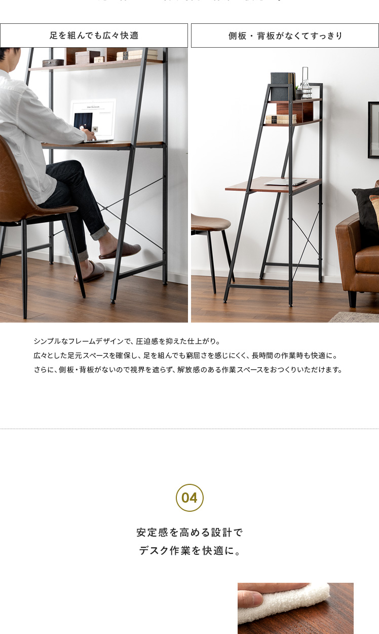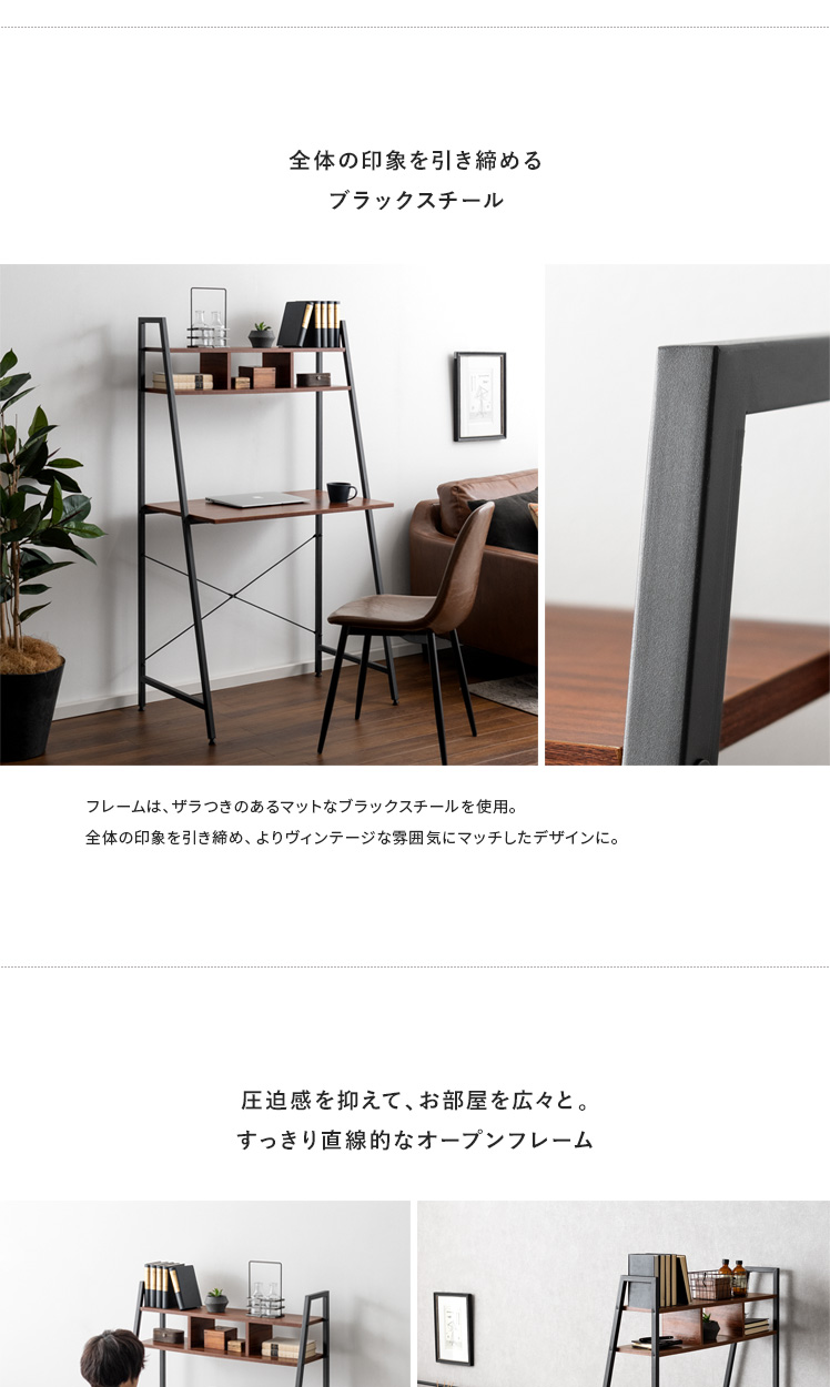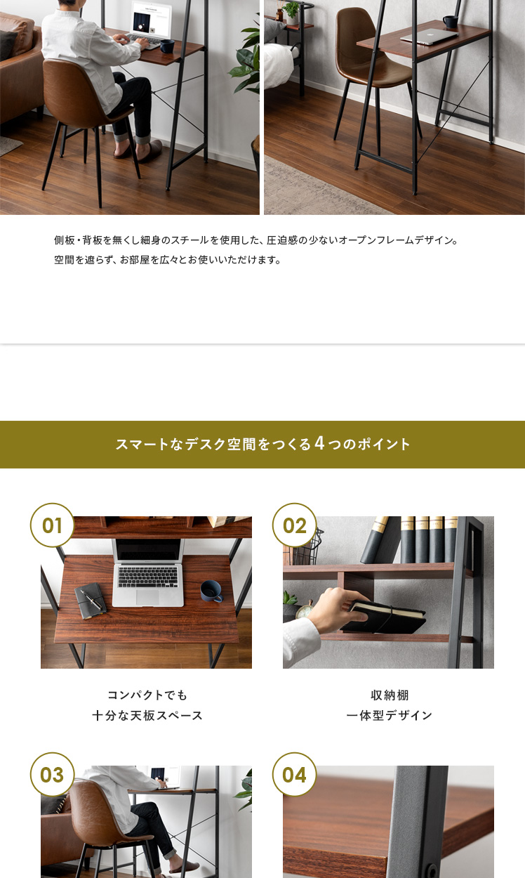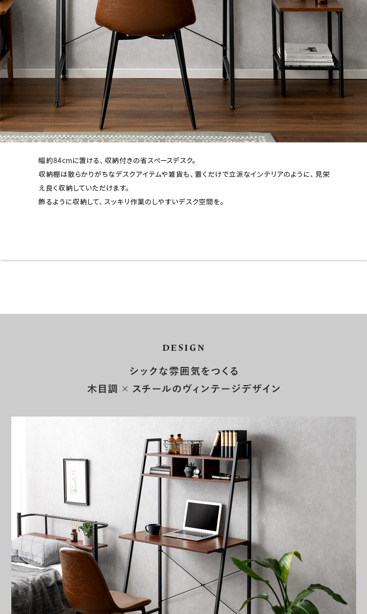 ハイタイプデスク Dell(デル)/省スペースにスッキリ置ける、収納付きのスマートデスク。約幅84×46cmの省スペース設計。ワンルームなどのお部屋にもすっきり収まるデザインに仕上げました。上部の収納棚には小物をディスプレイしながら収納。見栄えよく飾って、自分らしいデスク空間をおつくりいただけます。さらに、圧迫感を抑えたフレームデザインで、目線を遮らずお部屋を広々と見せてくれます。