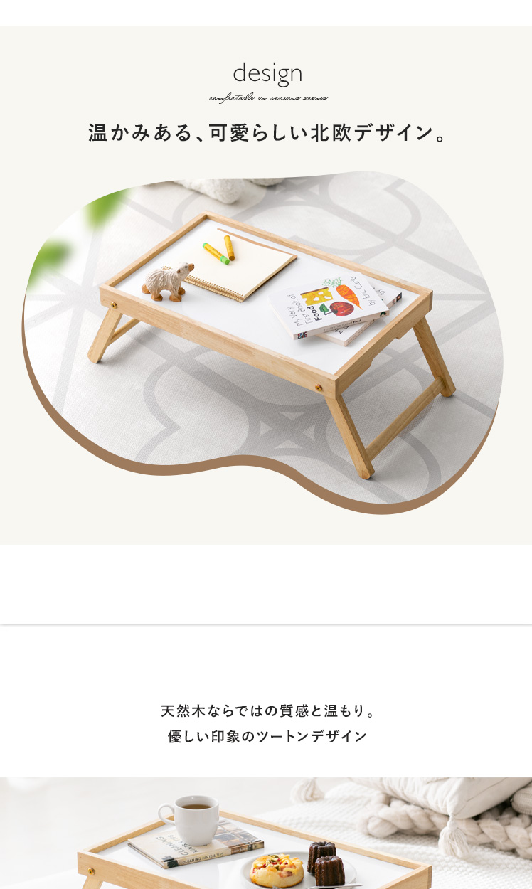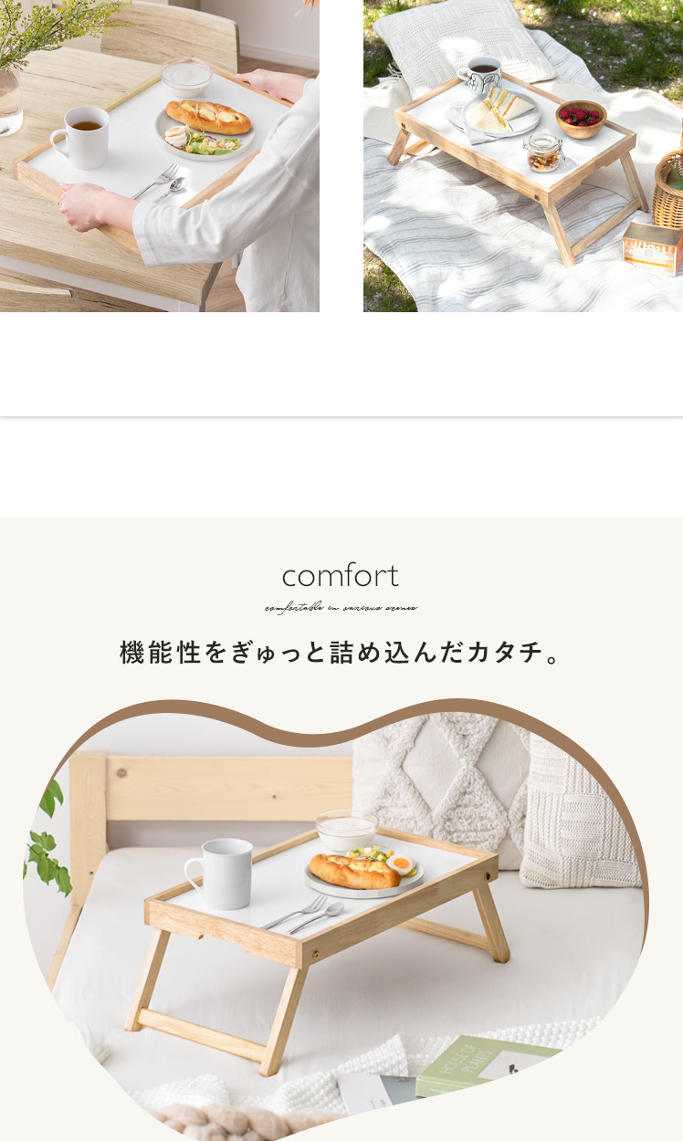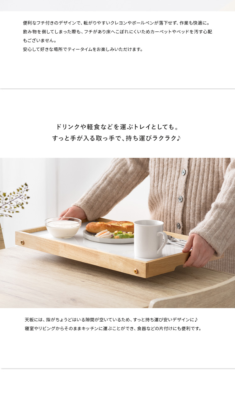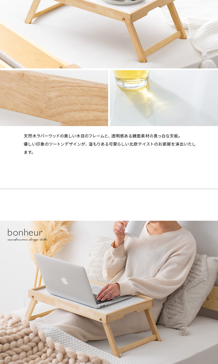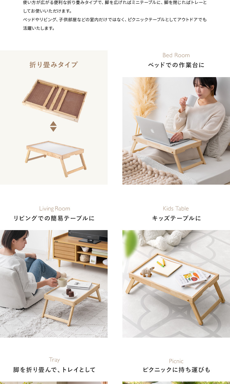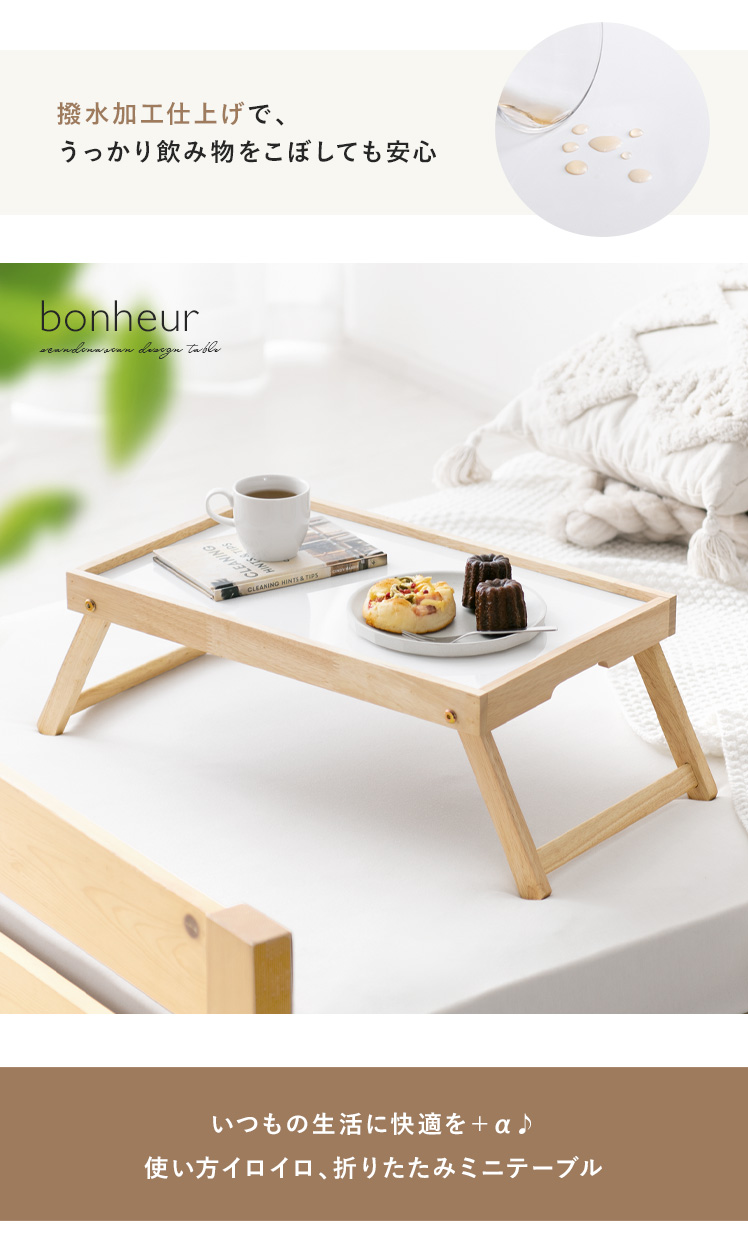 折りたたみミニテーブル bonheur〔ボヌール〕/使い方が広がる便利な折り畳みタイプで、脚を広げればミニテーブルに、脚を閉じればトレーとしてお使いいただけます。ベッドやリビング、子供部屋などの室内だけではなく、ピクニックテーブルとしてアウトドアでも活躍いたします。