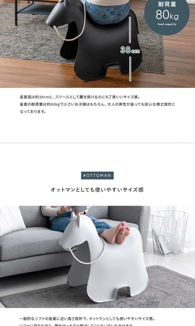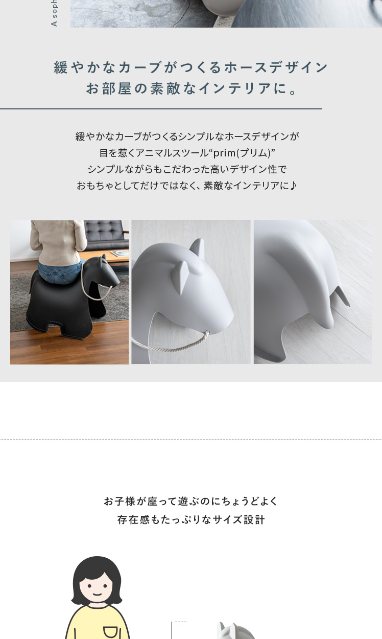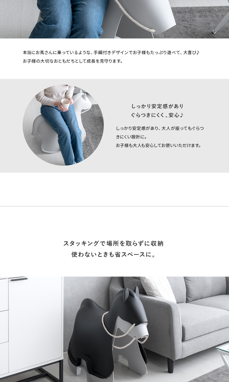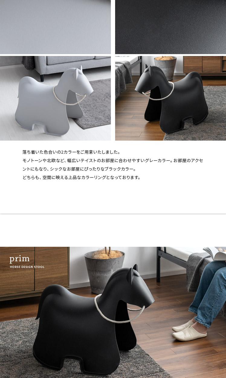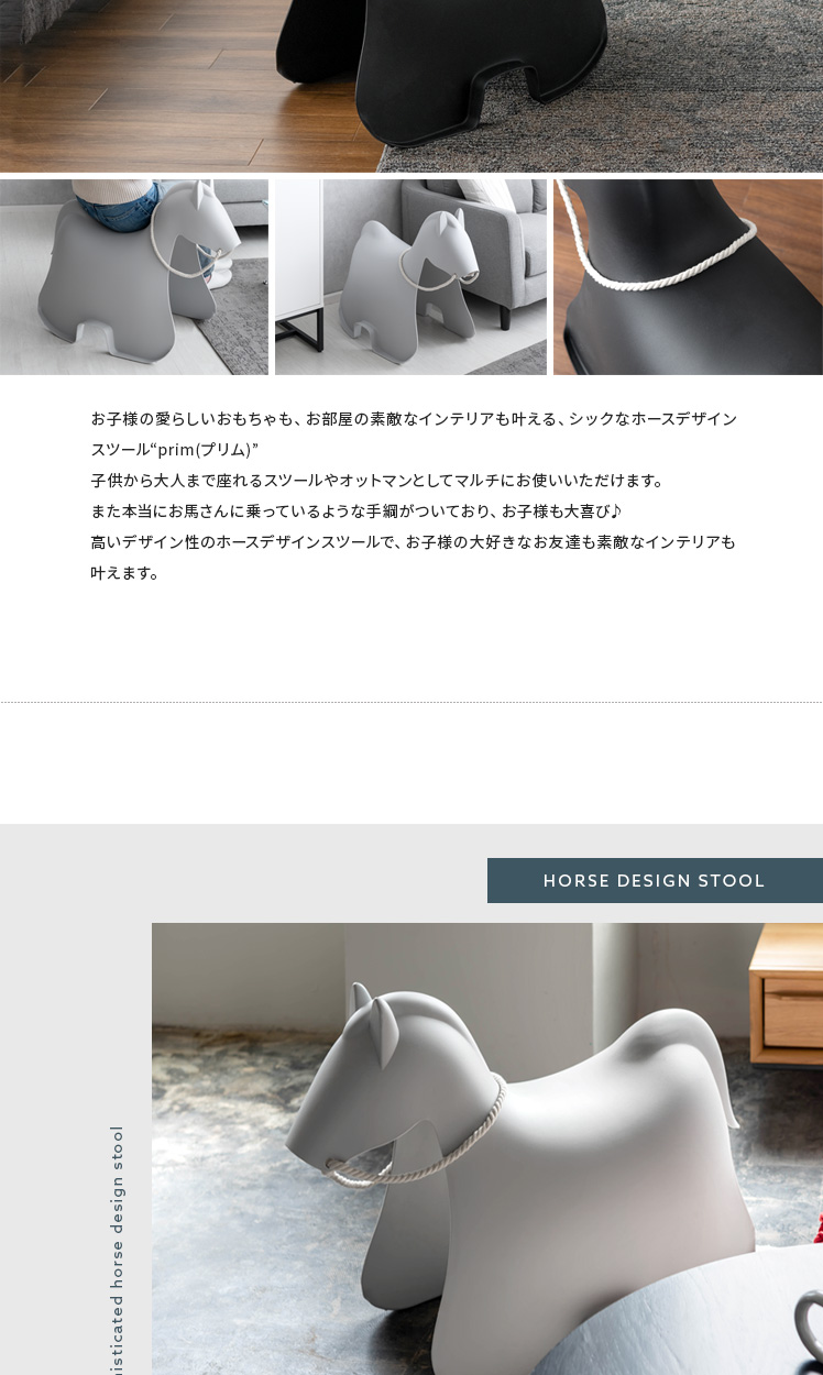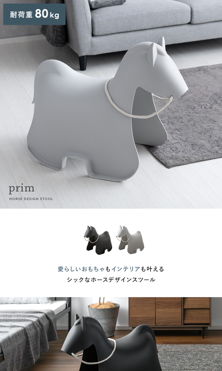 ホーススツール prim〔プリム〕/お子様の愛らしいおもちゃも、お部屋の素敵なインテリアも叶える、シックなホースデザインスツール“prim(プリム)”子供から大人まで座れるスツールやオットマンとしてマルチにお使いいただけます。また本当にお馬さんに乗っているような手綱がついており、お子様も大喜び♪高いデザイン性のホースデザインスツールで、お子様の大好きなお友達も素敵なインテリアも叶えます。