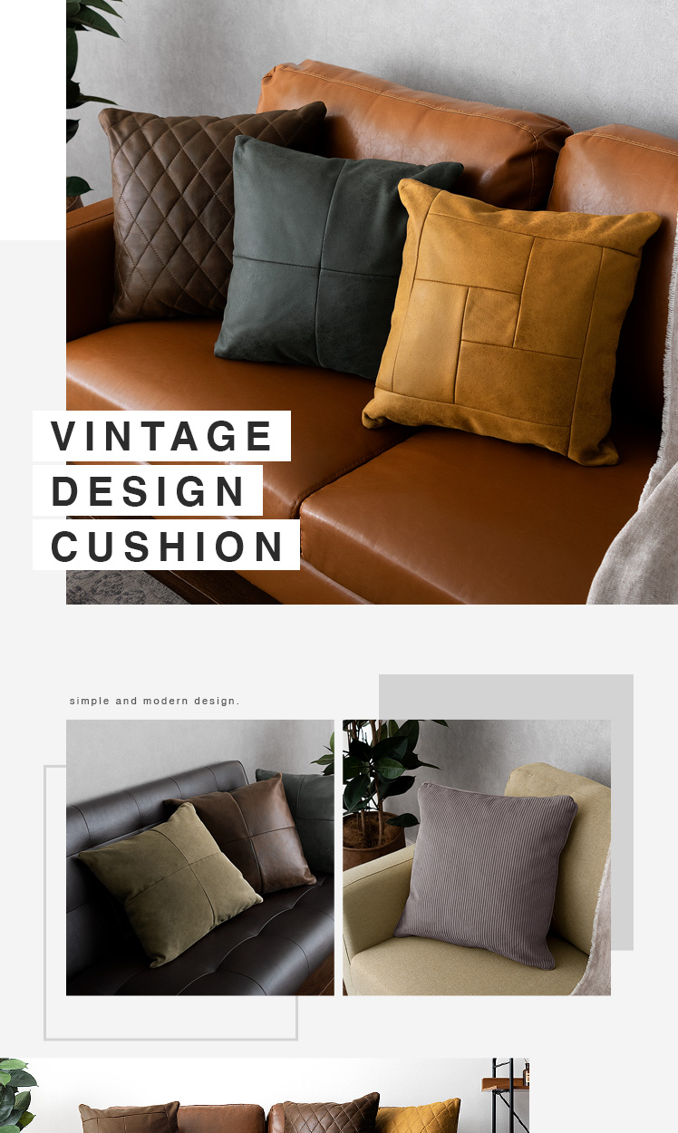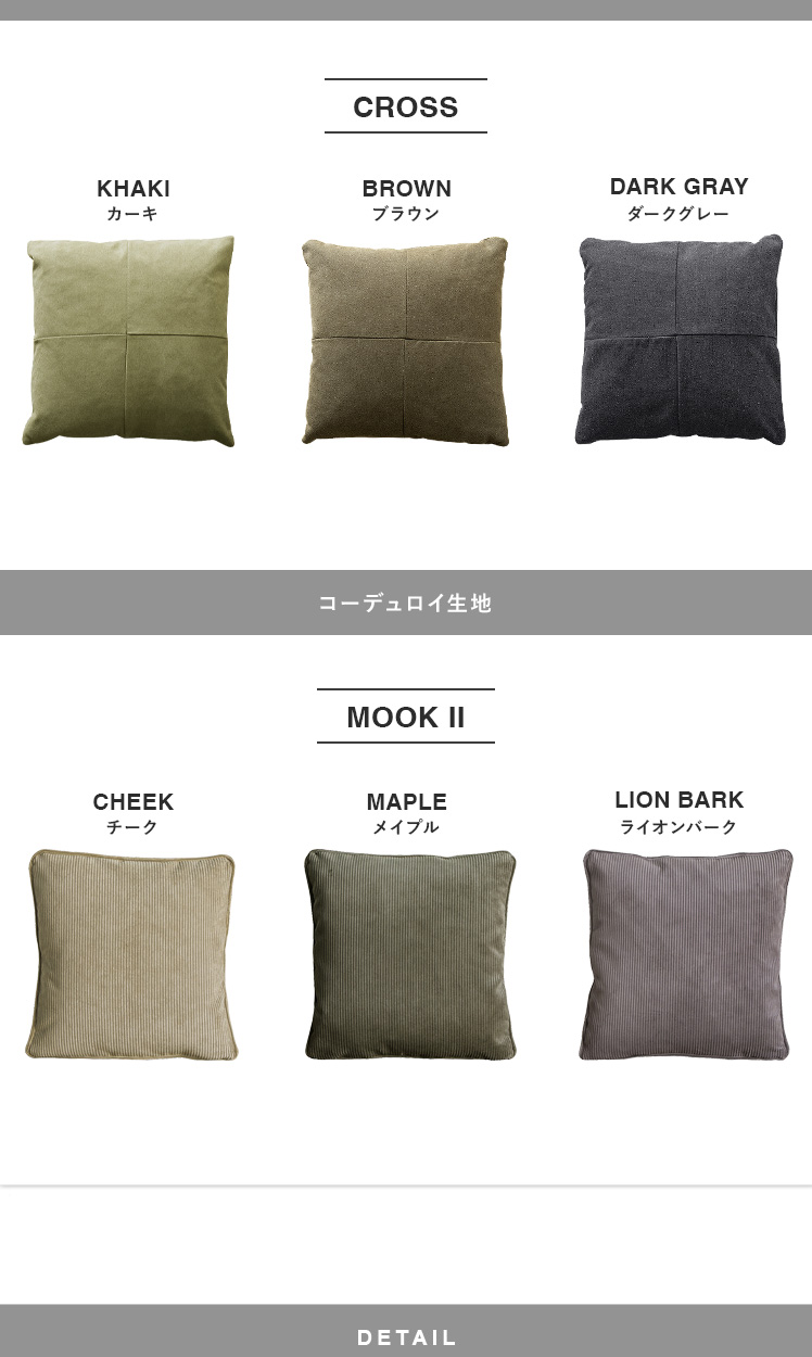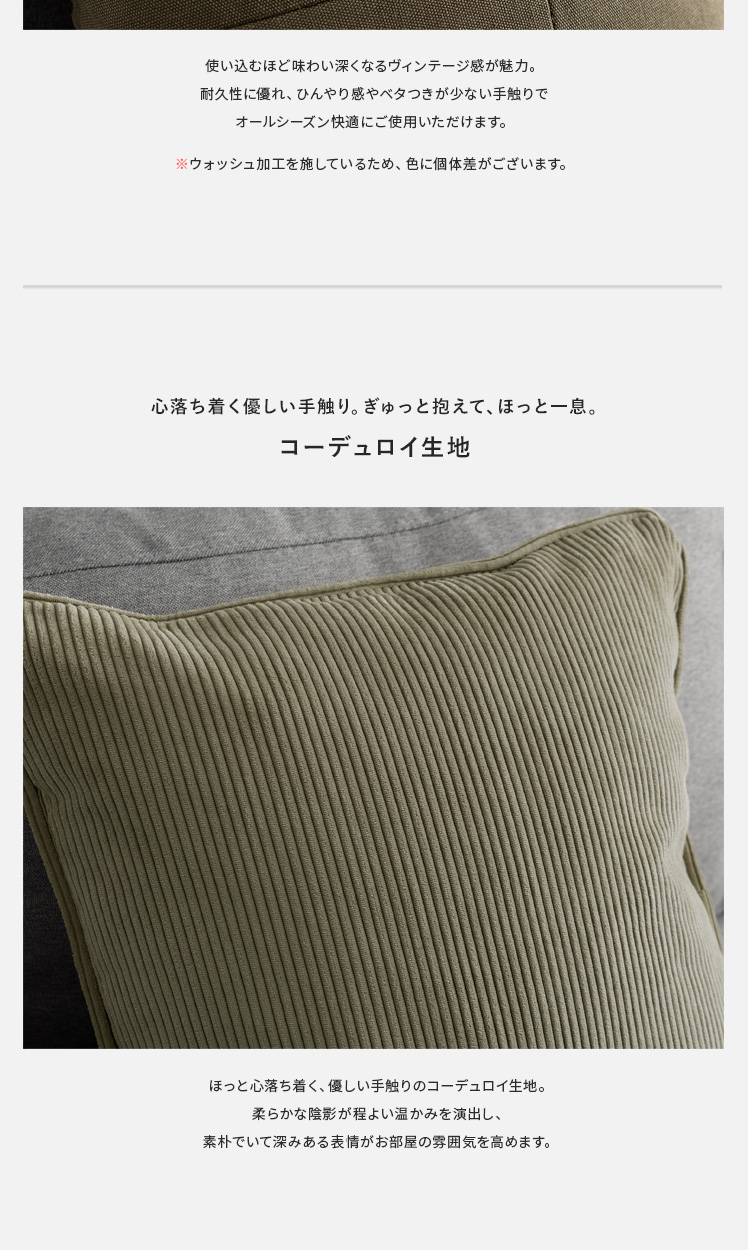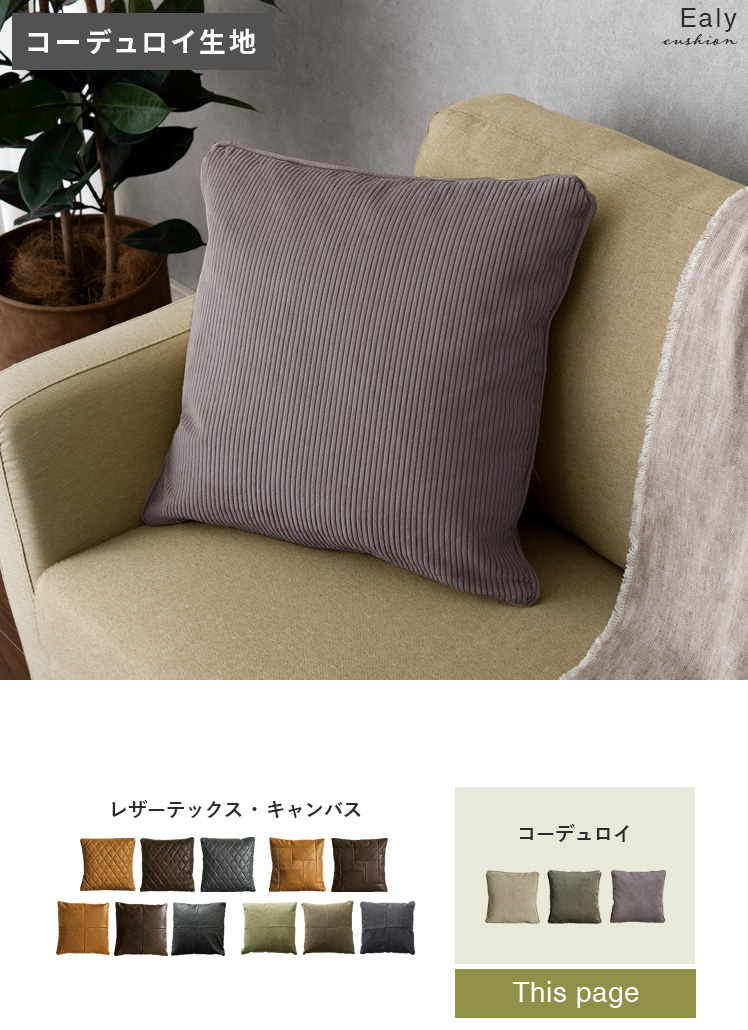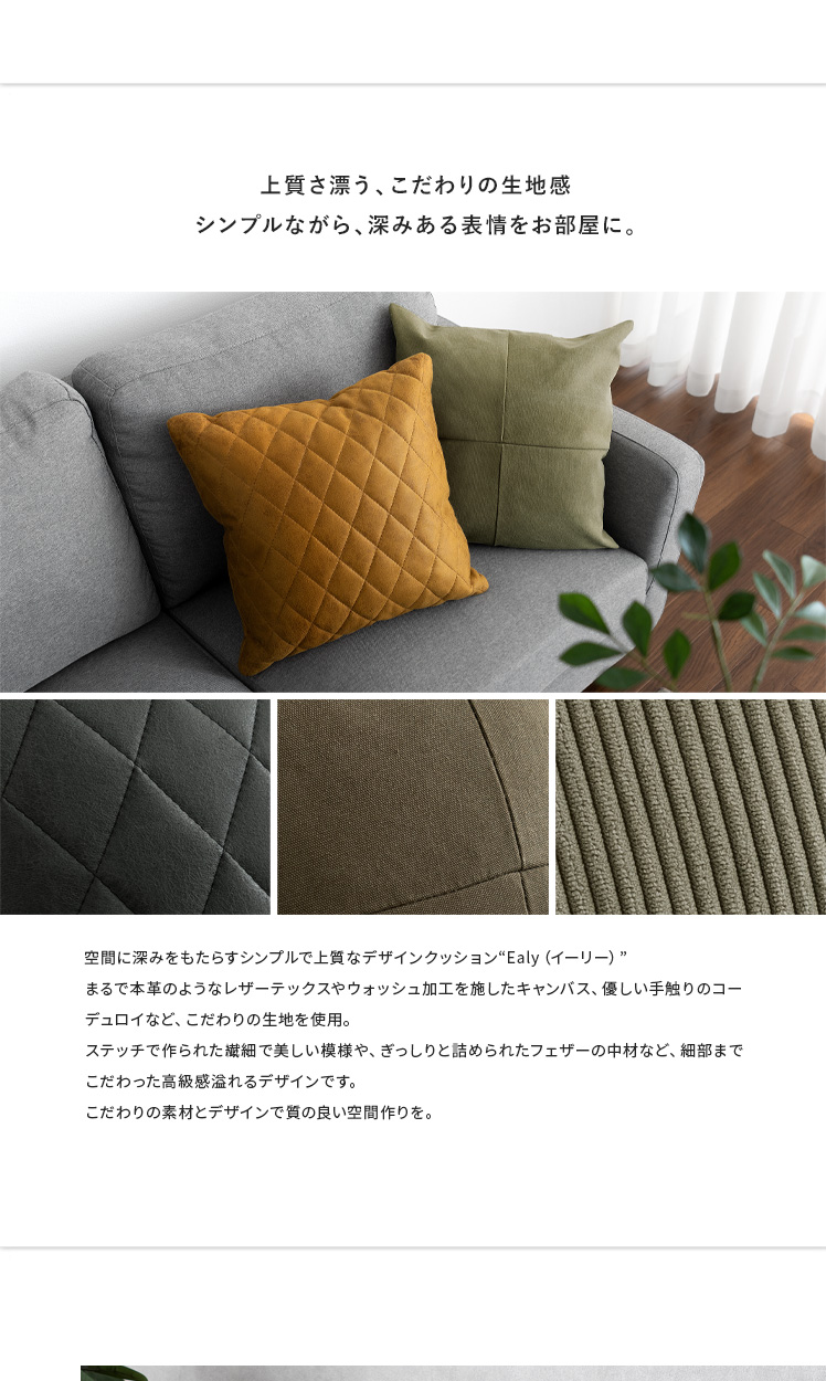 クッション Ealy〔イーリー〕 コーデュロイタイプ/空間に深みをもたらすシンプルで上質なデザインクッション“Ealy(イーリー)”まるで本革のようなレザーテックスやウォッシュ加工を施したキャンバス、優しい手触りのコーデュロイなど、こだわりの生地を使用。ステッチで作られた繊細で美しい模様や、ぎっしりと詰められたフェザーの中材など、細部までこだわった高級感溢れるデザインです。こだわりの素材とデザインで質の良い空間作りを。