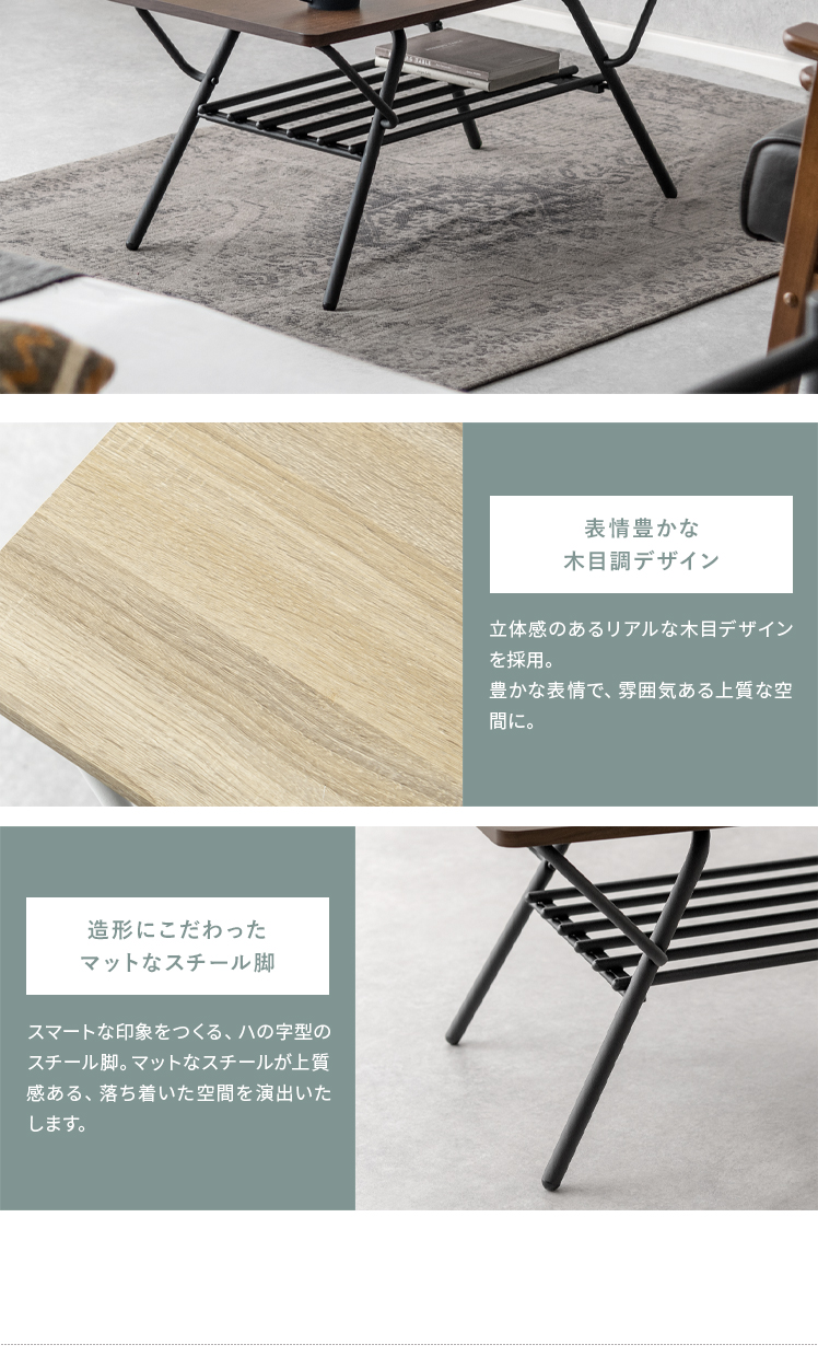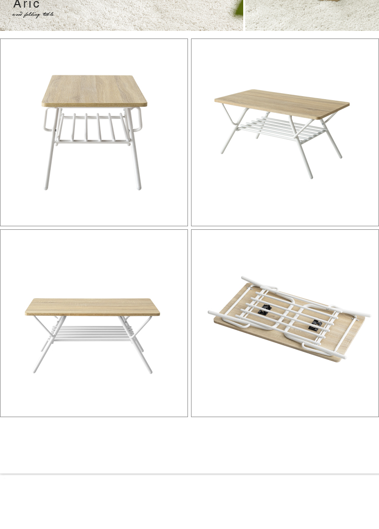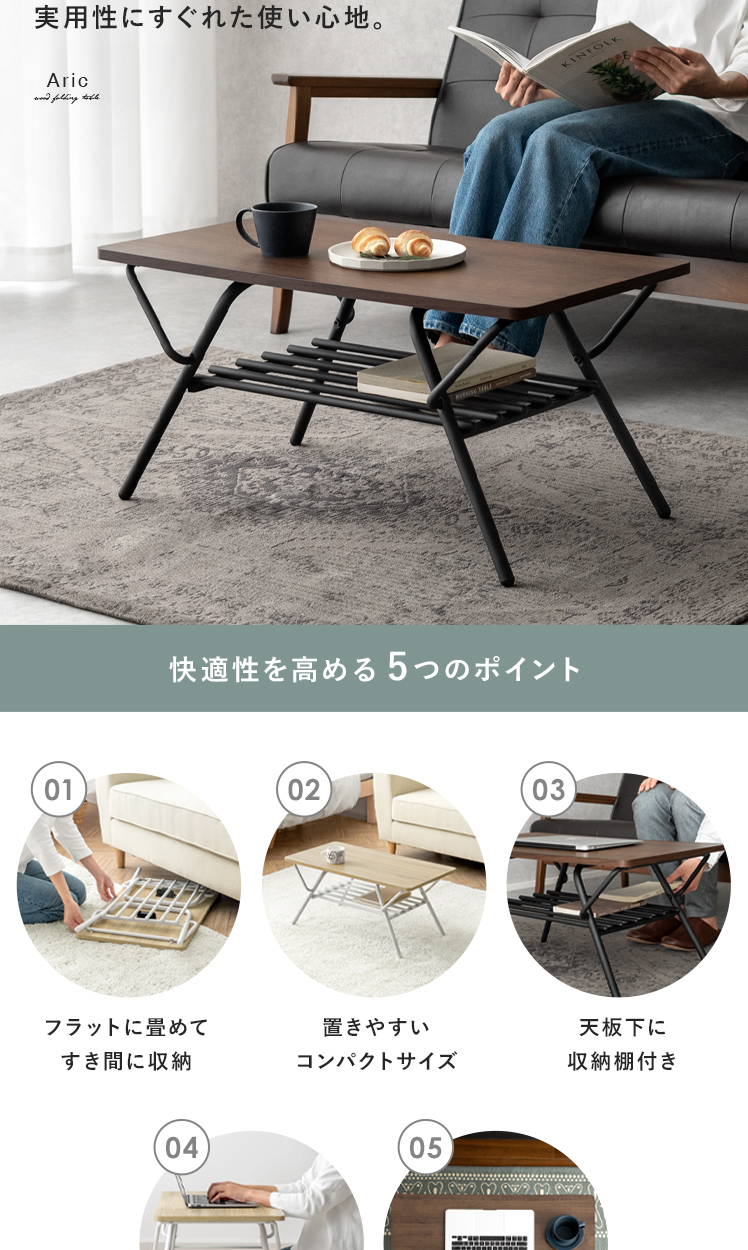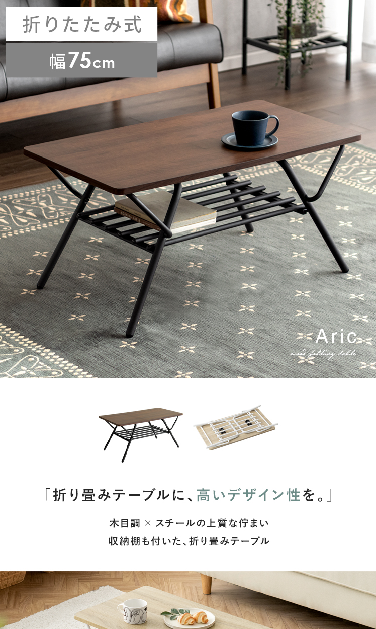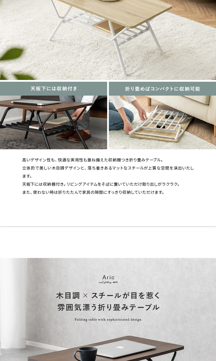 折りたたみ式センターテーブル Aric〔アーク〕/高いデザイン性も、快適な実用性も兼ね備えた収納棚つき折り畳みテーブル。立体的で美しい木目調デザインと、落ち着きあるマットなスチールが上質な空間を演出いたします。天板下には収納棚付き。リビングアイテムをそばに置いていただけ取り出しがラクラク。また、使わない時は折りたたんで家具の隙間にすっきり収納していただけます。