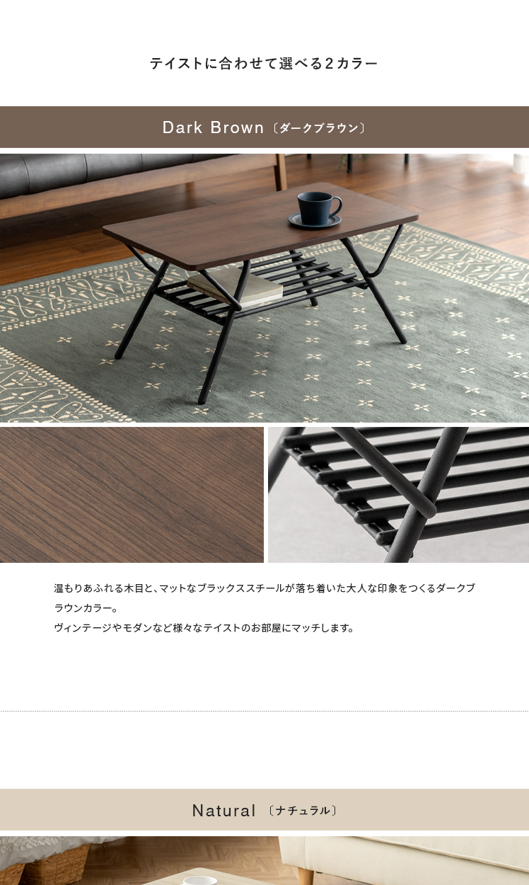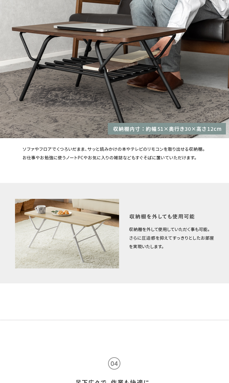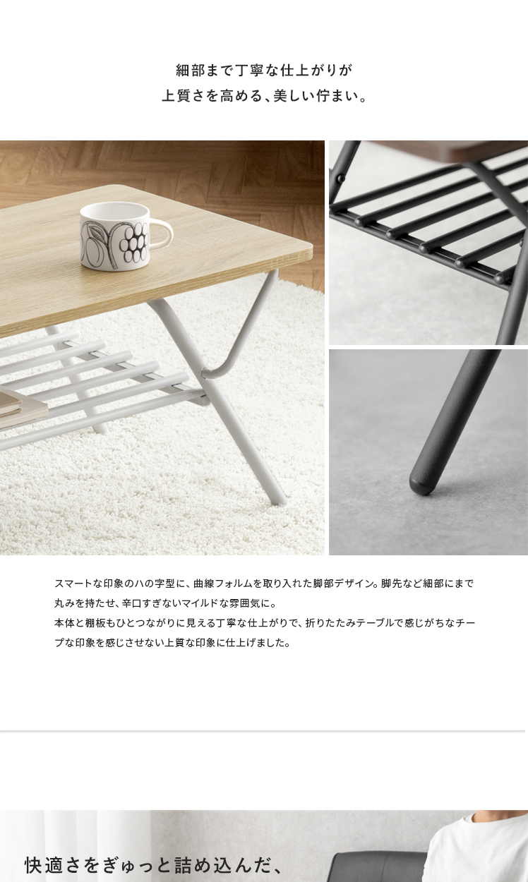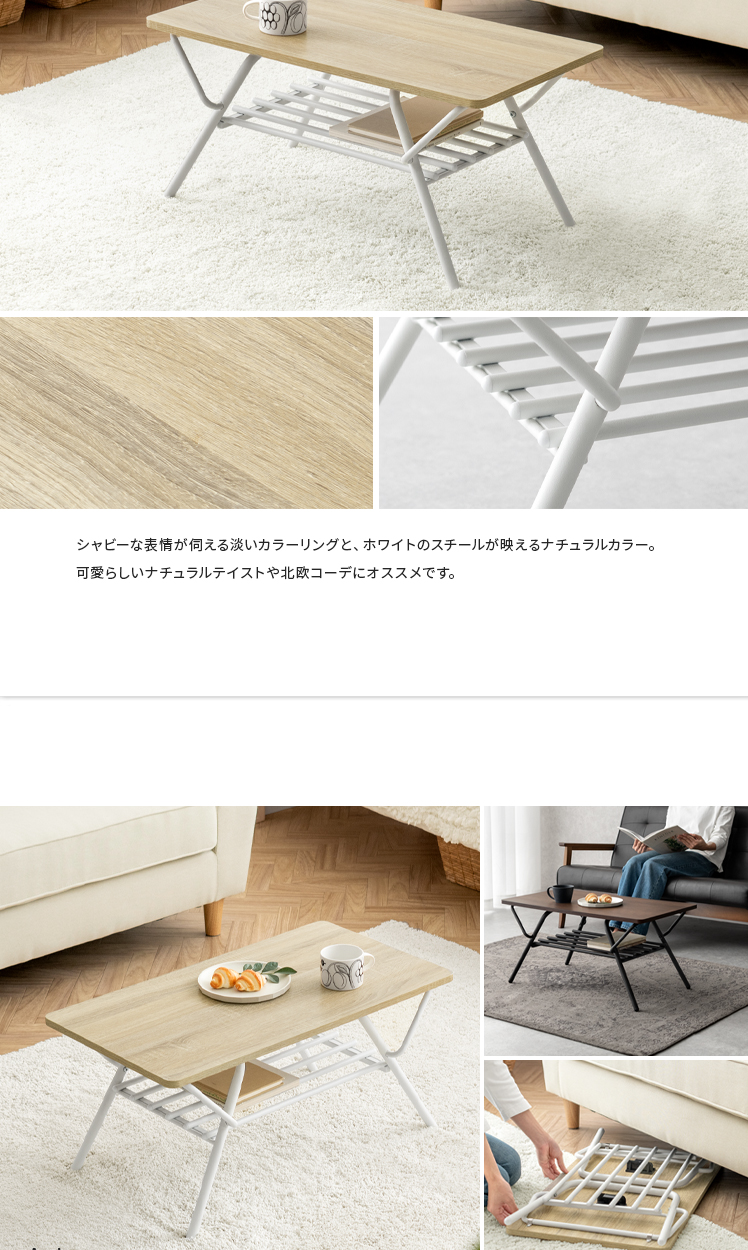 折りたたみ式センターテーブル Aric〔アーク〕/高いデザイン性も、快適な実用性も兼ね備えた収納棚つき折り畳みテーブル。立体的で美しい木目調デザインと、落ち着きあるマットなスチールが上質な空間を演出いたします。天板下には収納棚付き。リビングアイテムをそばに置いていただけ取り出しがラクラク。また、使わない時は折りたたんで家具の隙間にすっきり収納していただけます。