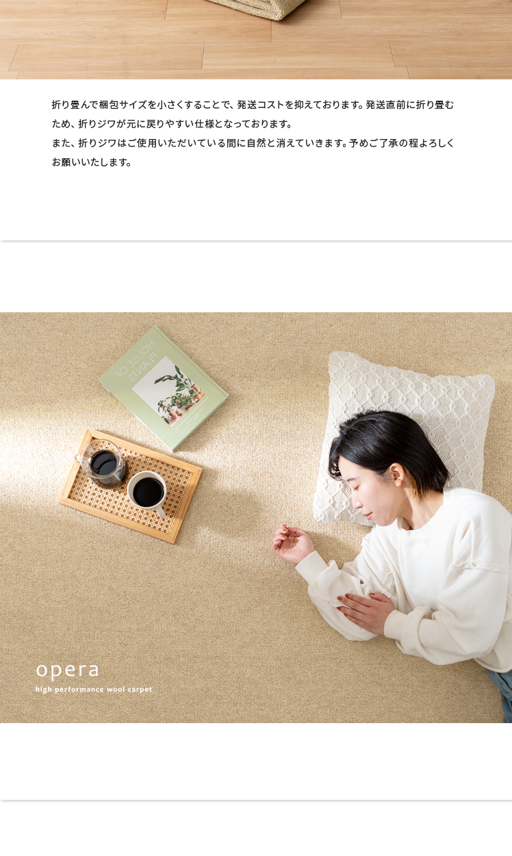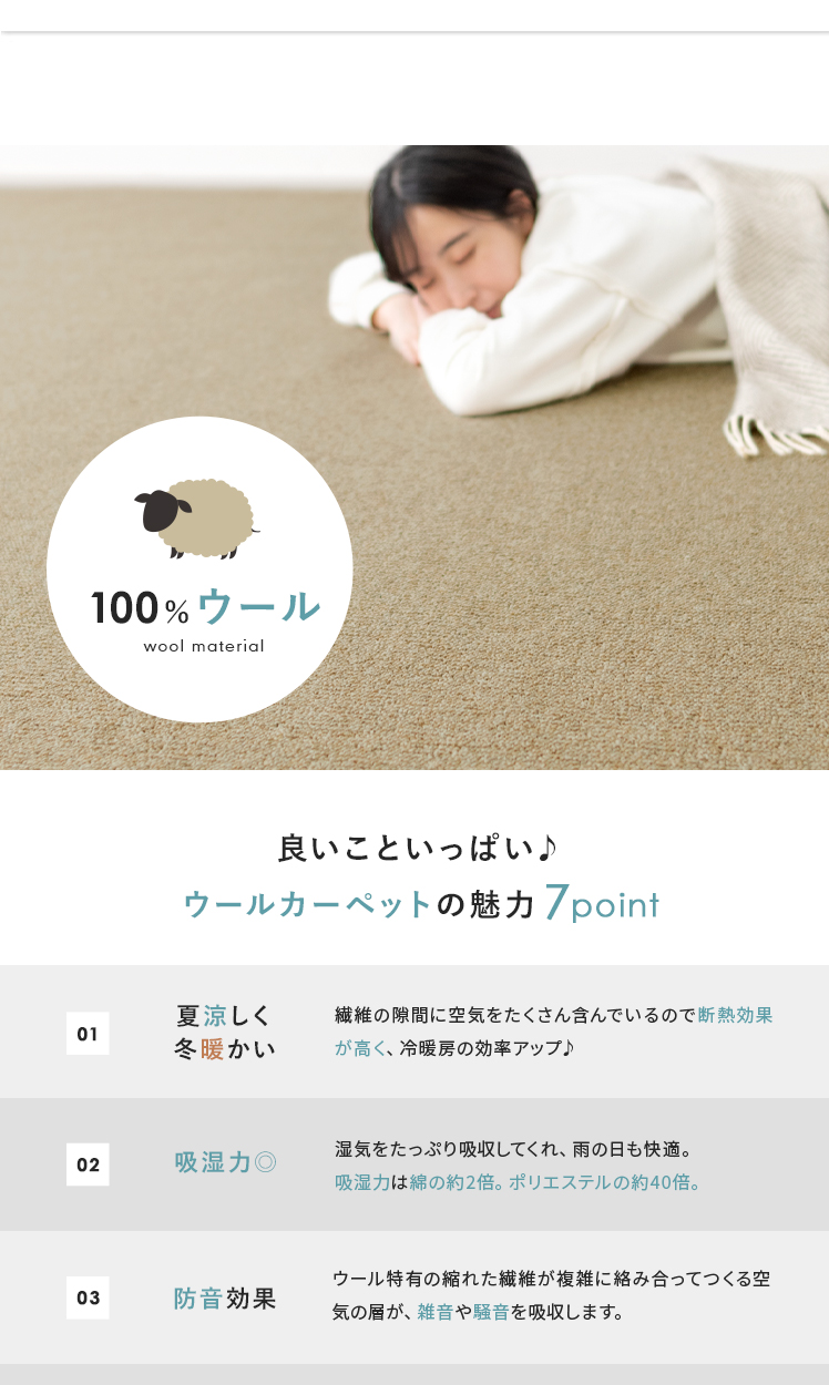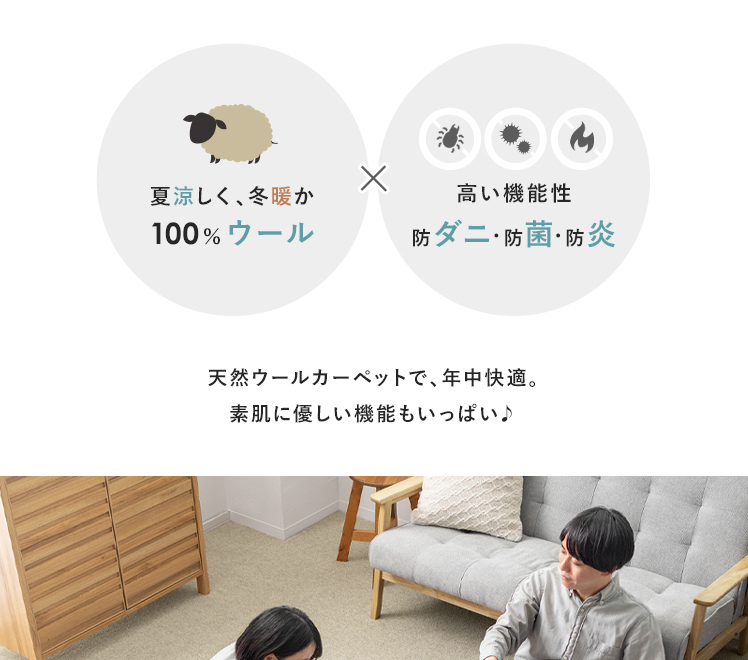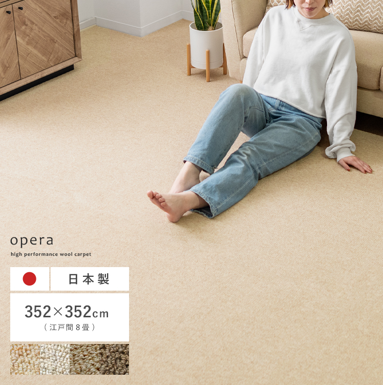 ウール100%敷き詰めカーペット OPERA〔オペラ〕352×352cm/オールシーズン快適に使える、天然ウール100%のカーペット。繊維の隙間にたくさん空気を含むので、断熱効果が高く、冷暖房の効率アップ♪夏はサラッと、冬はあったかく過ごしていただけます。さらに、防ダニ・防菌・防炎加工など、素肌への優しさを第一に考えた、高い機能性に。家族みんなが健やかに暮らせる空間をおつくりいただけます。