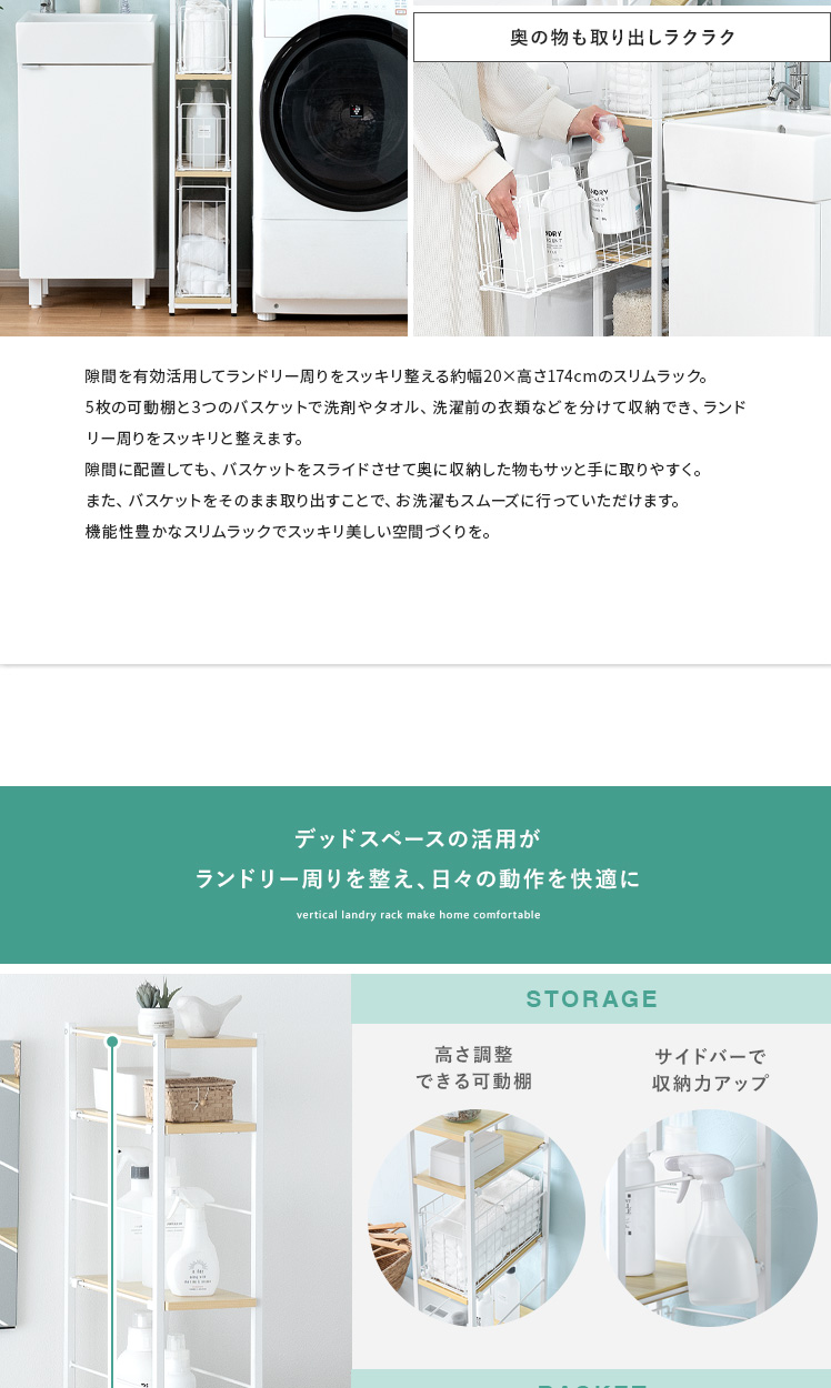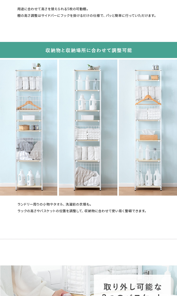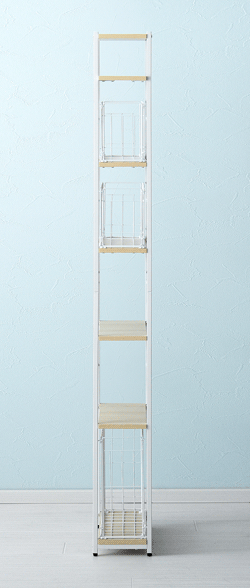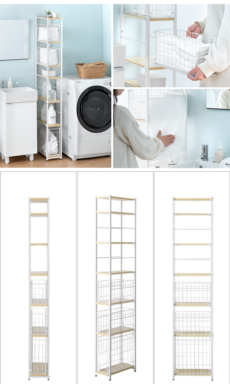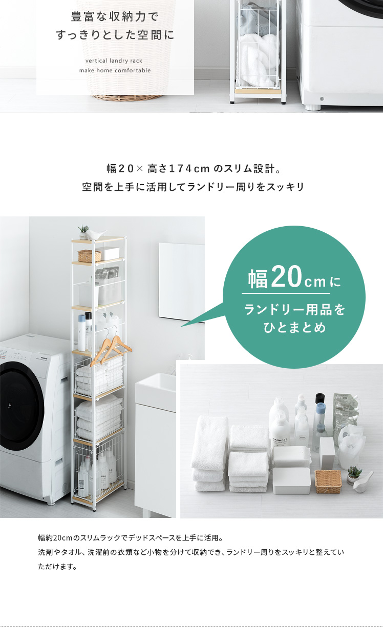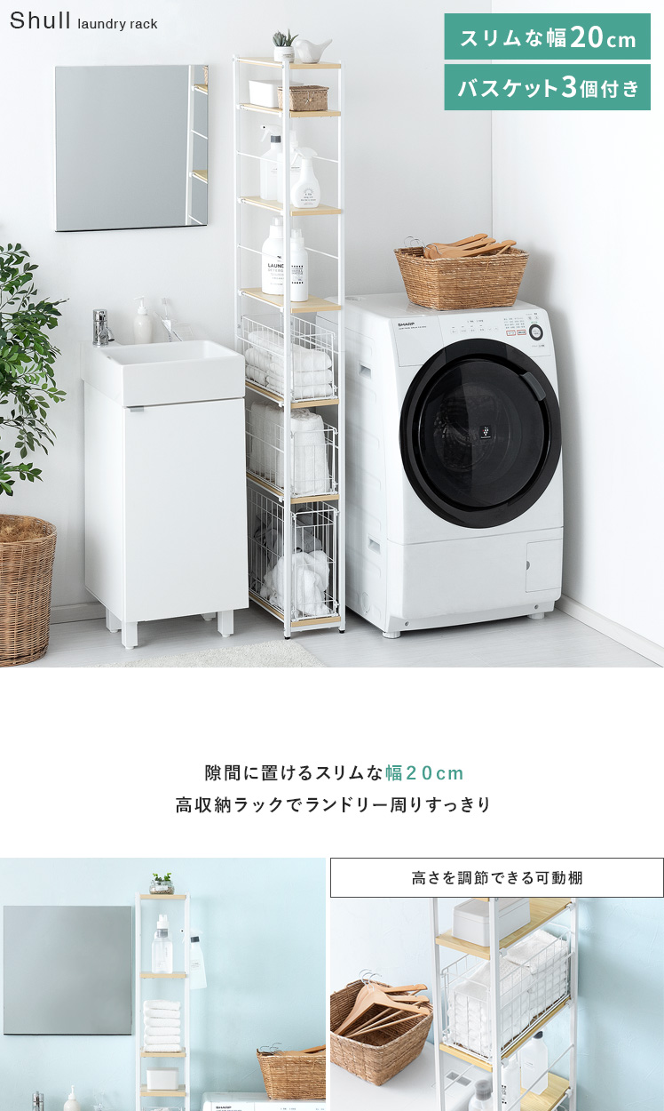 隙間収納ランドリーラック Shull〔シャル〕 /隙間を有効活用してランドリー周りをスッキリ整える約幅20×高さ174cmのスリムラック。5枚の可動棚と3つのバスケットで洗剤やタオル、洗濯前の衣類などを分けて収納でき、ランドリー周りをスッキリと整えます。隙間に配置しても、バスケットをスライドさせて奥に収納した物もサッと手に取りやすく。また、バスケットをそのまま取り出すことで、お洗濯もスムーズに行っていただけます。機能性豊かなスリムラックでスッキリ美しい空間づくりを。