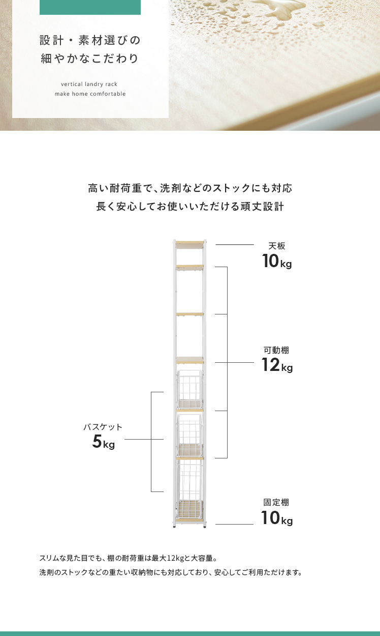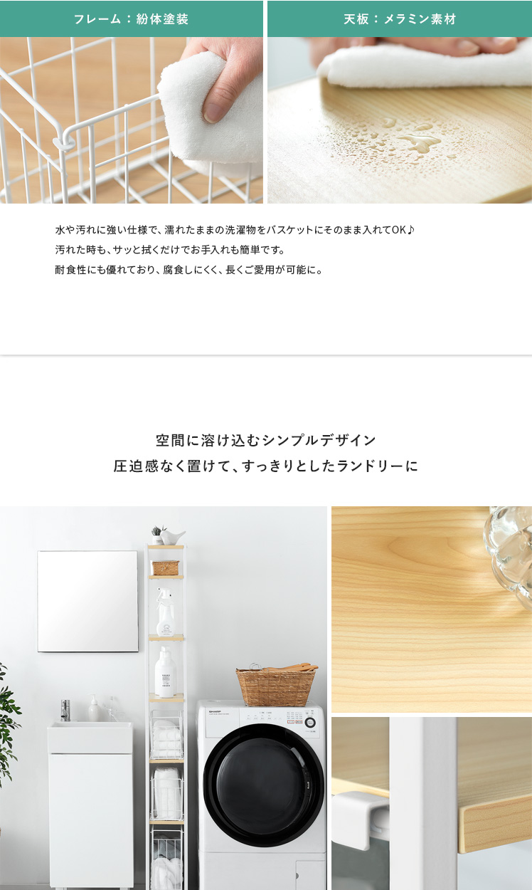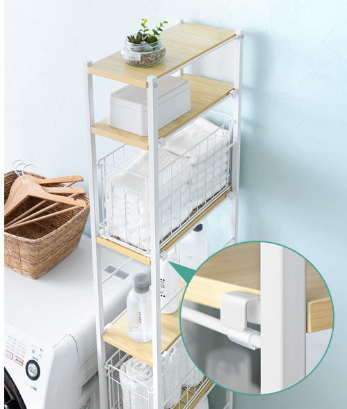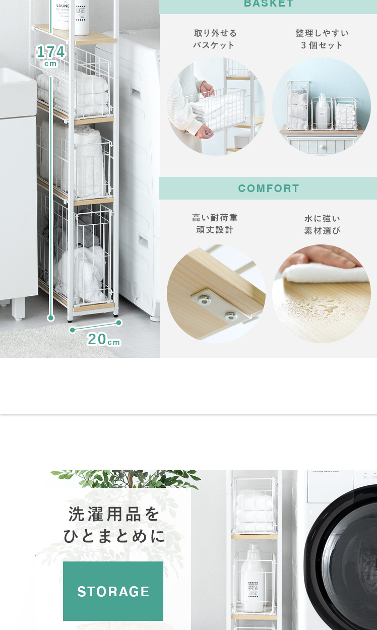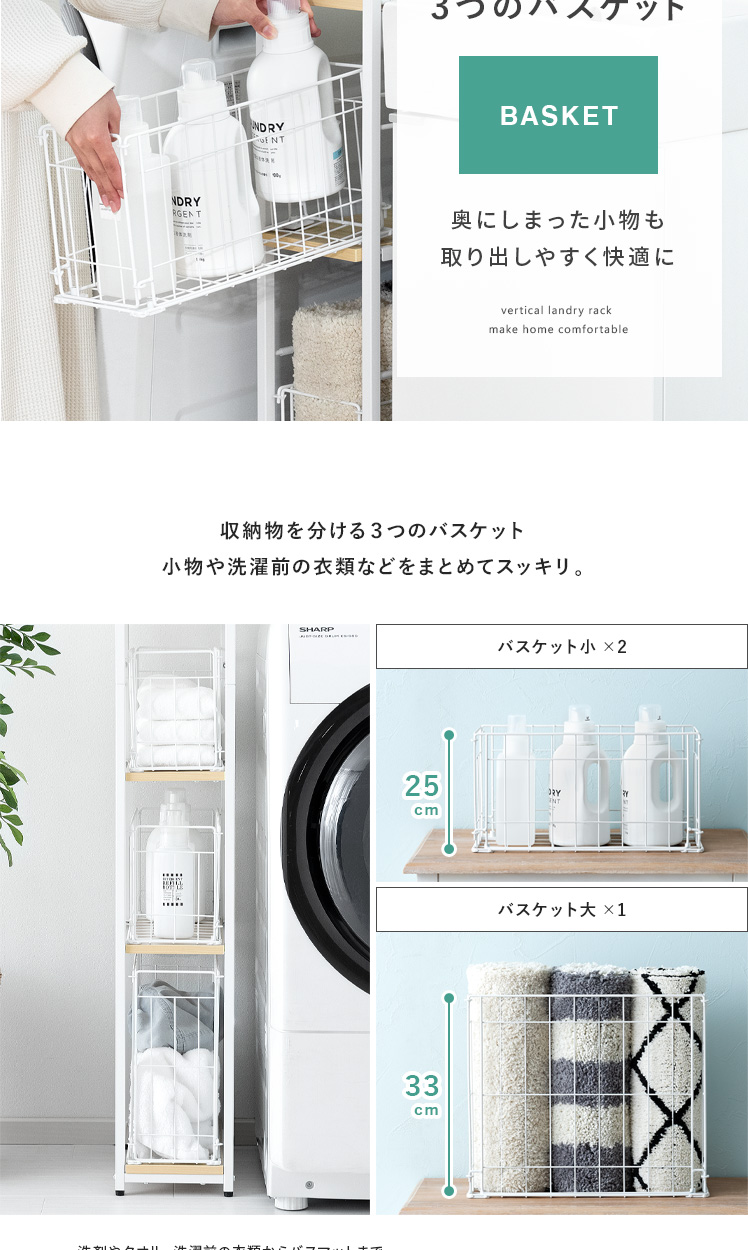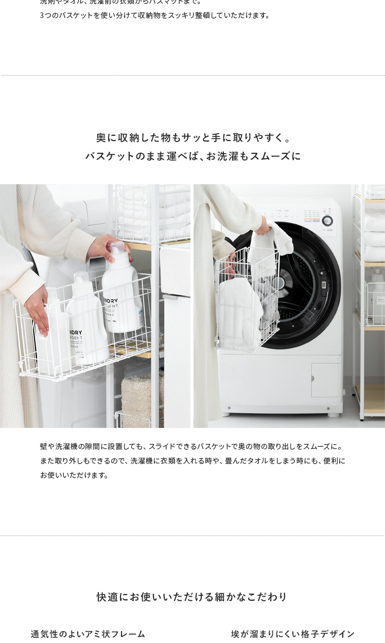 隙間収納ランドリーラック Shull〔シャル〕 /隙間を有効活用してランドリー周りをスッキリ整える約幅20×高さ174cmのスリムラック。5枚の可動棚と3つのバスケットで洗剤やタオル、洗濯前の衣類などを分けて収納でき、ランドリー周りをスッキリと整えます。隙間に配置しても、バスケットをスライドさせて奥に収納した物もサッと手に取りやすく。また、バスケットをそのまま取り出すことで、お洗濯もスムーズに行っていただけます。機能性豊かなスリムラックでスッキリ美しい空間づくりを。