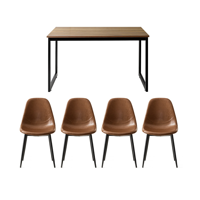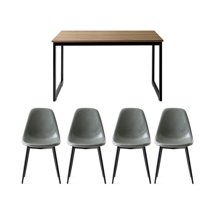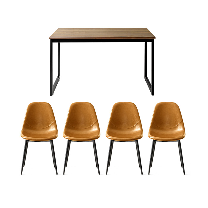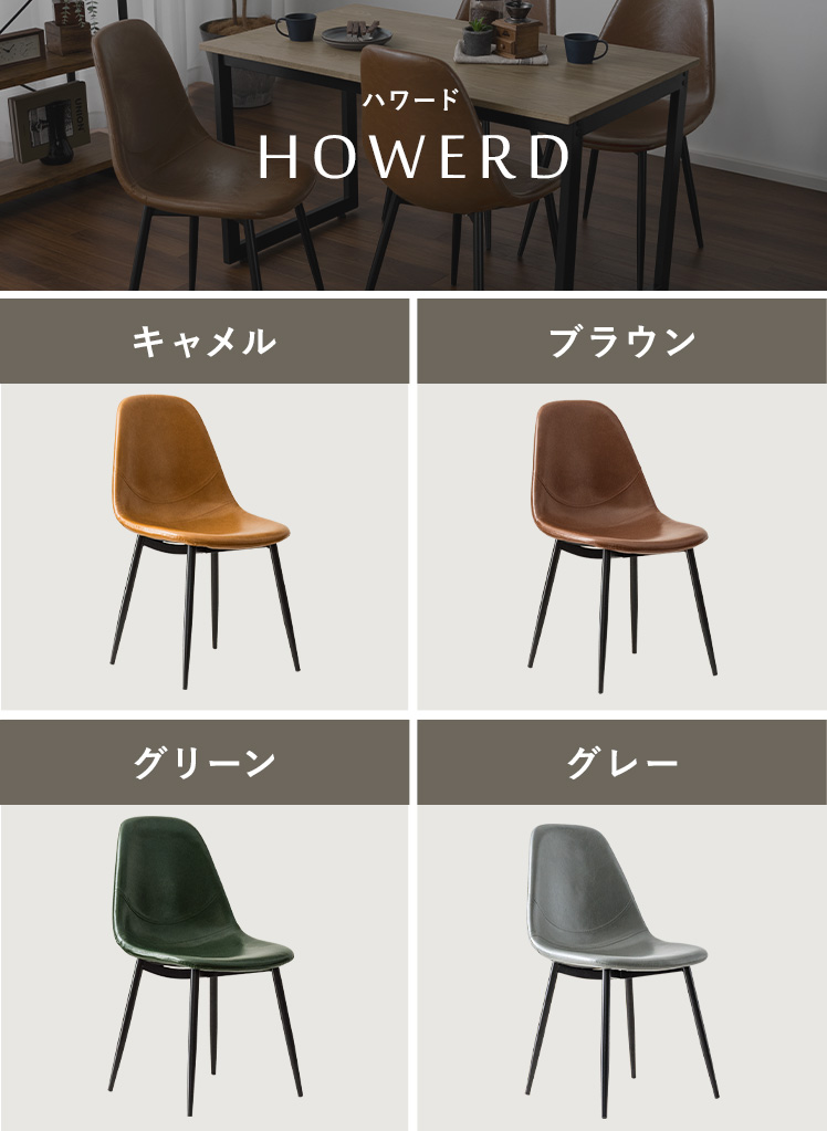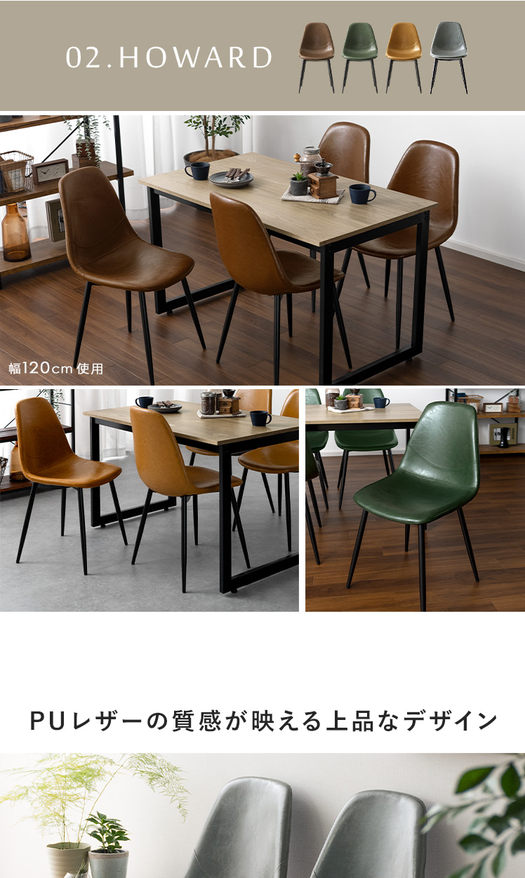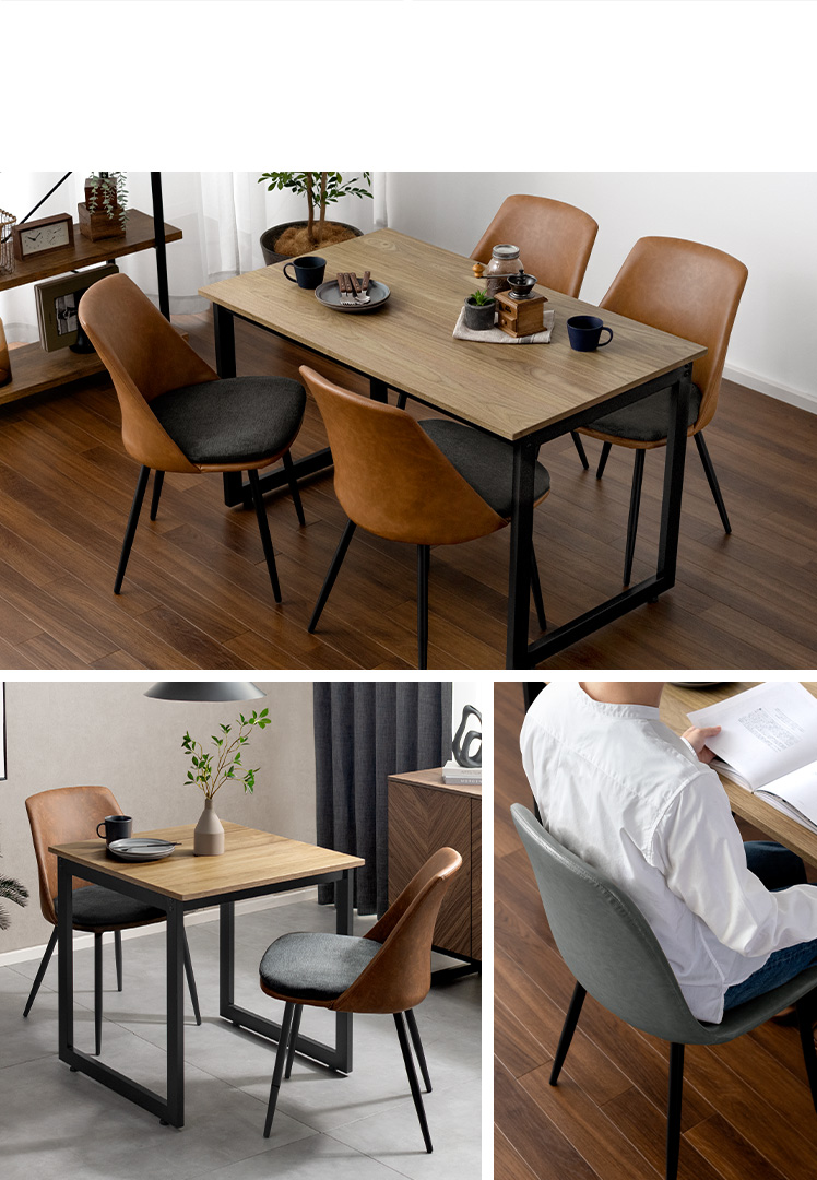 HOWARD CHAIR 〔ハワードチェア〕・ダイニングテーブル Velde〔ヴェルデ〕 5点セット/高級木材ウォルナットの突板を使ったテーブルと、ツートンデザインが目を惹くチェアで、ダイニングをカフェのような空間に。天然木が醸し出す質の良さだけでなく、PUレザーや重厚なスチールといった、異素材の調和がよりインダストリアルな雰囲気をつくり出してくれます。もちろん、「居心地の良さ」にもこだわりました。チェアは、ふんわり座面×身体にフィットするフォルムで、ずっと座っていたくなる心地よさに仕上げました。