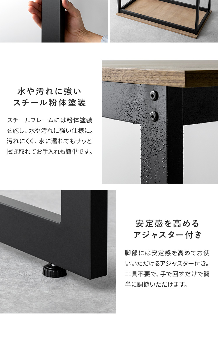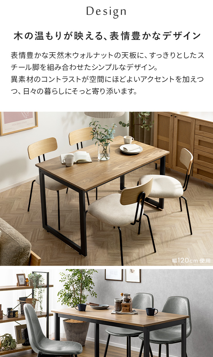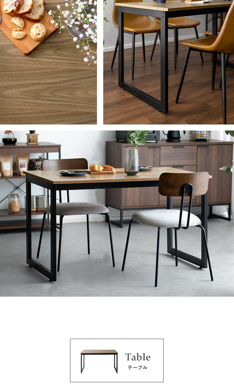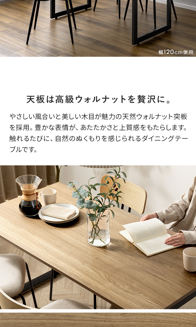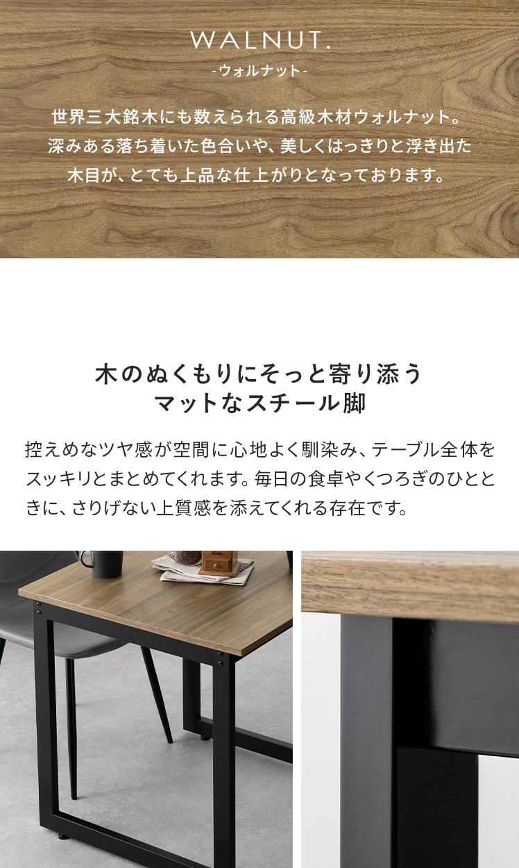 | テーブル材質 | 天然木化粧繊維板(ウォルナット突板)、スチール(粉体塗装) |