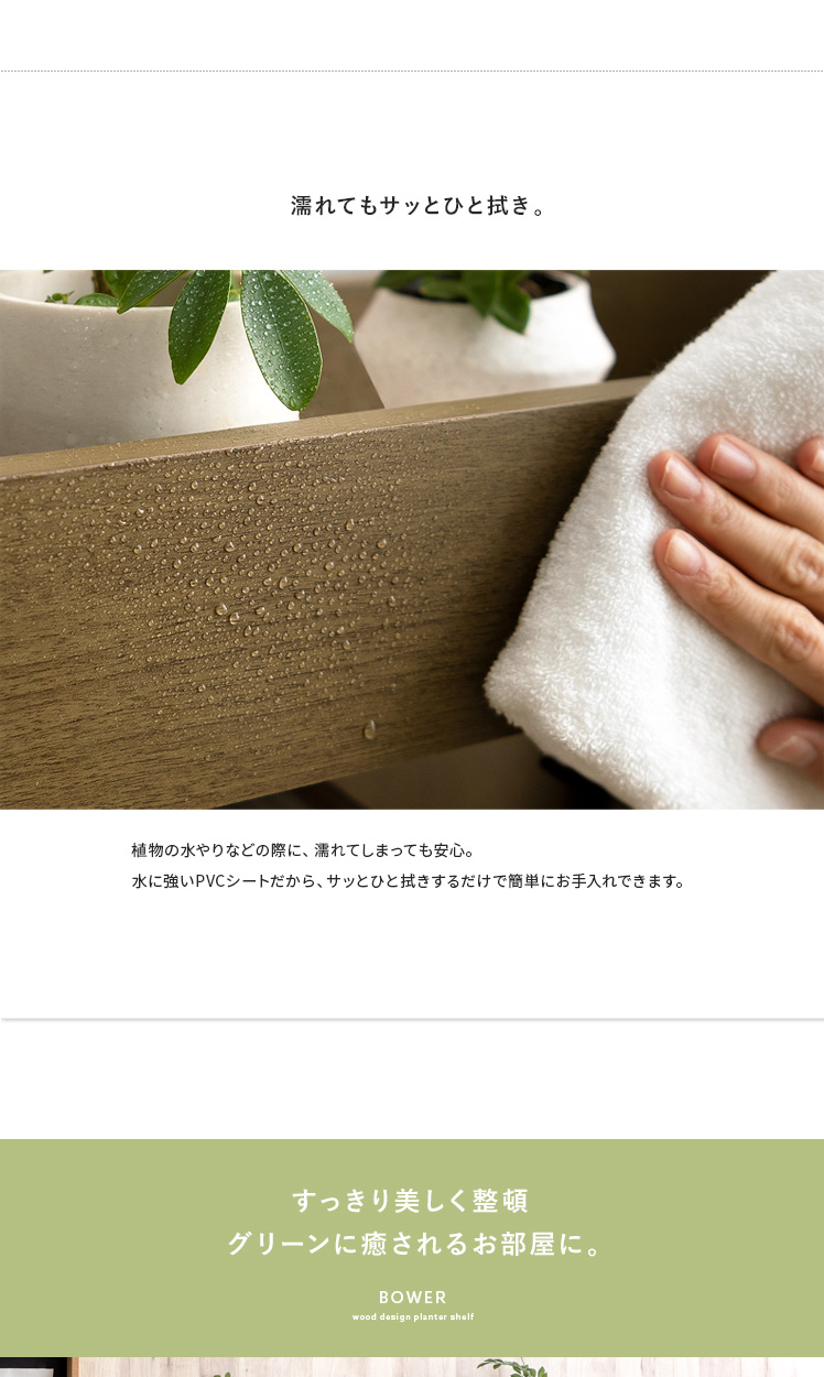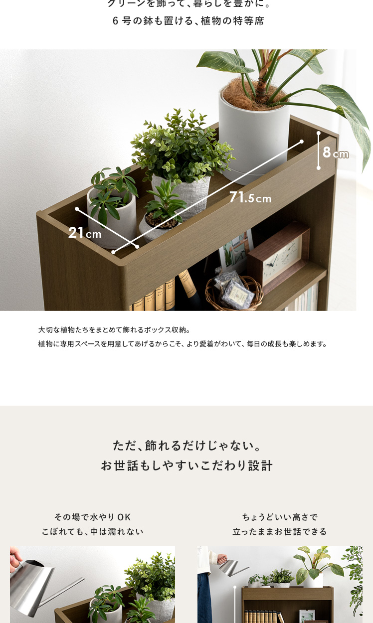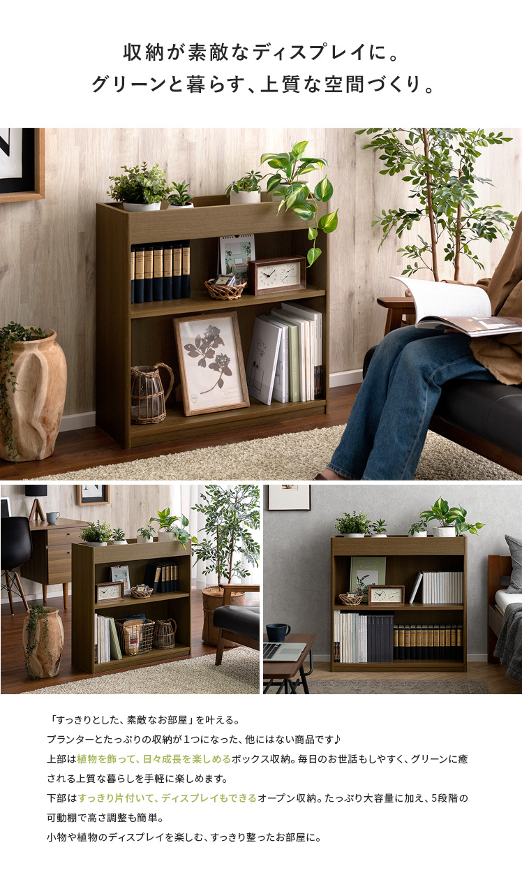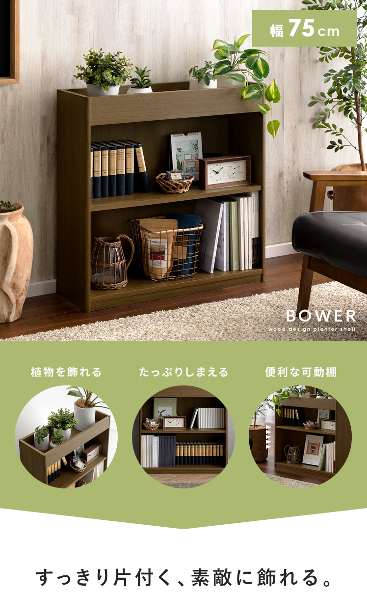 プランターシェルフ BOWER〔バウアー〕/「すっきりとした、素敵なお部屋」を叶える。プランターとたっぷりの収納が1つになった、他にはない商品です♪上部は植物を飾って、日々成長を楽しめるボックス収納。毎日のお世話もしやすく、グリーンに癒される上質な暮らしを手軽に楽しめます。下部はすっきり片付いて、ディスプレイもできるオープン収納。たっぷり大容量に加え、5段階の可動棚で高さ調整も簡単。小物や植物のディスプレイを楽しむ、すっきり整ったお部屋に。