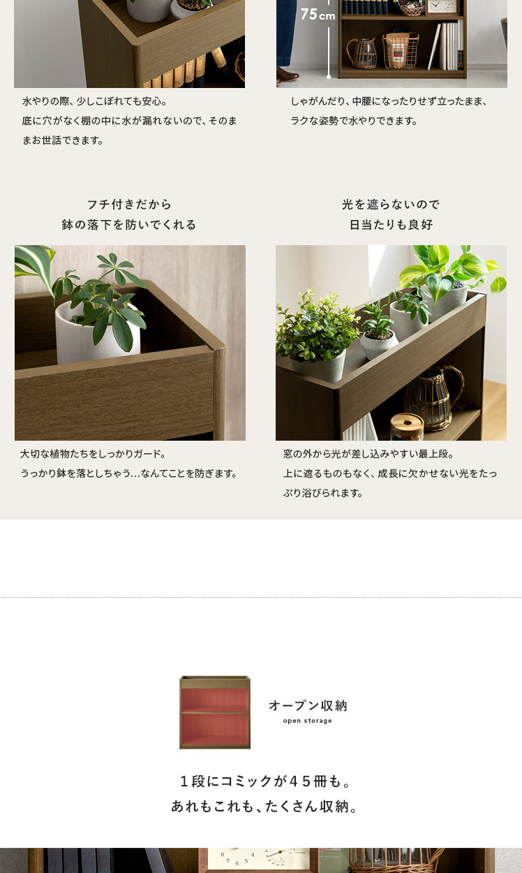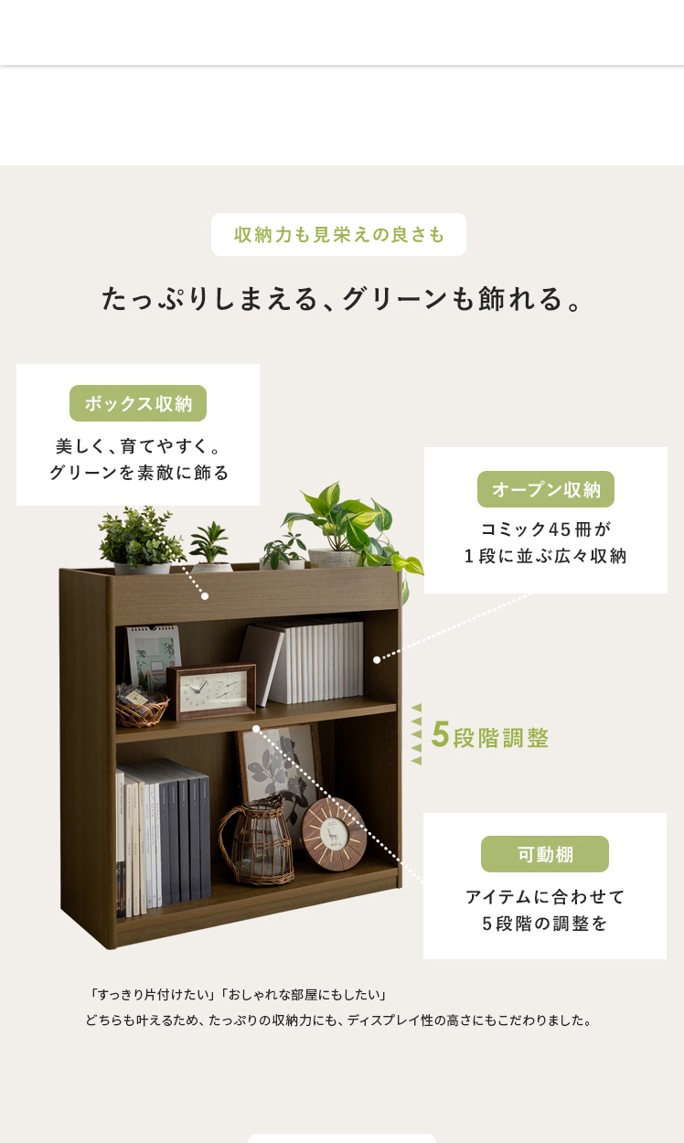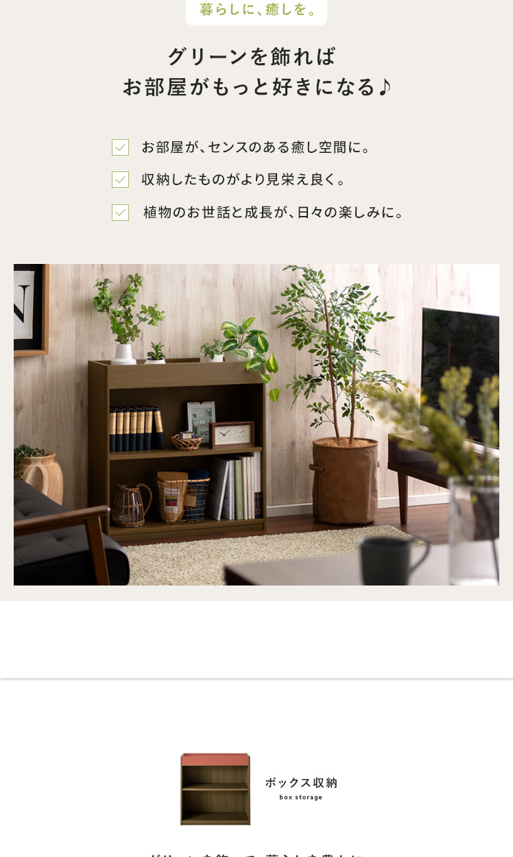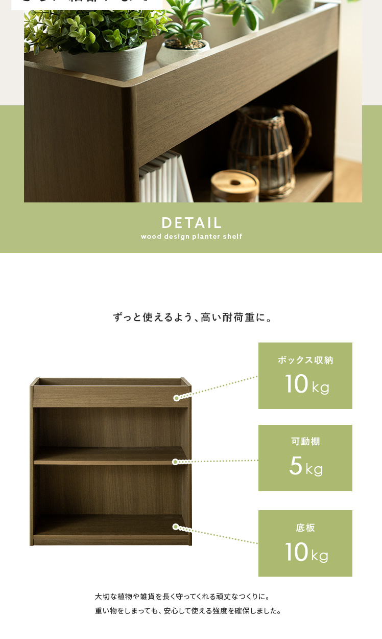 プランターシェルフ BOWER〔バウアー〕/「すっきりとした、素敵なお部屋」を叶える。プランターとたっぷりの収納が1つになった、他にはない商品です♪上部は植物を飾って、日々成長を楽しめるボックス収納。毎日のお世話もしやすく、グリーンに癒される上質な暮らしを手軽に楽しめます。下部はすっきり片付いて、ディスプレイもできるオープン収納。たっぷり大容量に加え、5段階の可動棚で高さ調整も簡単。小物や植物のディスプレイを楽しむ、すっきり整ったお部屋に。