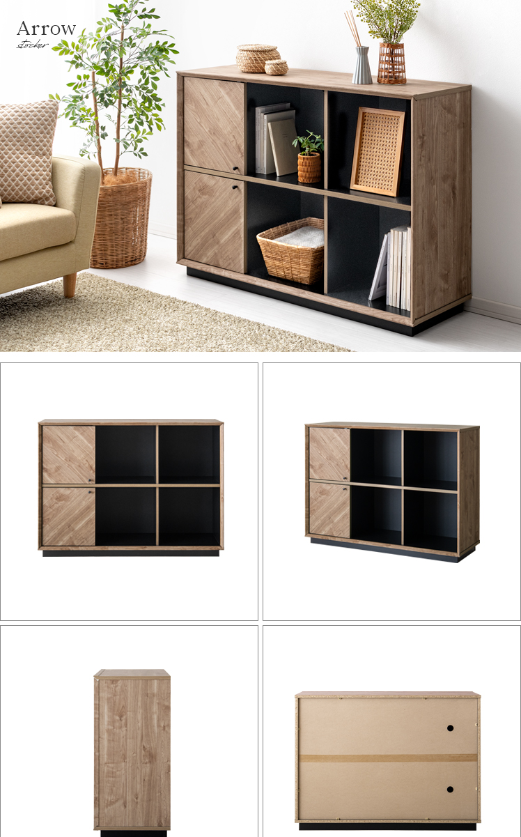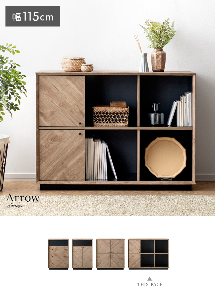ヘリンボーンストッカー ARROW〔アロー〕 幅115cm/褒められるオシャレな空間をつくる、大容量のストッカー。お部屋を彩るヘリンボーン調デザインと全体の印象を引き締めるブラックカラーの組み合わせが上質な空間を演出。飾るようにしまえるオープン収納と生活用品を隠しながら収納できる扉収納で、すっきり美しいお部屋に。デザイン性だけでなく高い収納力を兼ね備えたストッカーでお部屋をすっきりさせながらワンランク上の空間を。