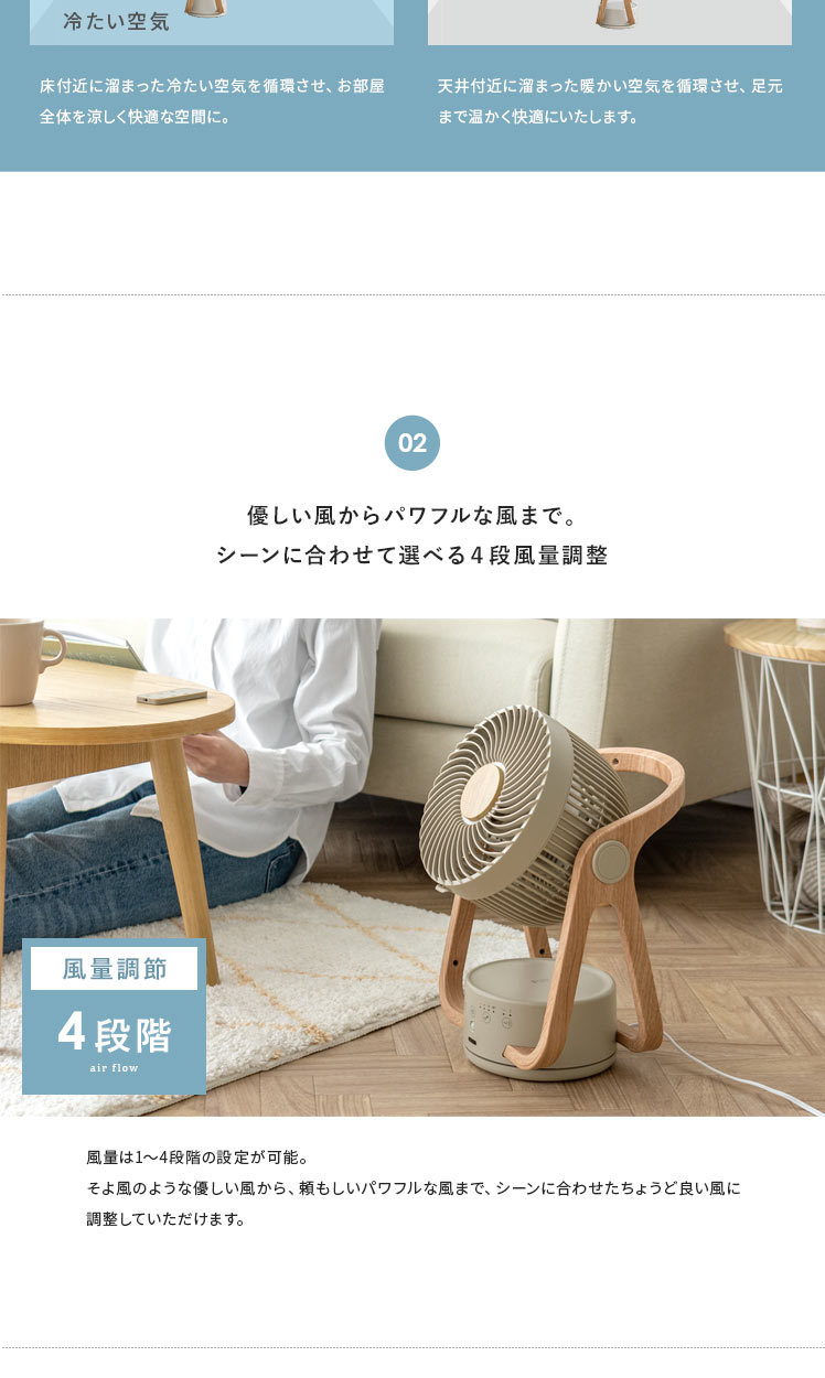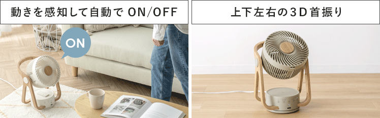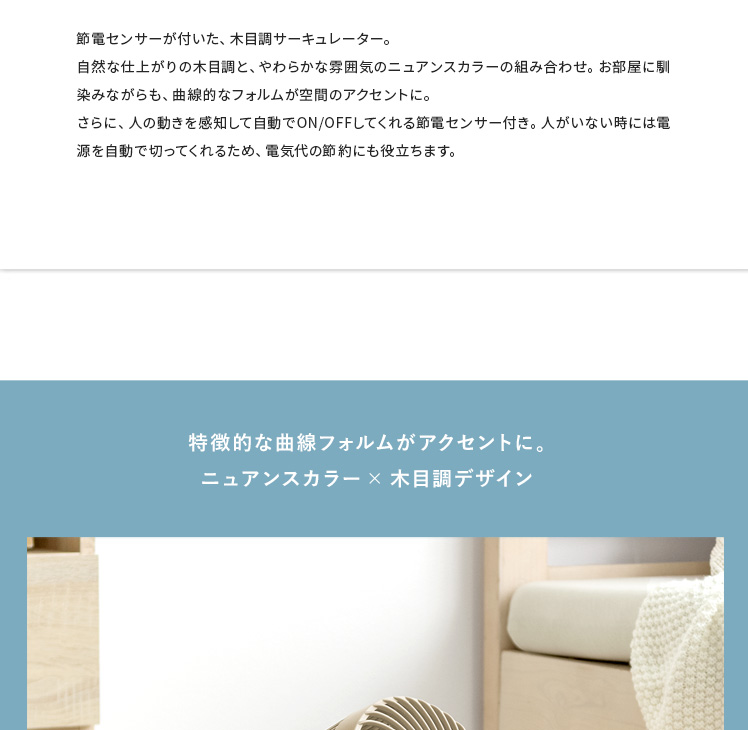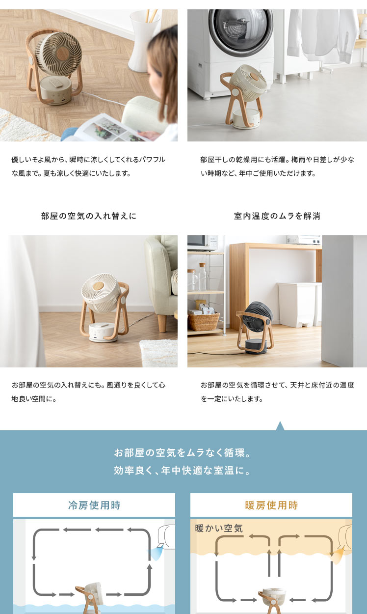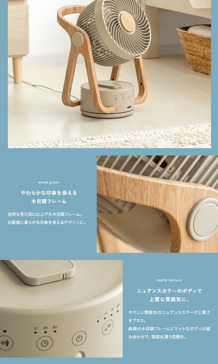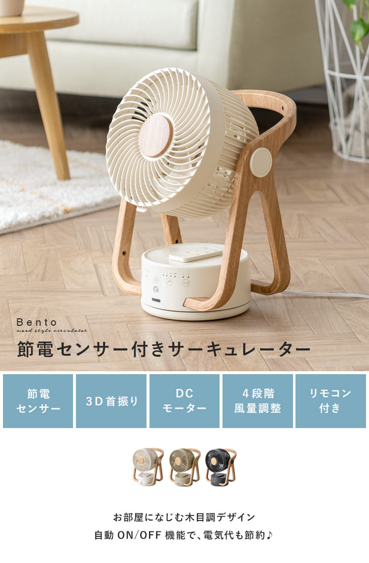 ウッドスタイルサーキュレーターBento〔ベント〕/節電センサーが付いた、木目調サーキュレーター。自然な仕上がりの木目調と、やわらかな雰囲気のニュアンスカラーの組み合わせ。お部屋に馴染みながらも、曲線的なフォルムが空間のアクセントに。さらに、人の動きを感知して自動でON/OFFしてくれる節電センサー付き。人がいない時には電源を自動で切ってくれるため、電気代の節約にも役立ちます。