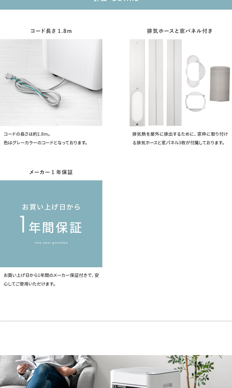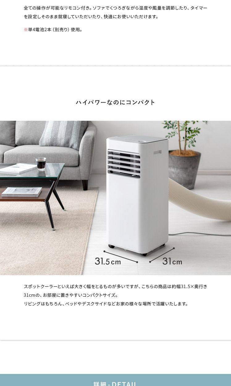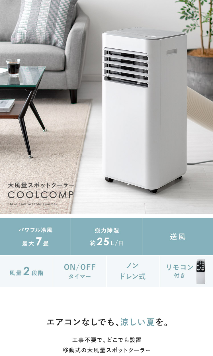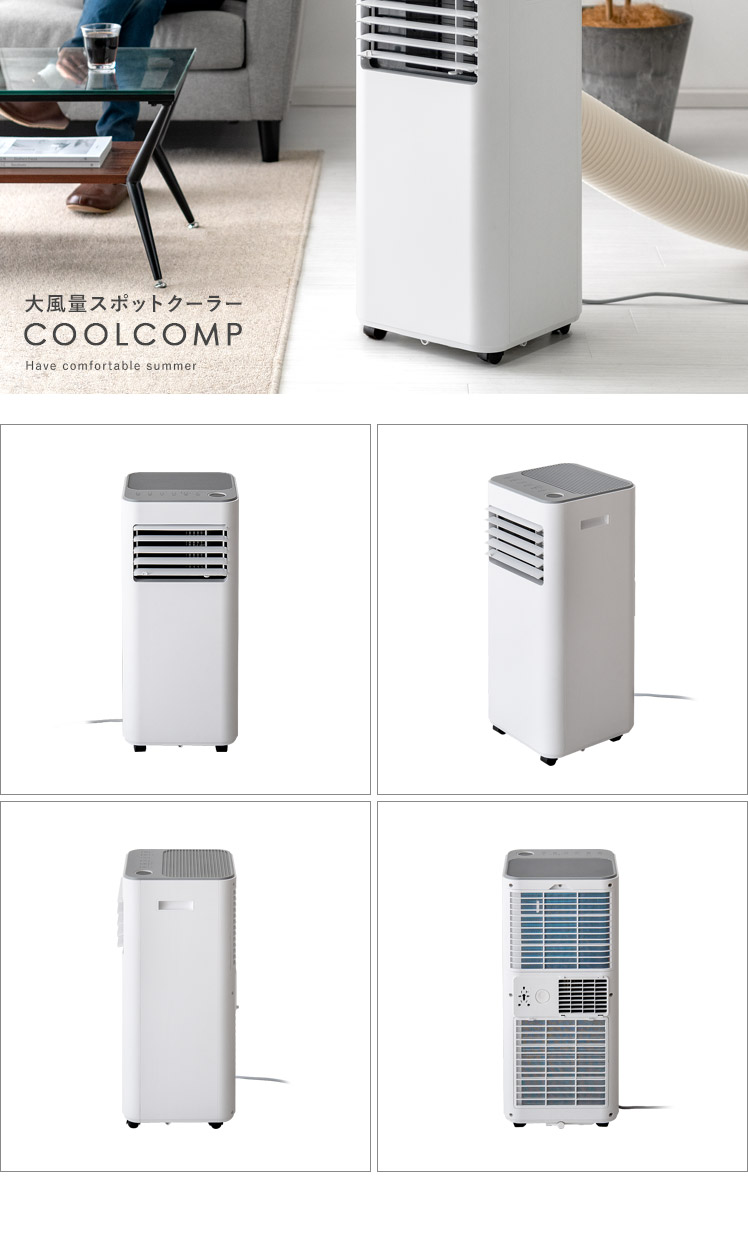 大風量スポットクーラー COOLCOMP〔クールコンプ〕/工事不要の移動式スポットクーラー。エアコンと同じ熱交換式を採用し、一般的なクーラーにも負けないパワフルな冷風を実現。これ1台でお部屋を涼しく快適にしていただけます。キャスター付きで移動もしやすいため、キッチンやガレージなど熱のこもりがちな場所に運んで使うのもオススメです。