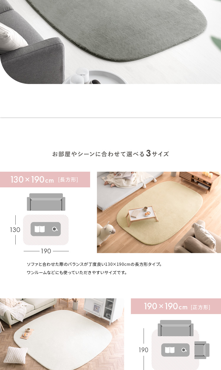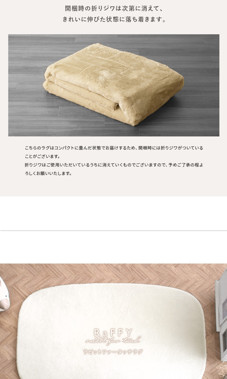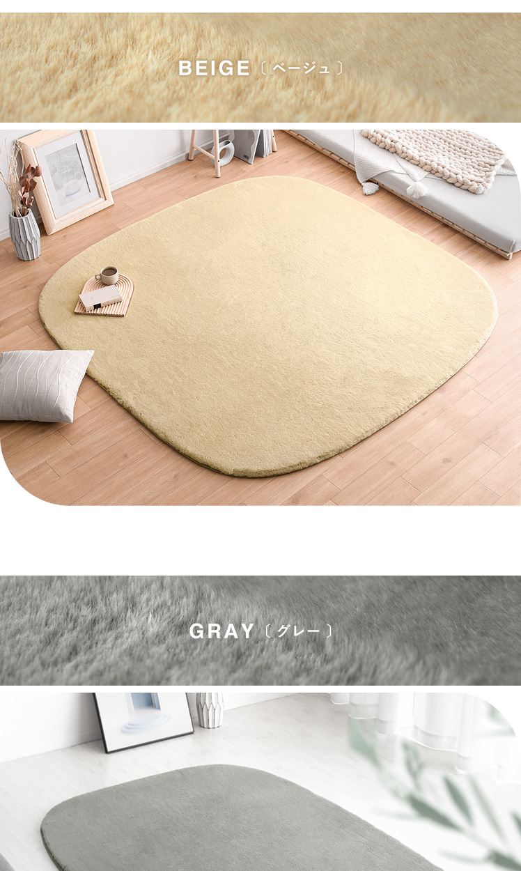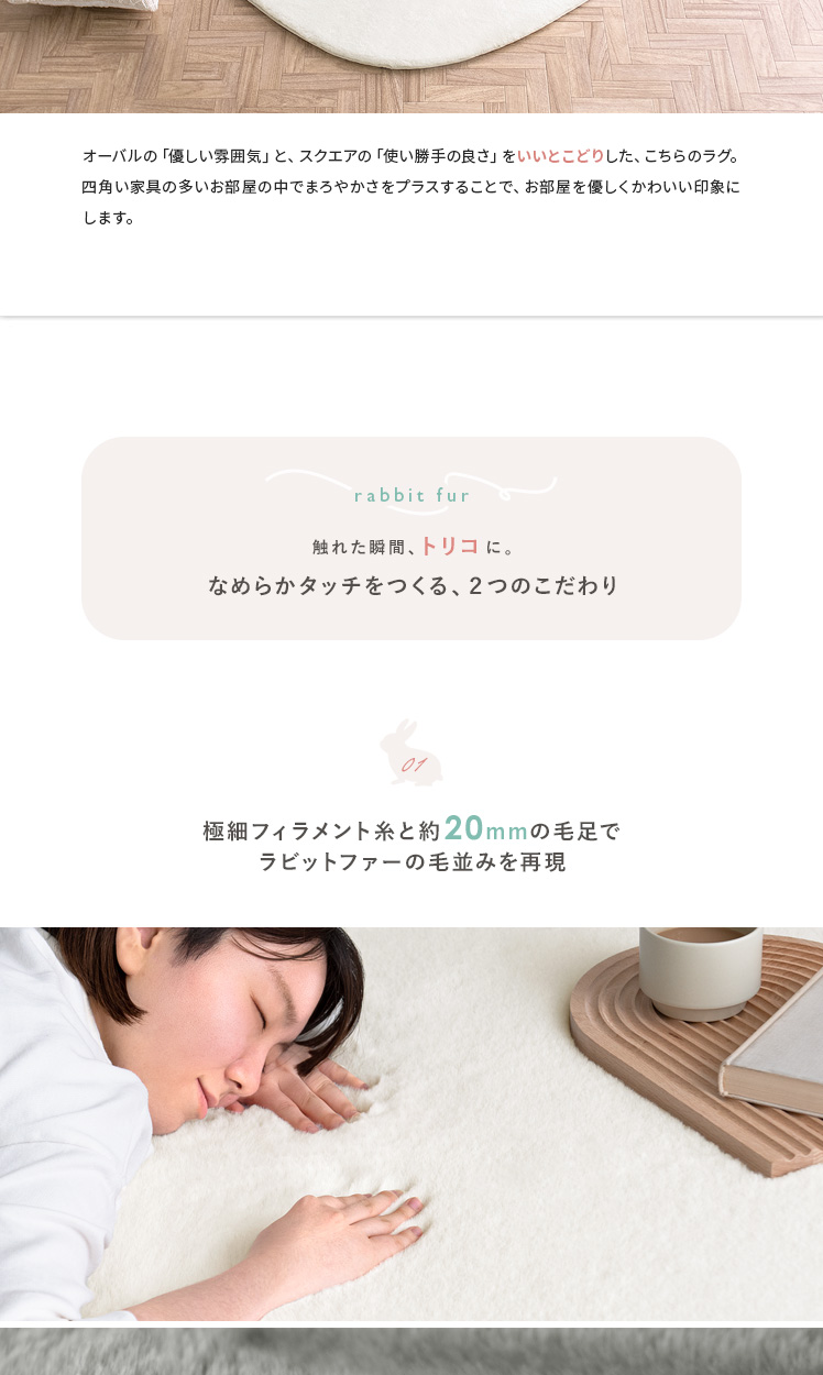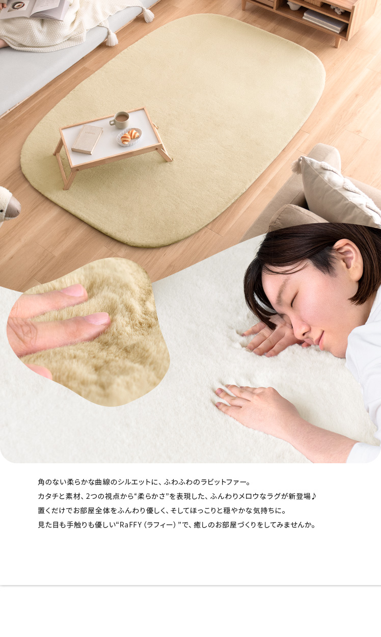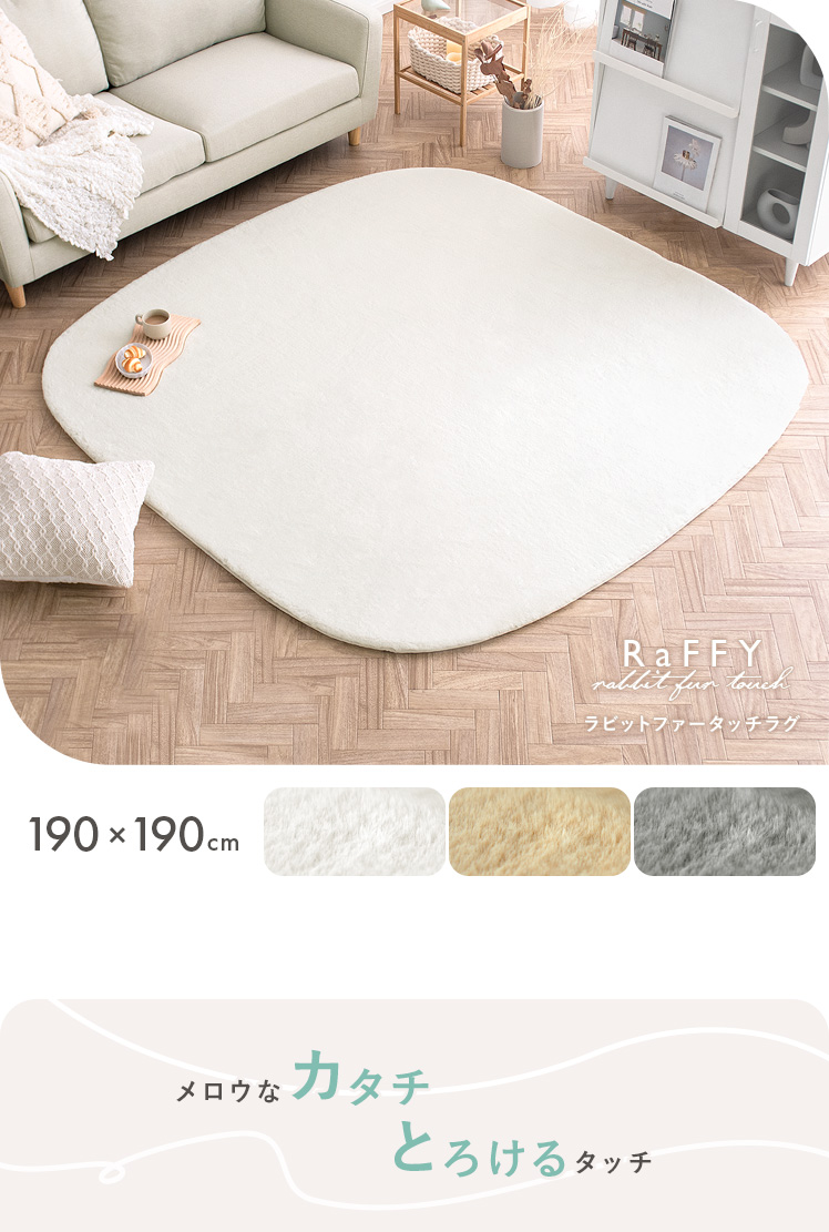ラビットファータッチラグRaFFY〔ラフィー〕 190×190cm/角のない柔らかな曲線のシルエットに、ふわふわのラビットファー。カタチと素材、2つの視点から“柔らかさ”を表現した、ふんわりメロウなラグが新登場♪置くだけでお部屋全体をふんわり優しく、そしてほっこりと穏やかな気持ちに。見た目も手触りも優しい“RaFFY(ラフィー)”で、癒しのお部屋づくりをしてみませんか。